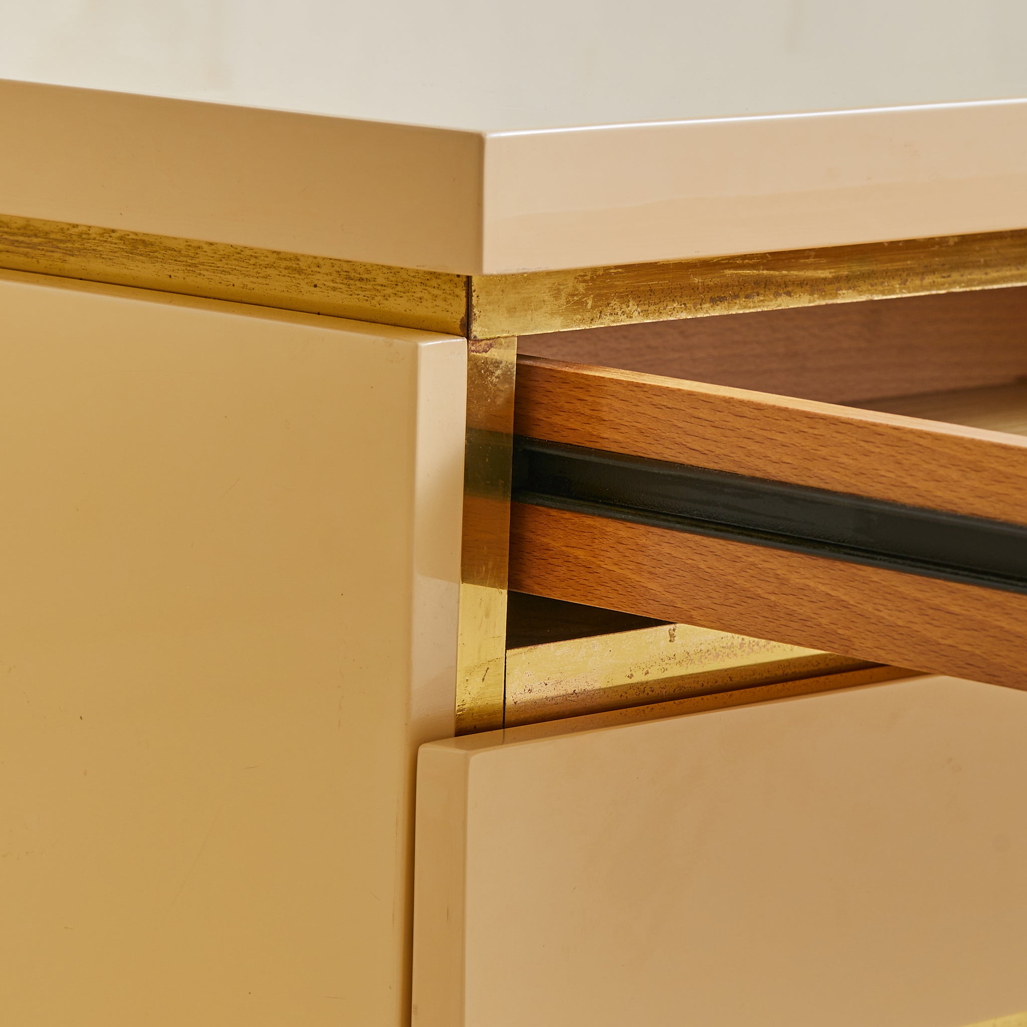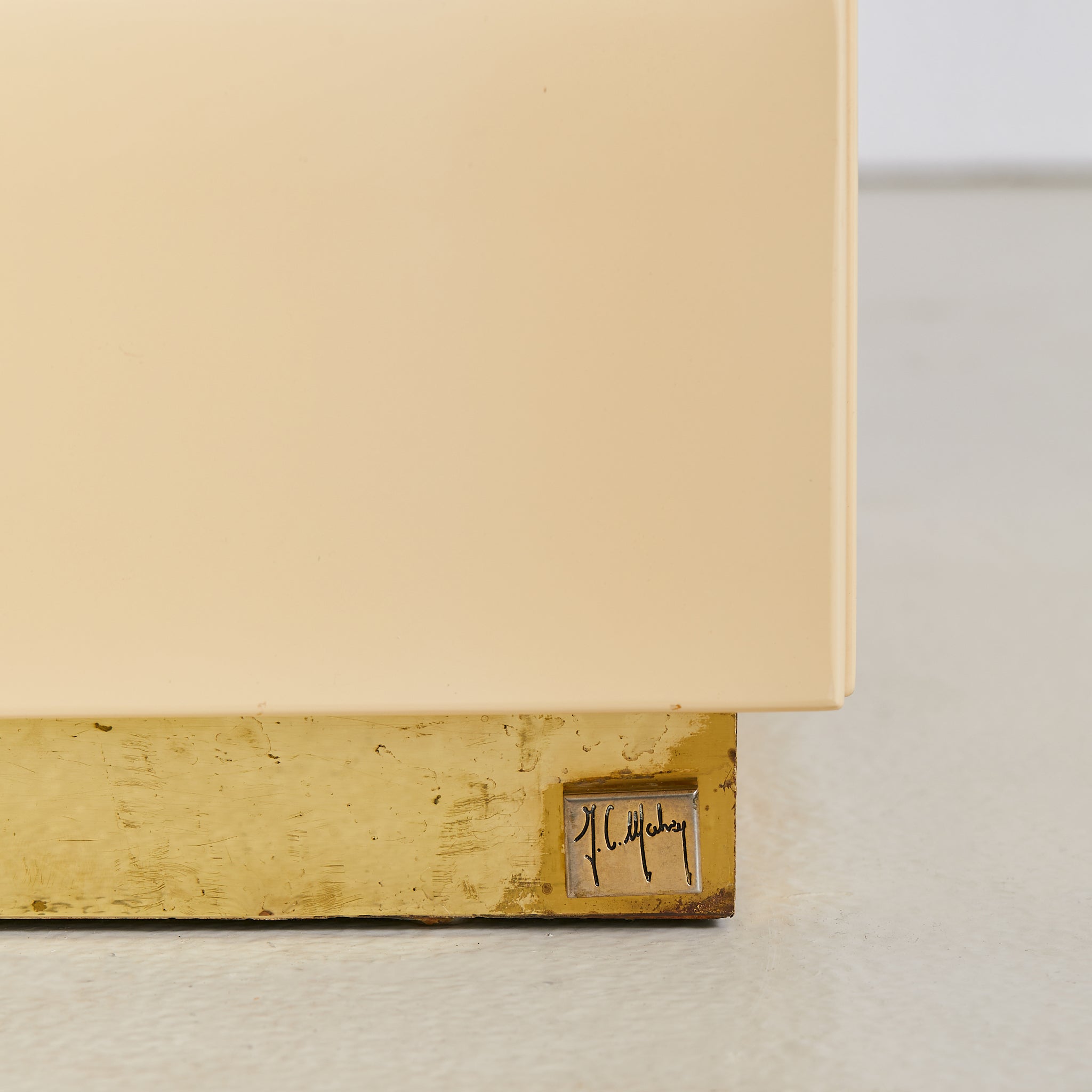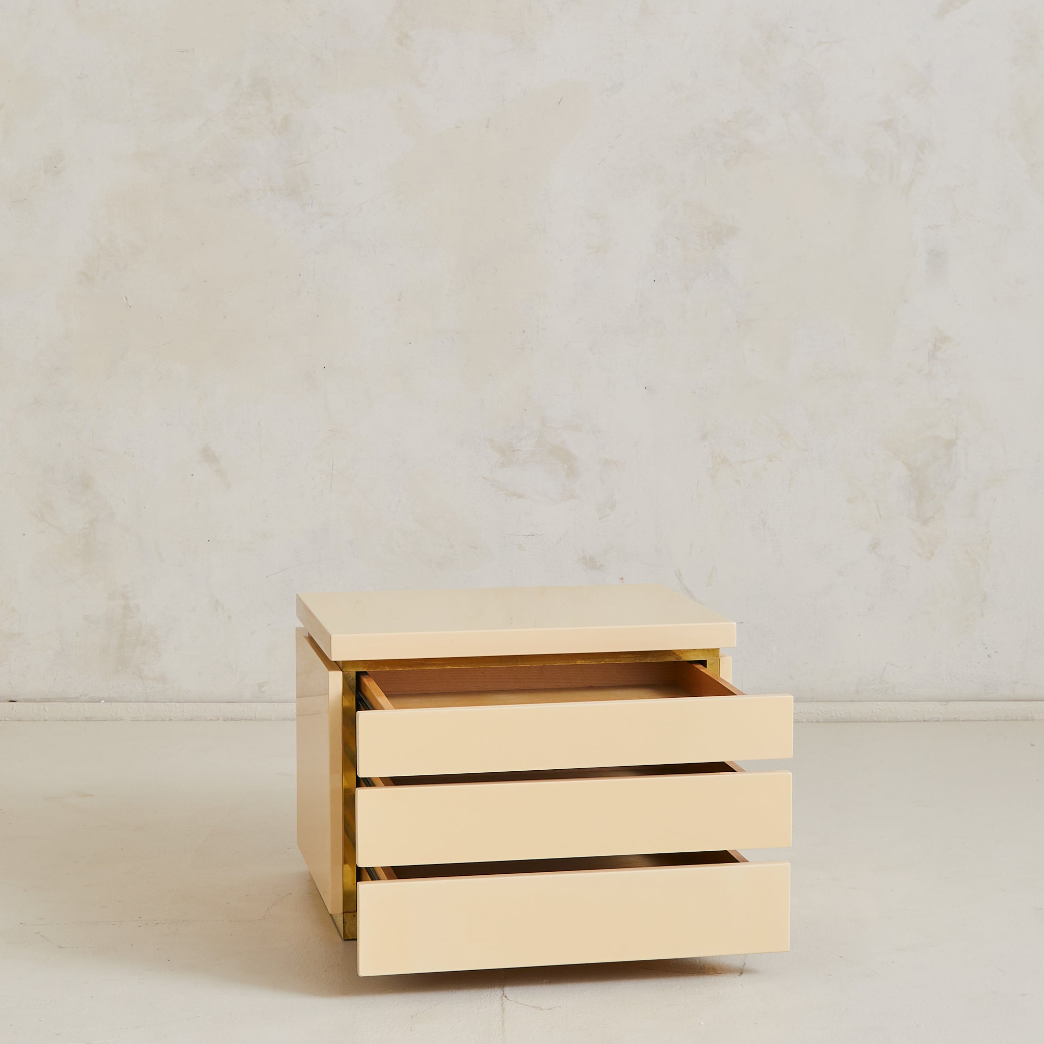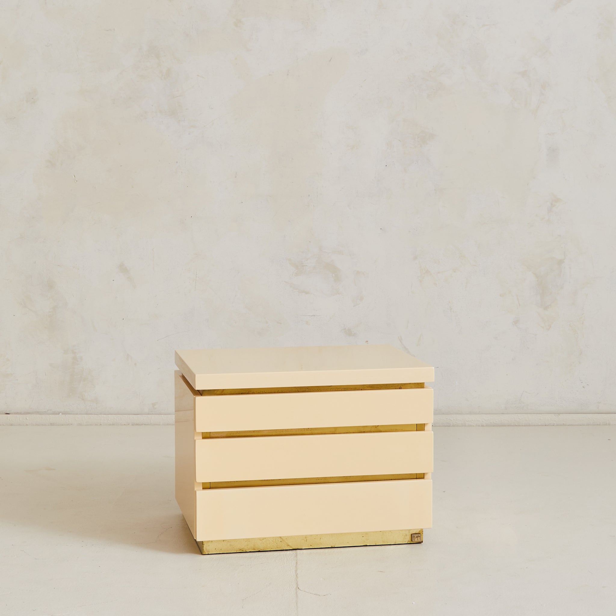 A 1970s French bedside table by Jean Claude Mahey, finished in ivory high-gloss lacquer with brushed brass inlays between each drawer and along the foot. Three drawers reveal satinwood interiors, signed “JC Mahey” at the base—a subtle mark of authorship.