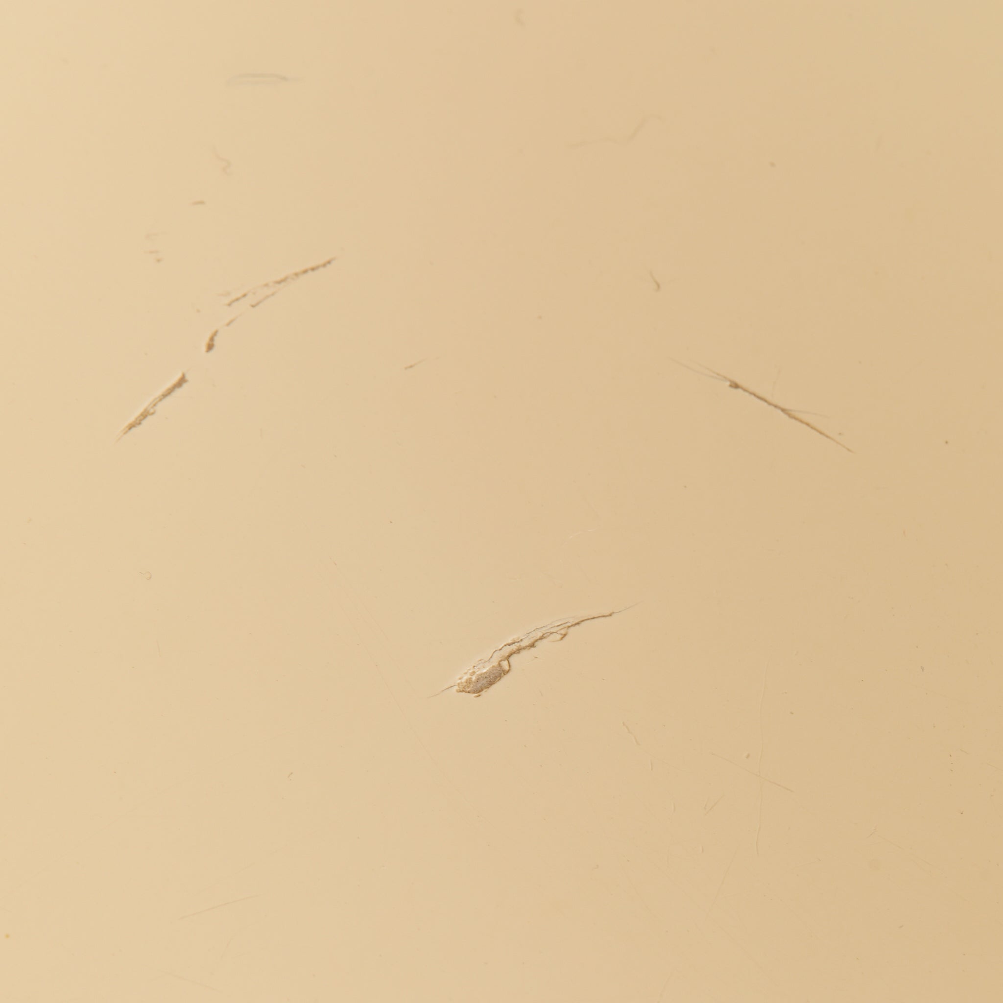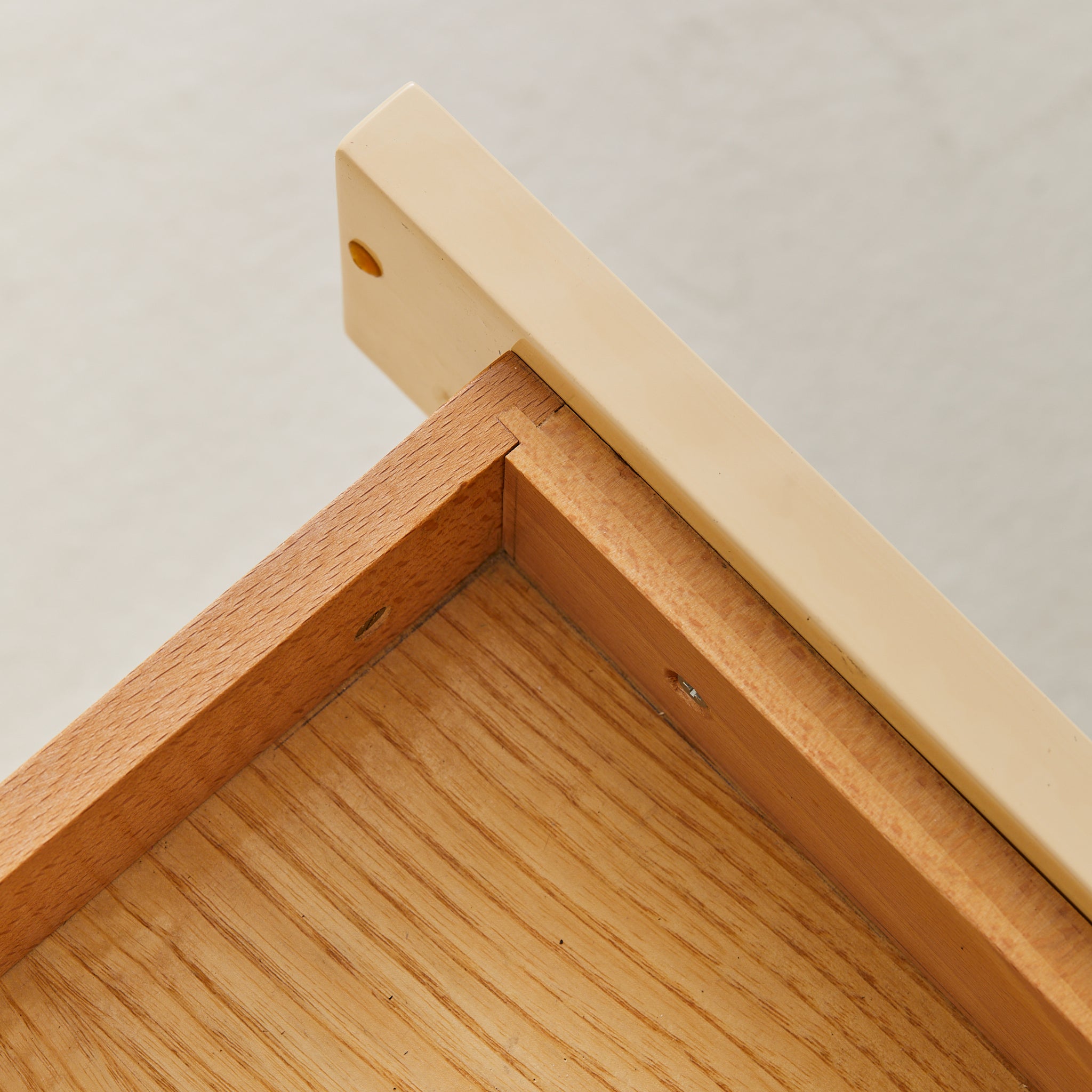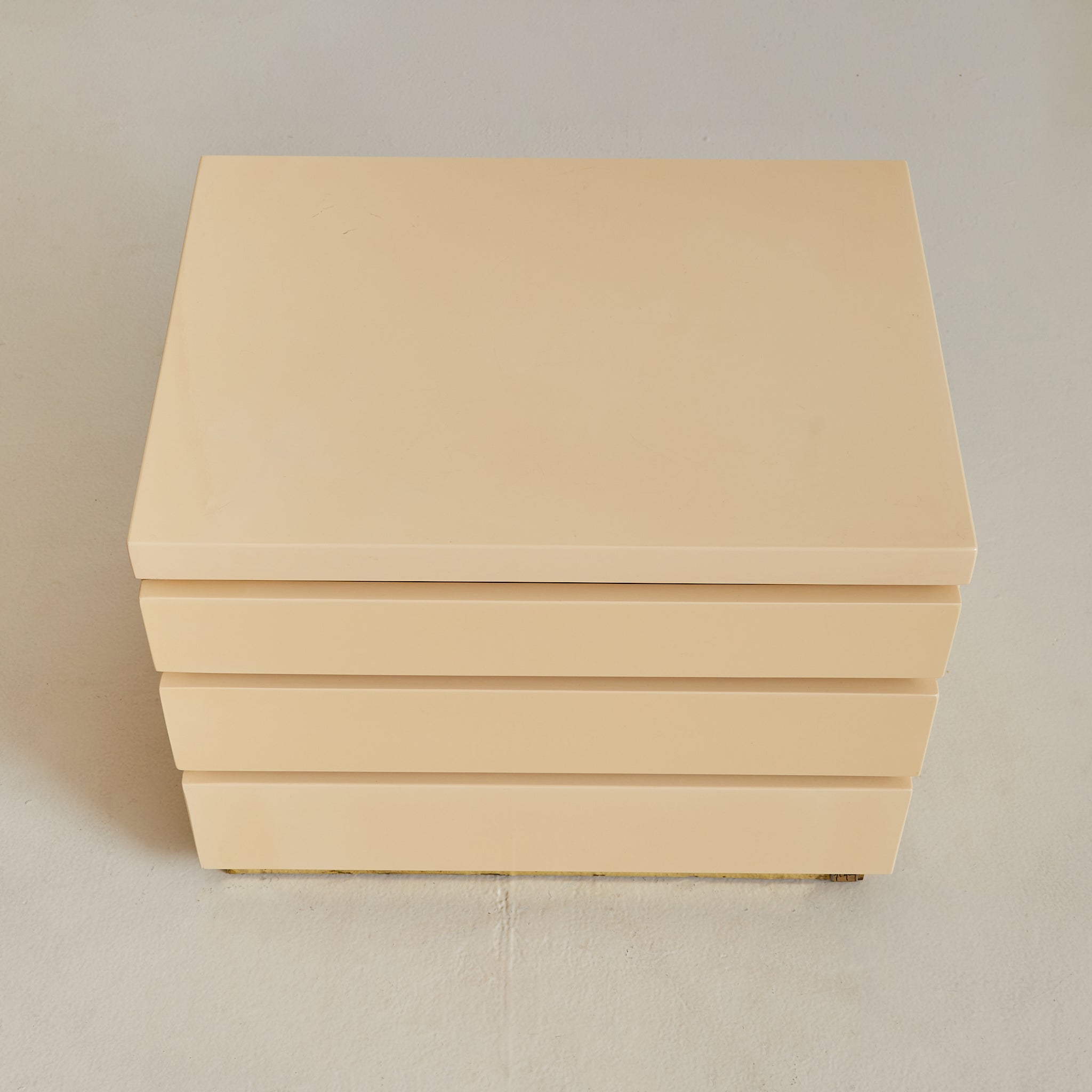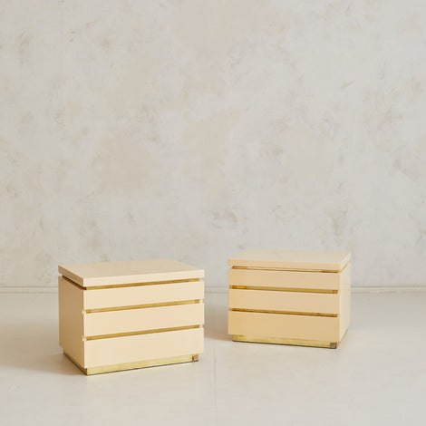 A 1970s French bedside table by Jean Claude Mahey, finished in ivory high-gloss lacquer with brushed brass inlays between each drawer and along the foot. Three drawers reveal satinwood interiors, signed “JC Mahey” at the base—a subtle mark of authorship.
