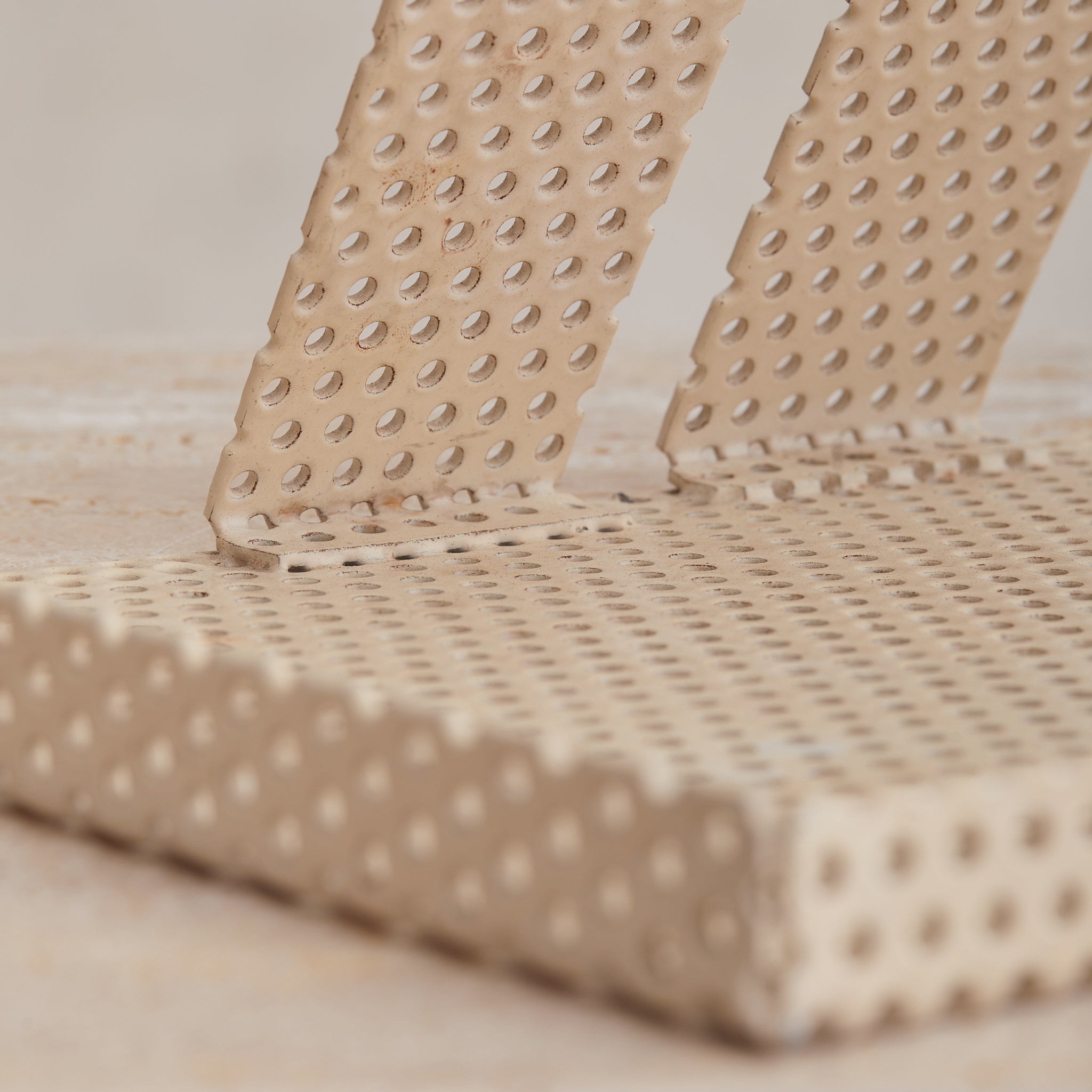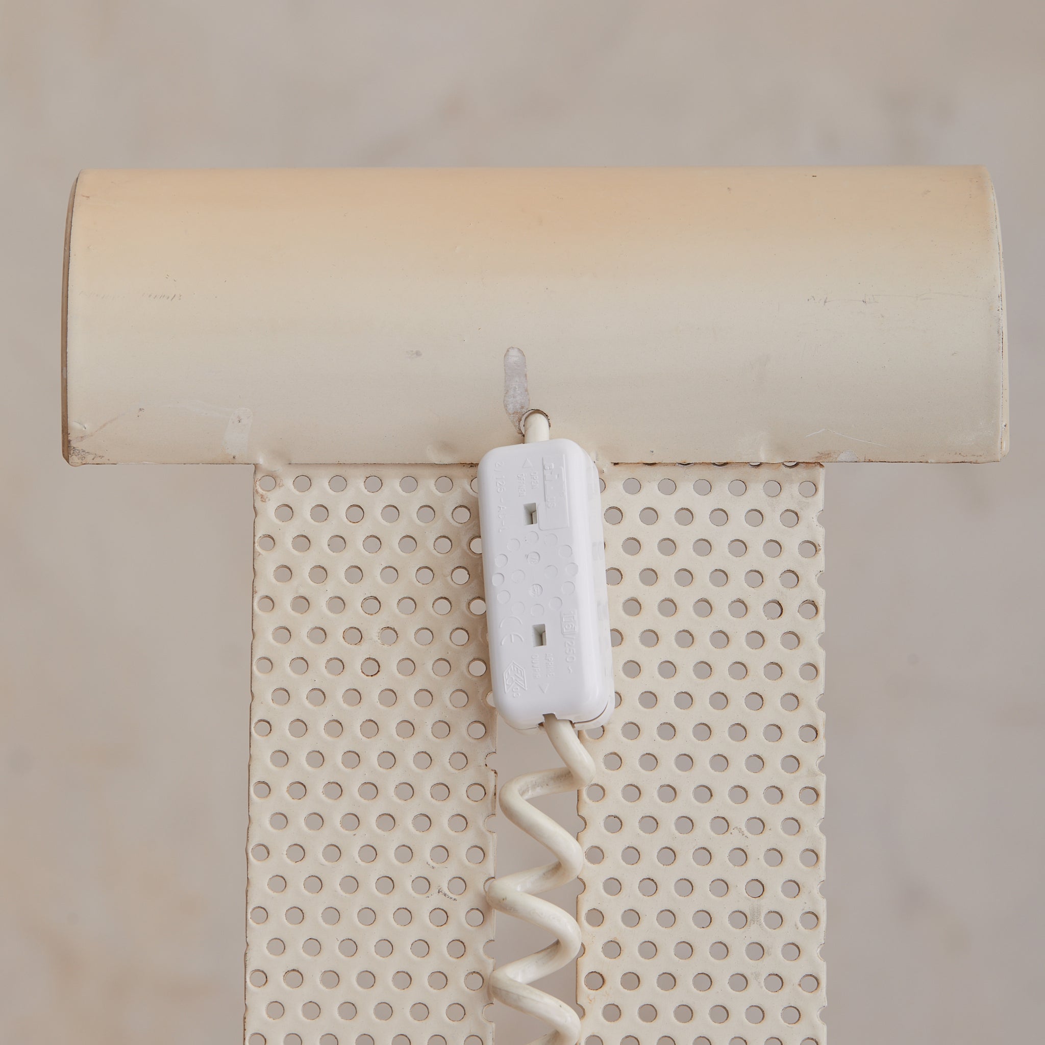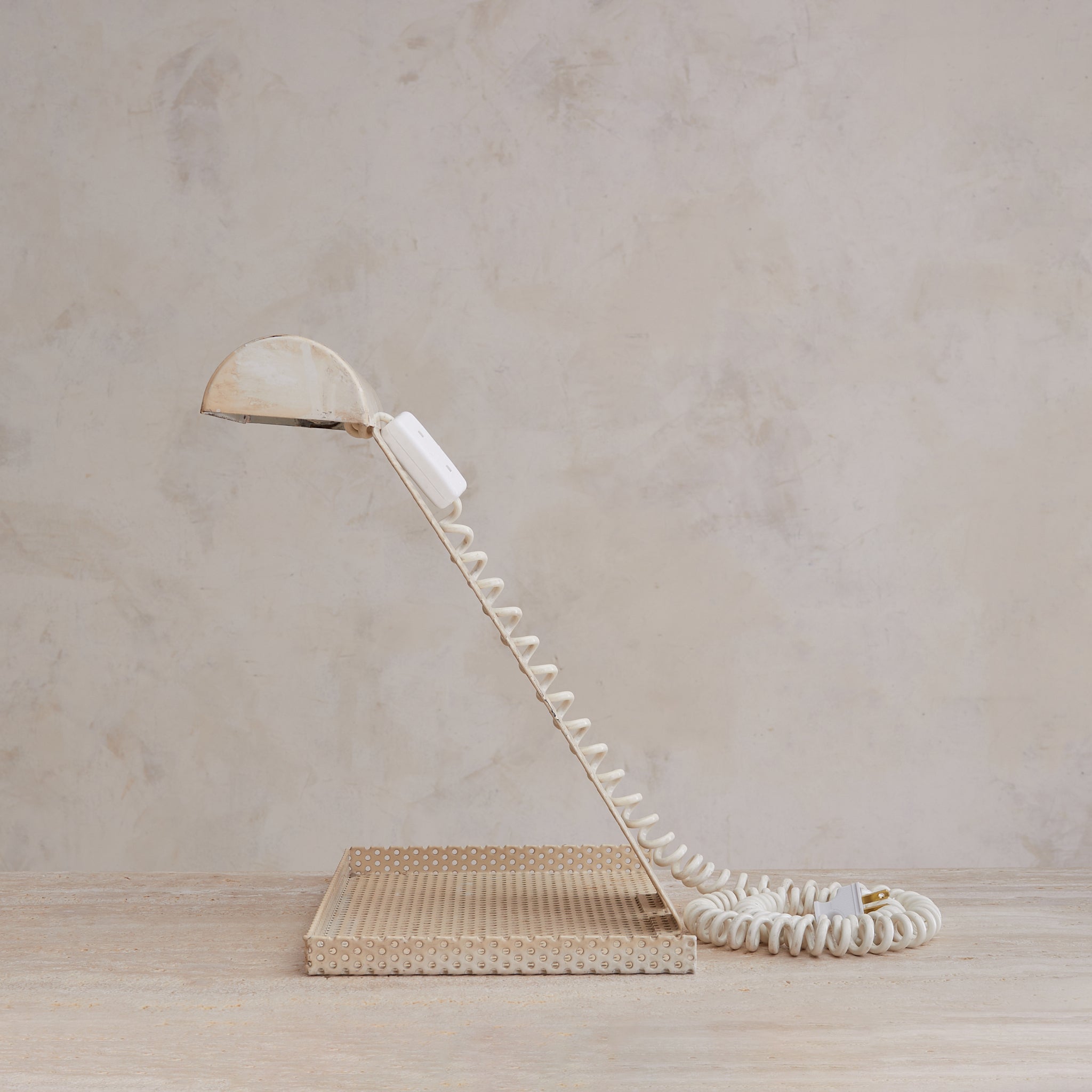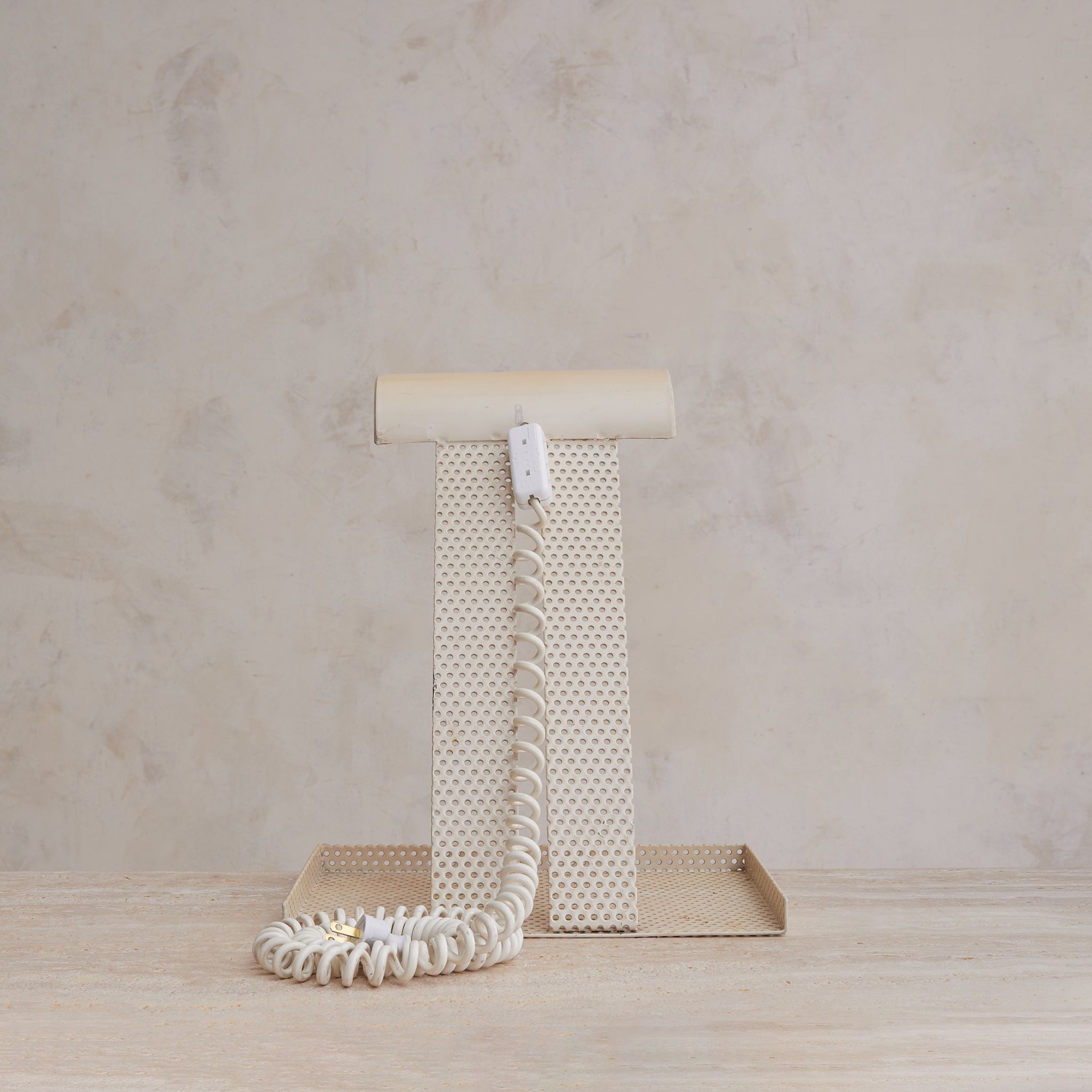 A sculptural French desk lamp in perforated metal, reminiscent of Mathieu Matégot’s material language. Finished in warm ivory, the design features a bent metal shade and dual arms, joined at the base by an integrated tray. An original coiled cord extends from the back.