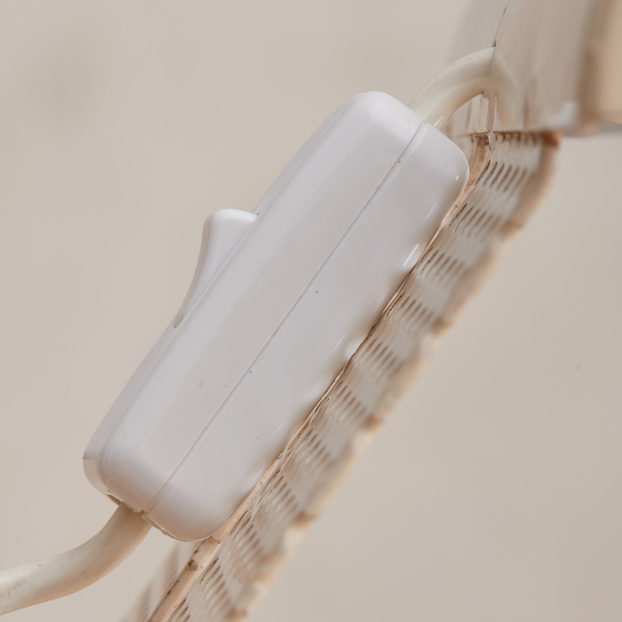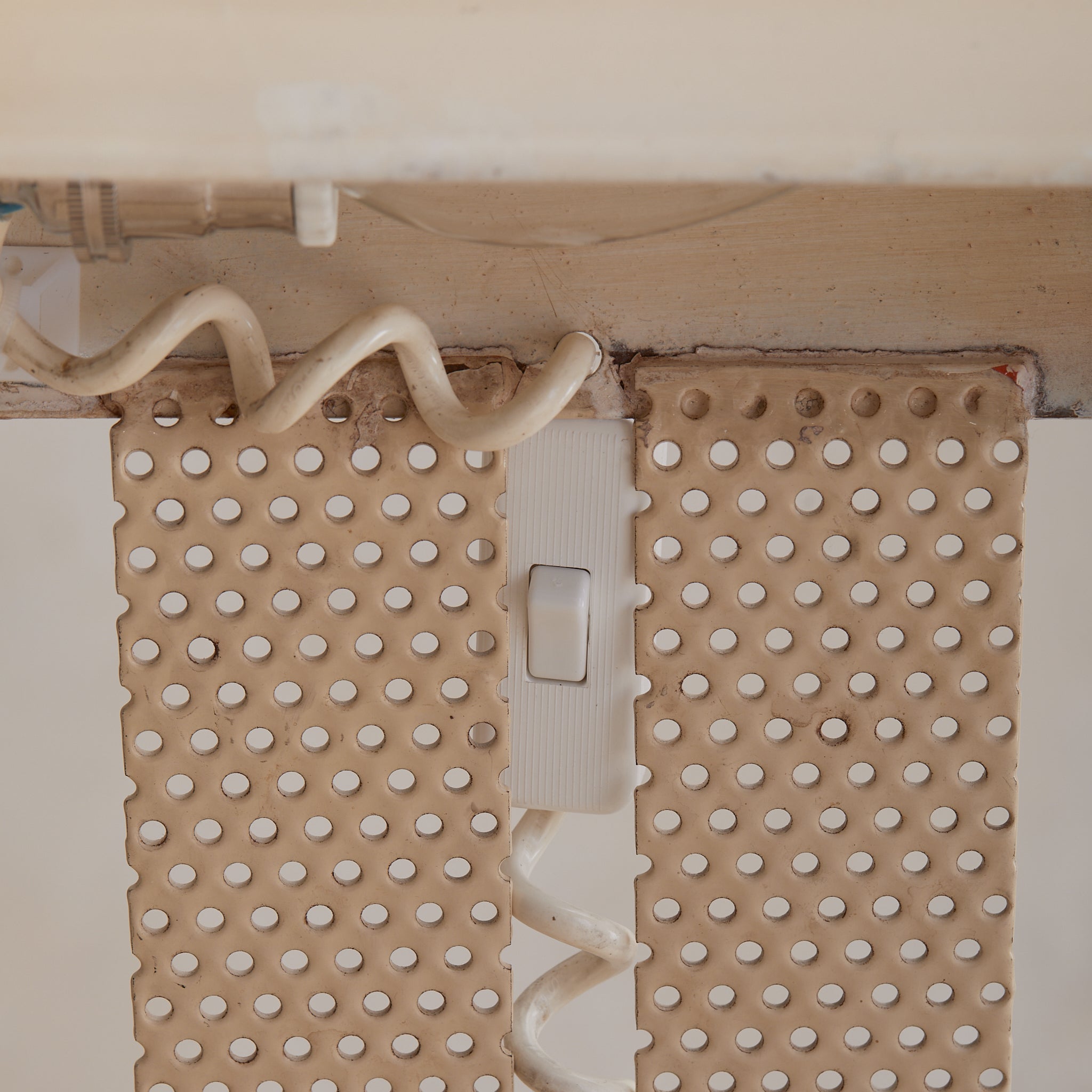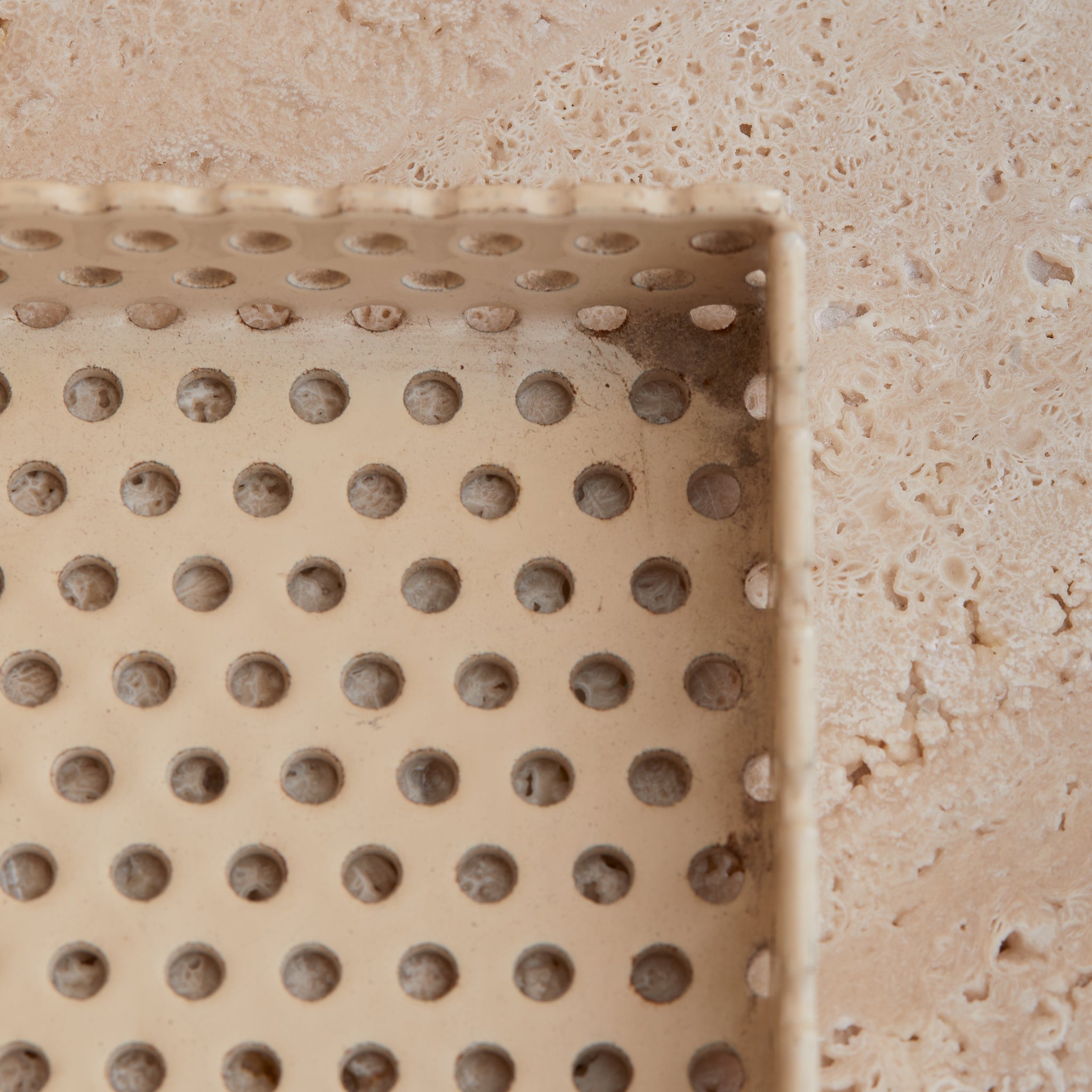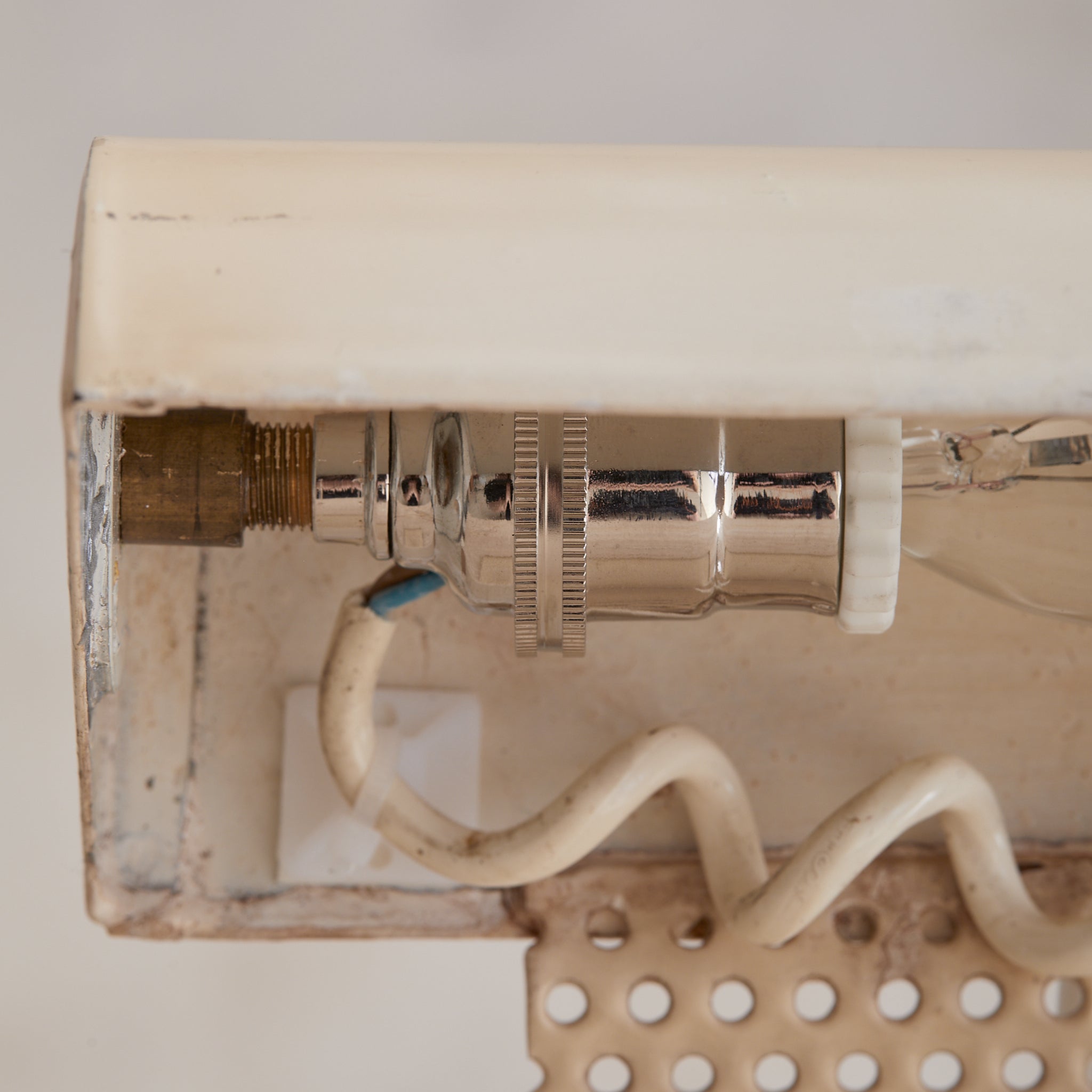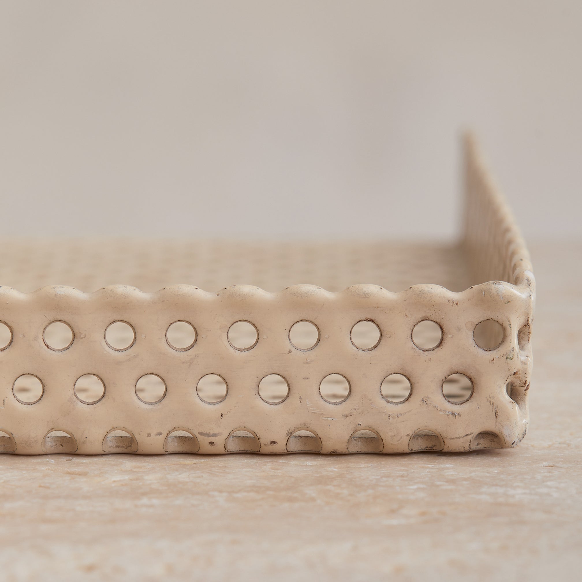 A sculptural French desk lamp in perforated metal, reminiscent of Mathieu Matégot’s material language. Finished in warm ivory, the design features a bent metal shade and dual arms, joined at the base by an integrated tray. An original coiled cord extends from the back.