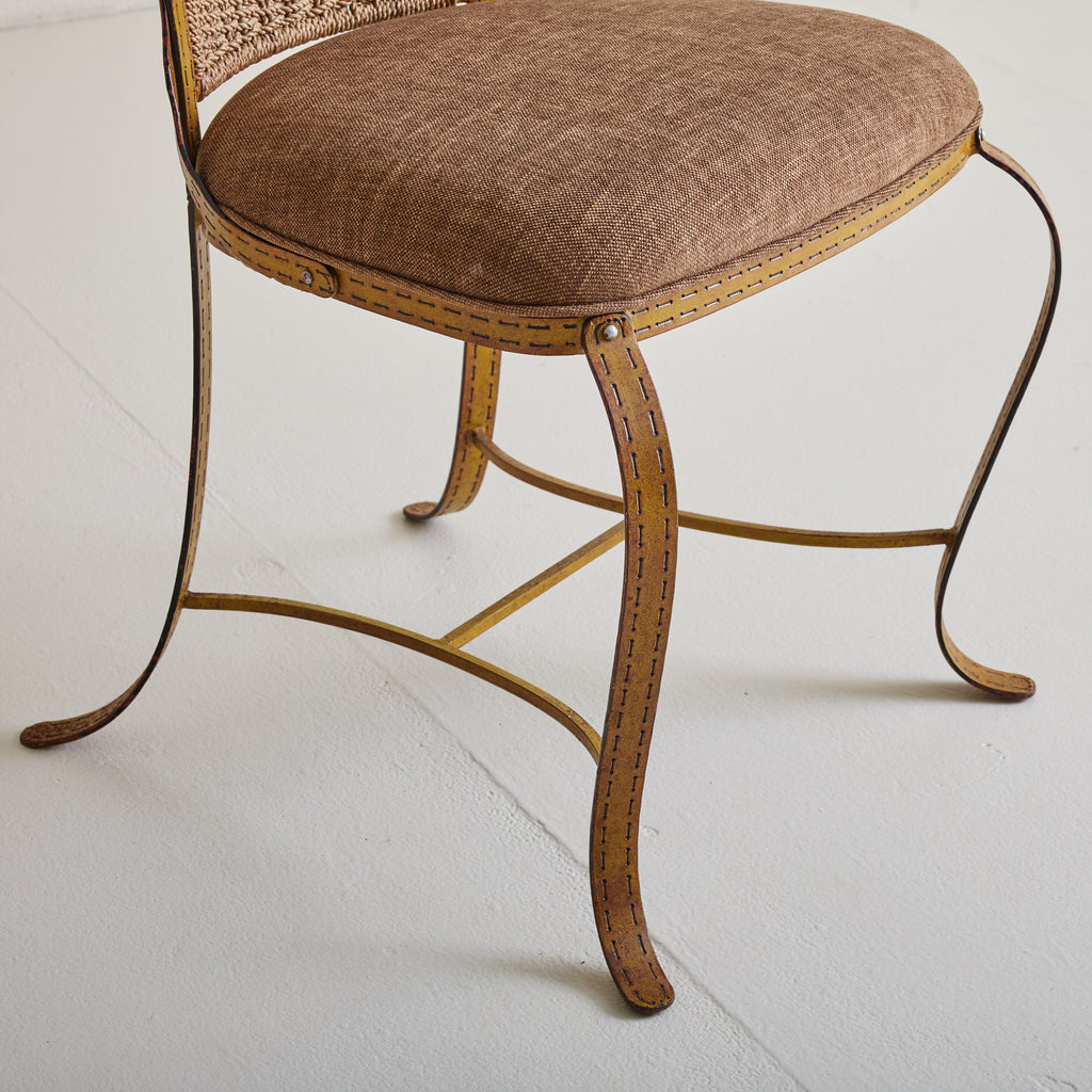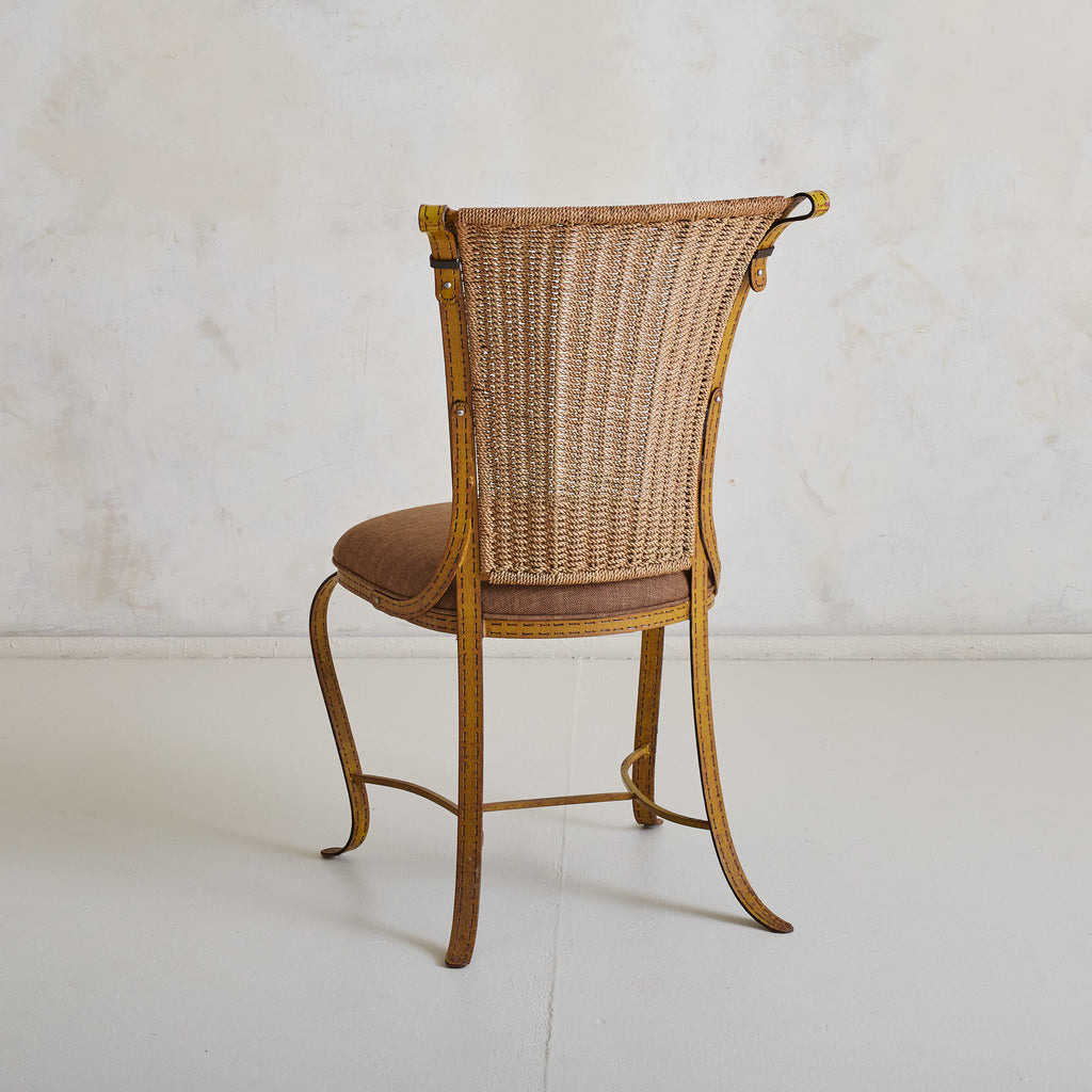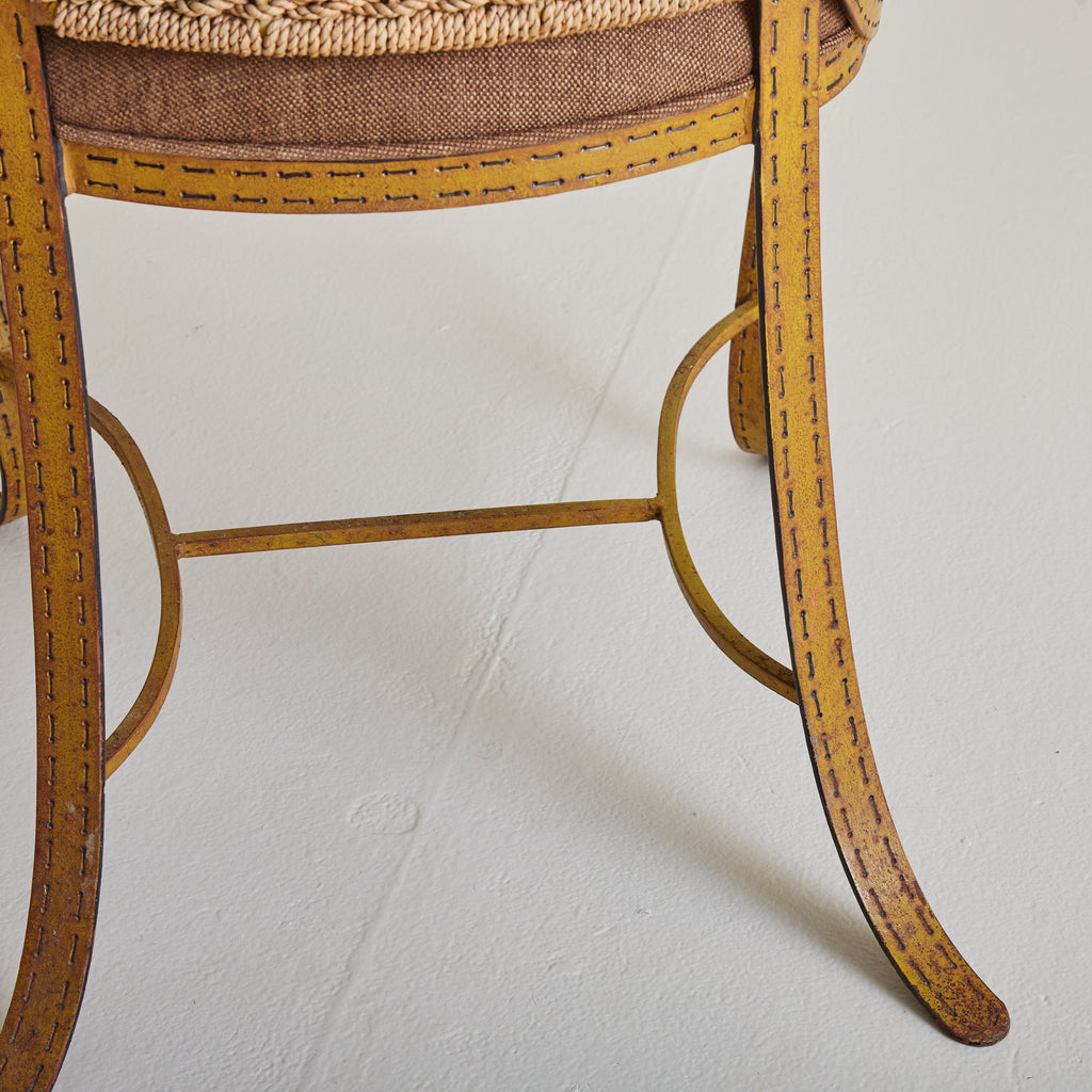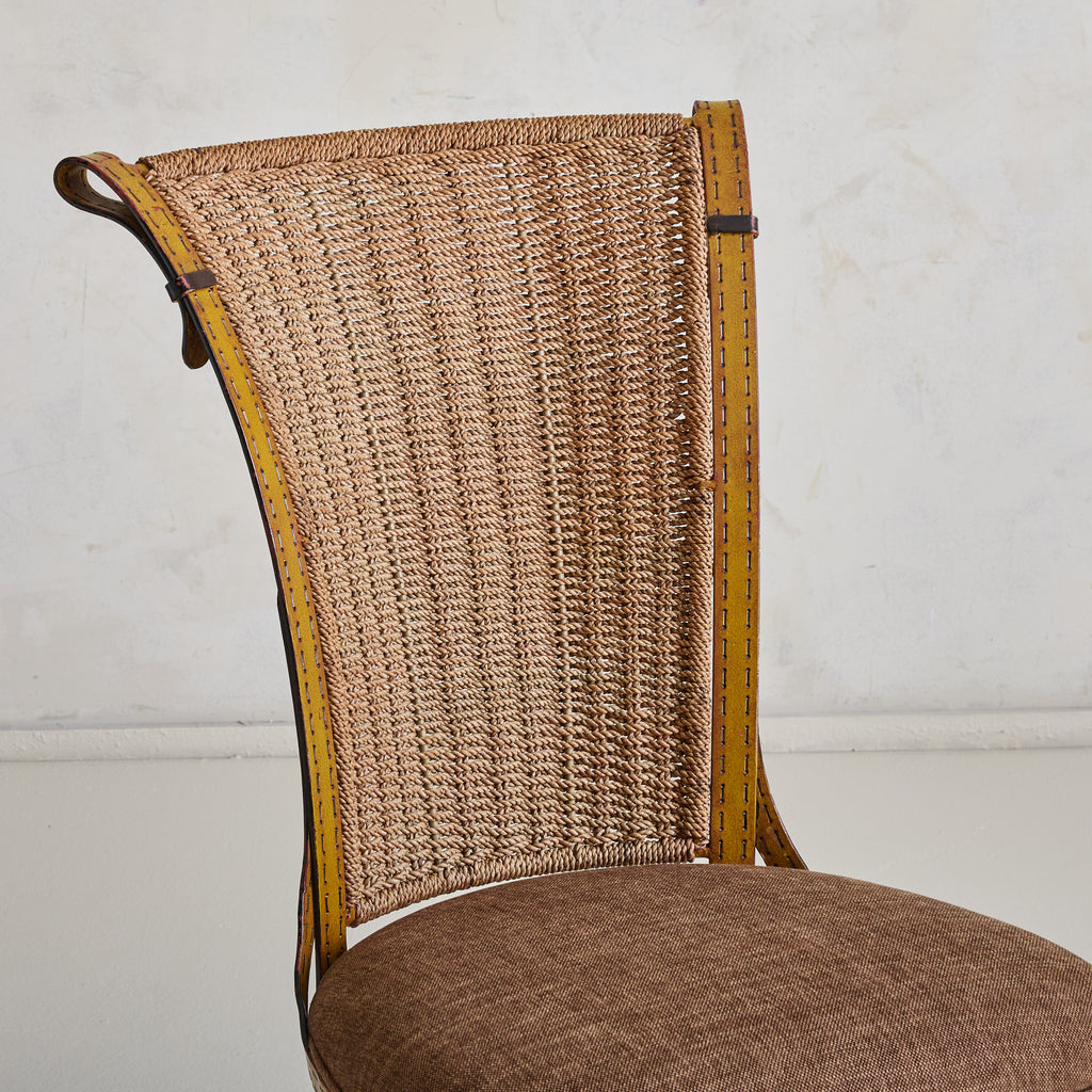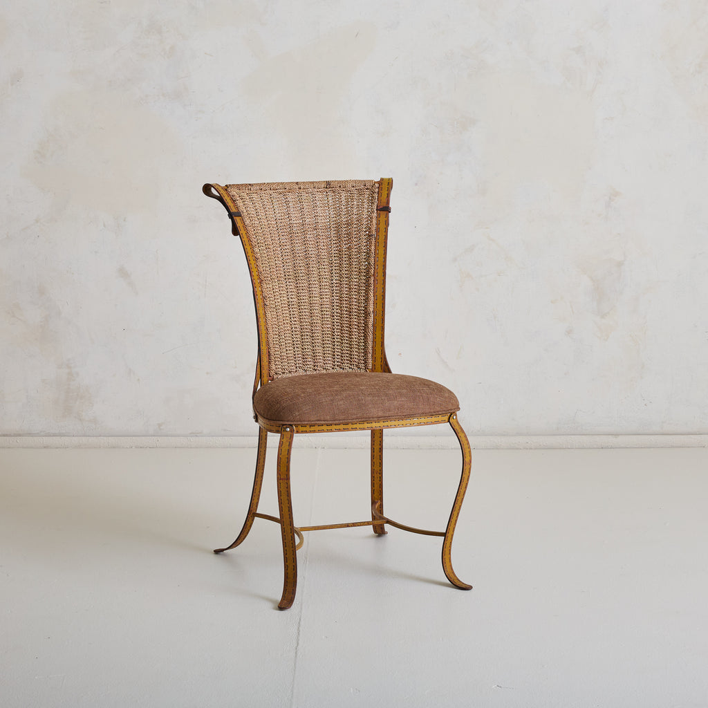 A 1960s French accent chair, attributed to Jacques Adnet, seamlessly blending raw texture with refined craftsmanship. The high, gently flared backrest is intricately woven from natural rope, offering both visual and tactile warmth. A gilt iron frame, enveloped in Adnet’s signature thick saddle leather, showcases meticulous stitch detailing. The seat has been newly reupholstered in a chocolate brown woven fabric with welt detailing, enhancing its earthy, organic appeal.
