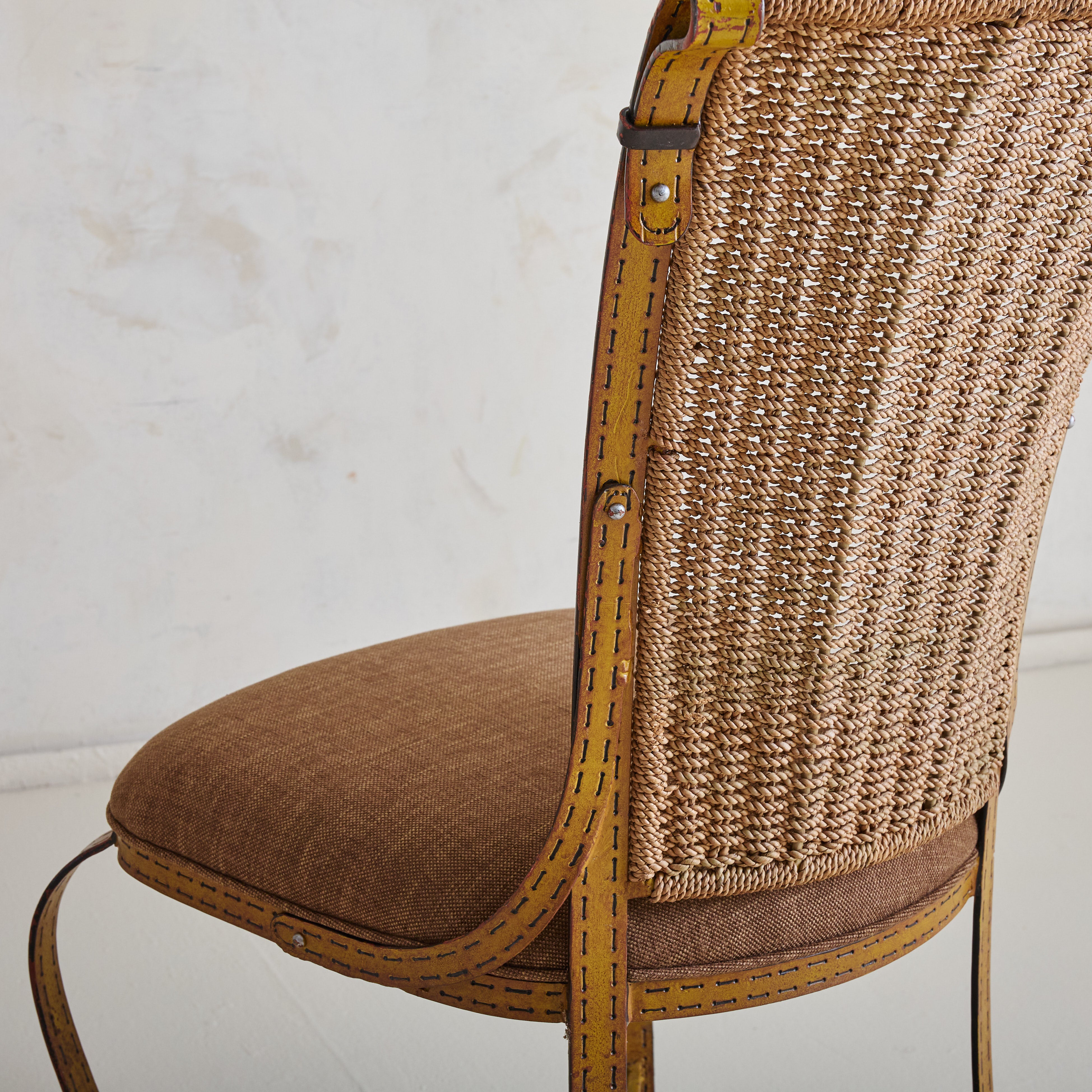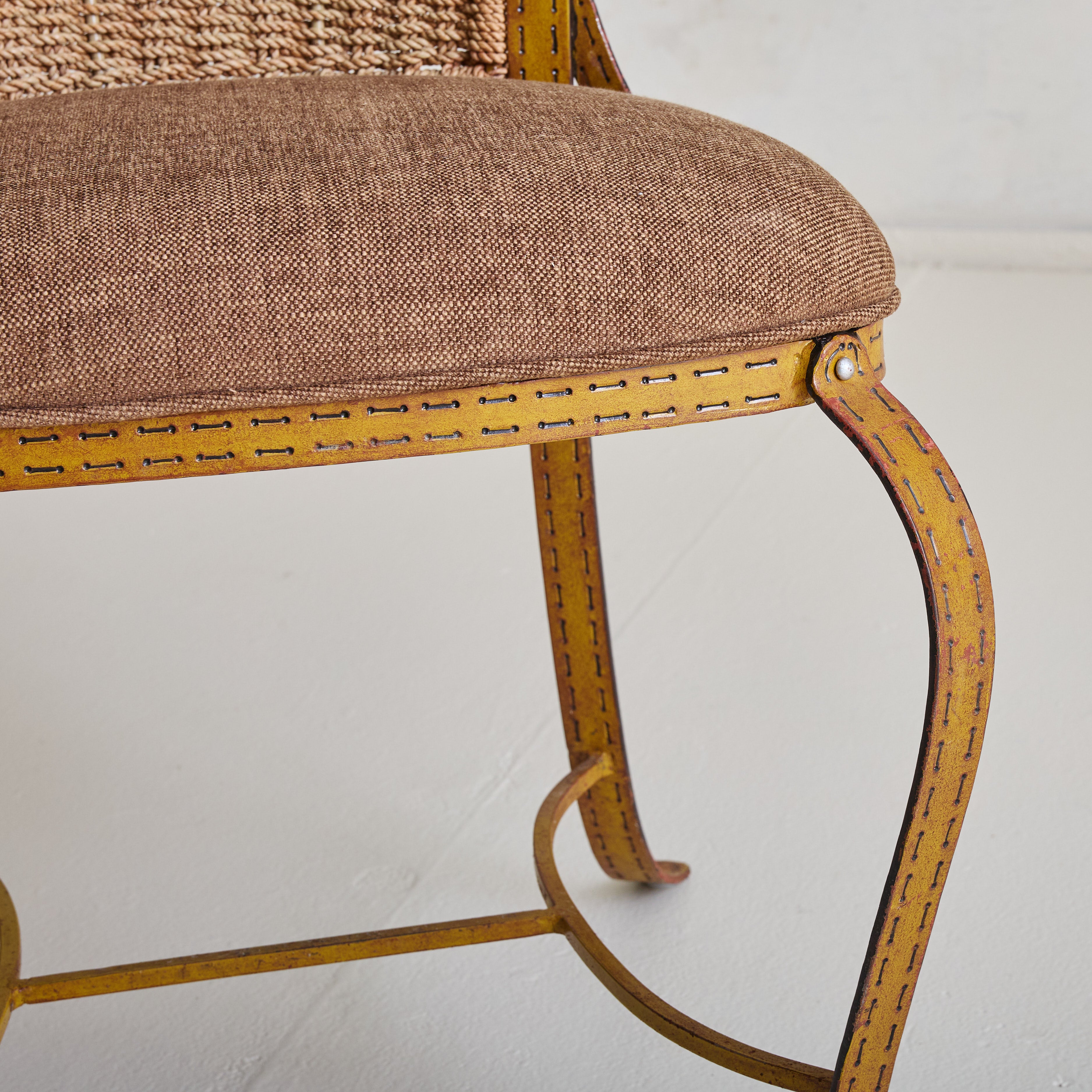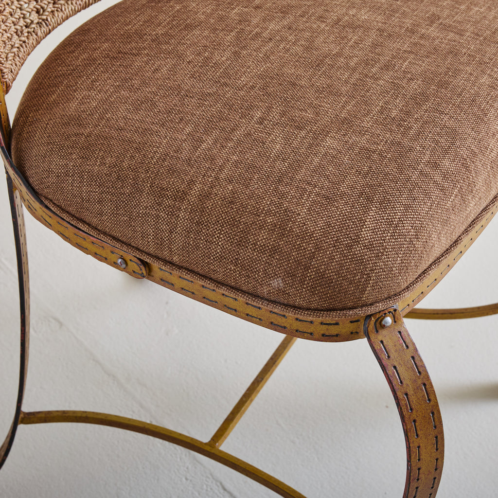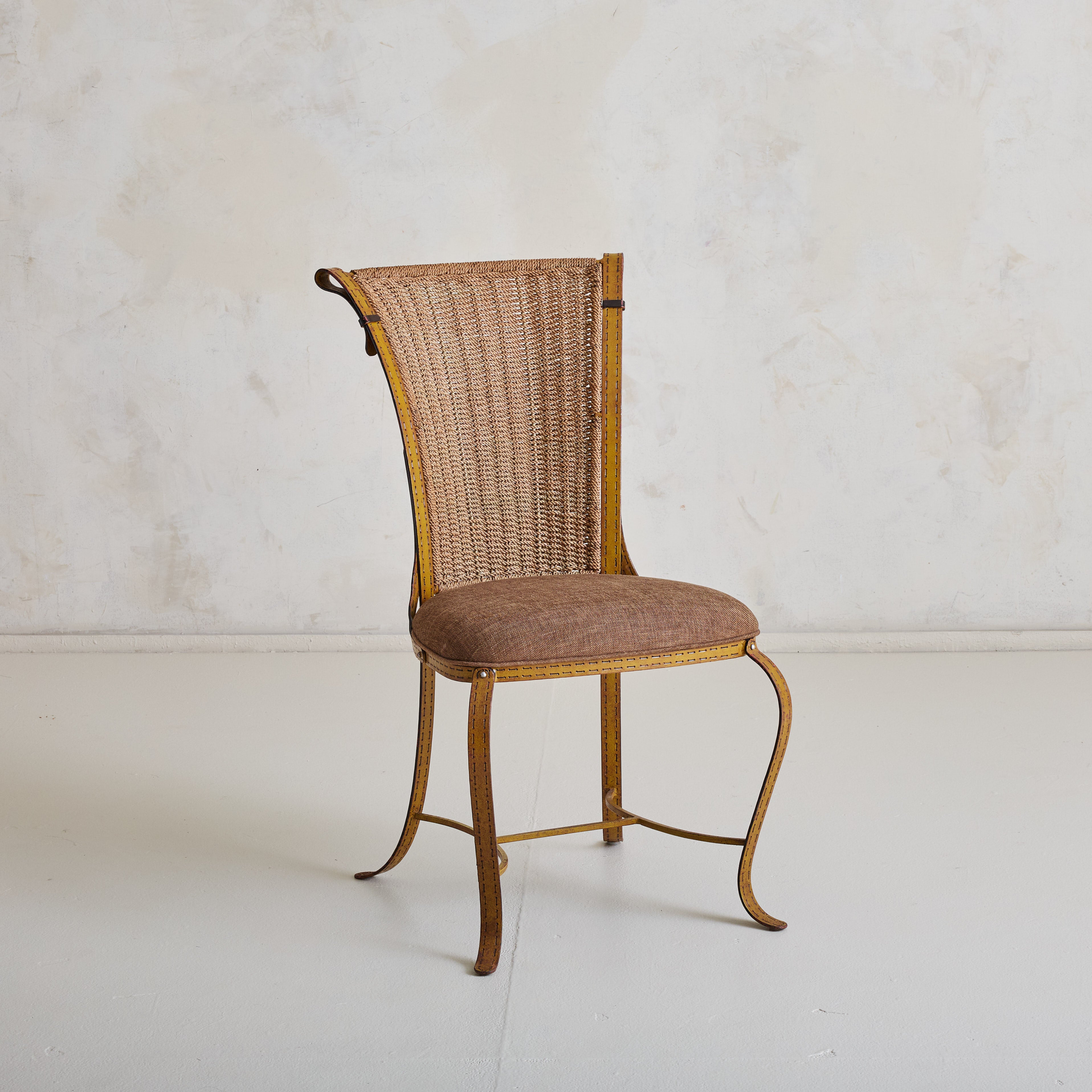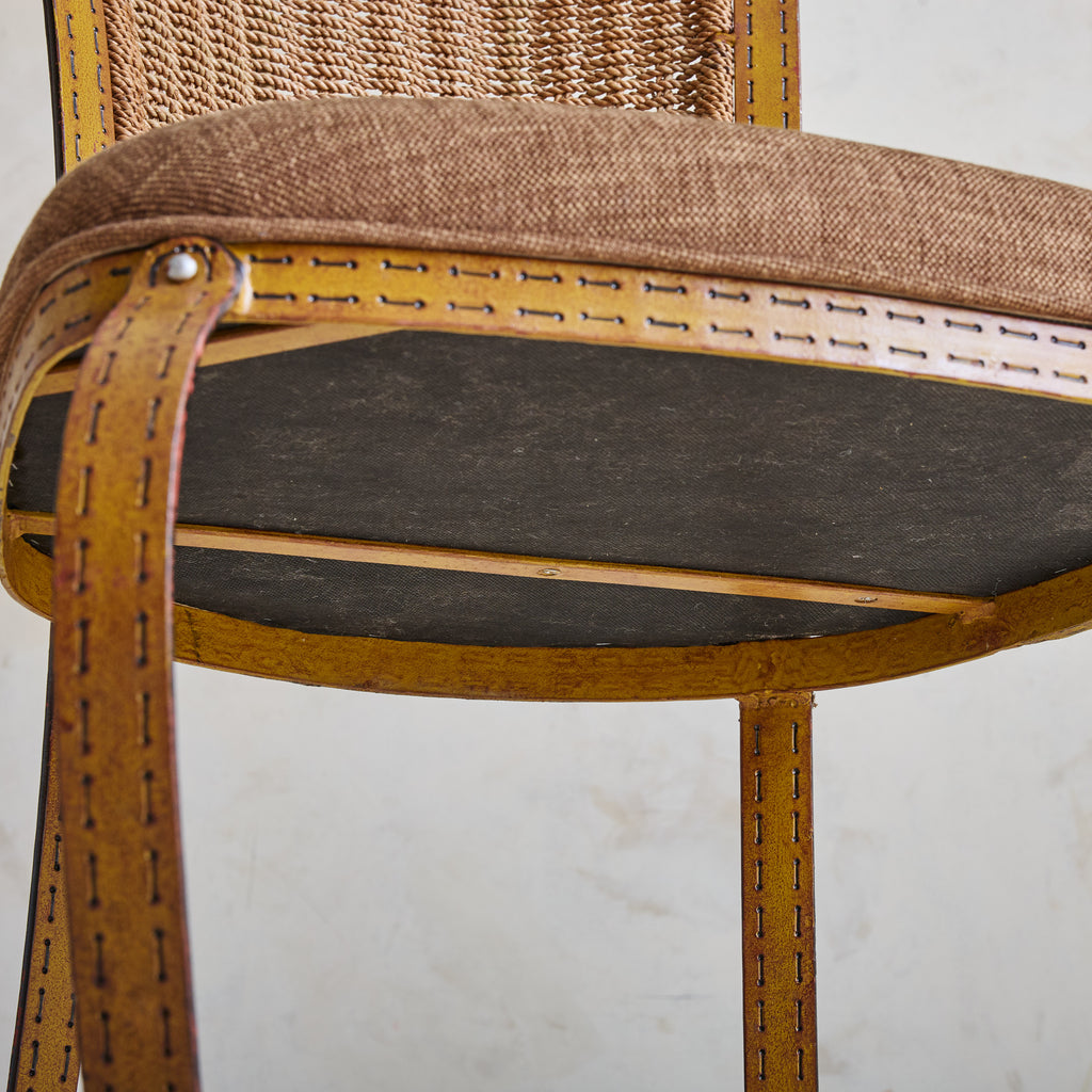 A 1960s French accent chair, attributed to Jacques Adnet, seamlessly blending raw texture with refined craftsmanship. The high, gently flared backrest is intricately woven from natural rope, offering both visual and tactile warmth. A gilt iron frame, enveloped in Adnet’s signature thick saddle leather, showcases meticulous stitch detailing. The seat has been newly reupholstered in a chocolate brown woven fabric with welt detailing, enhancing its earthy, organic appeal.