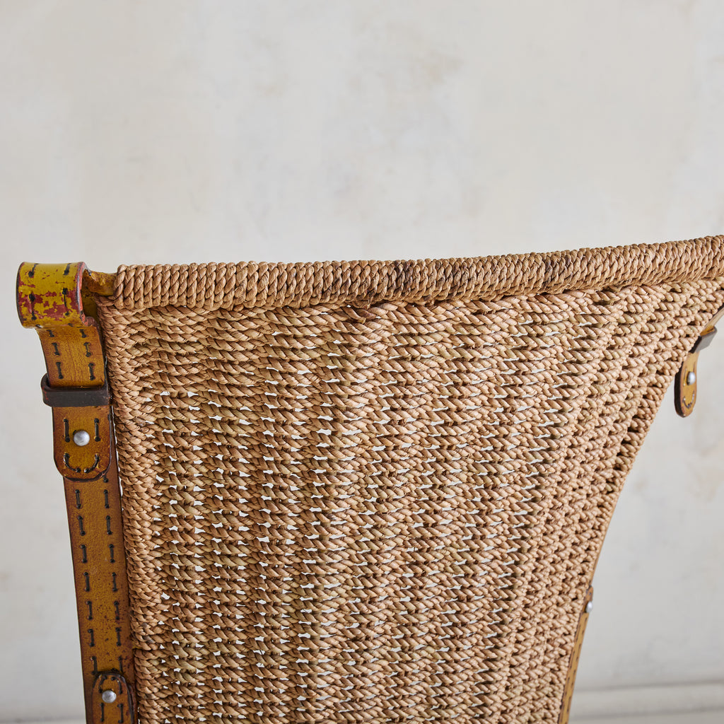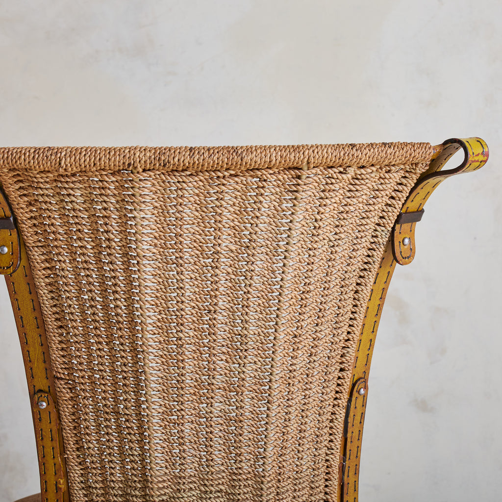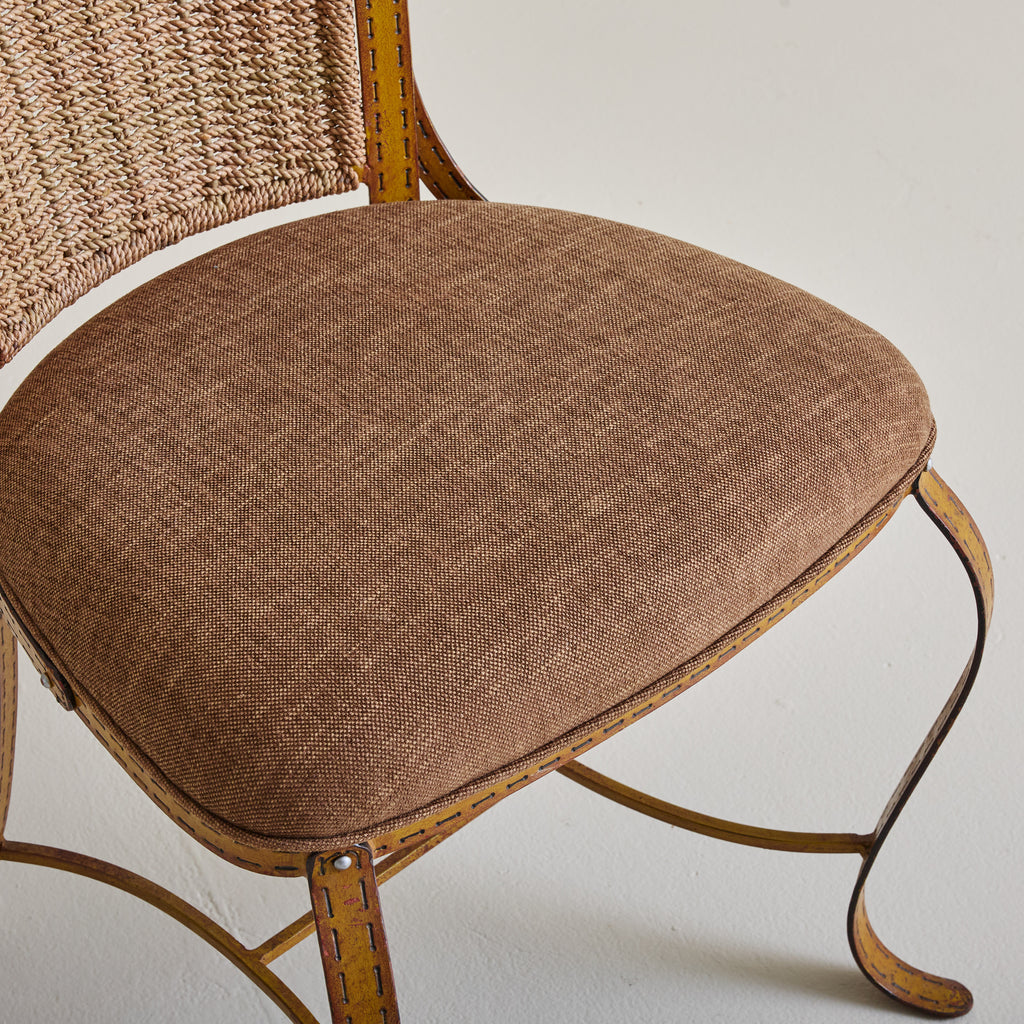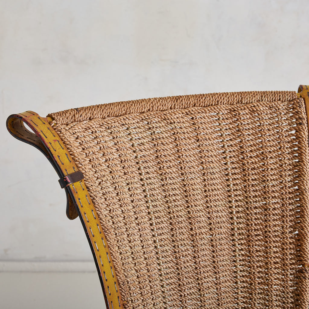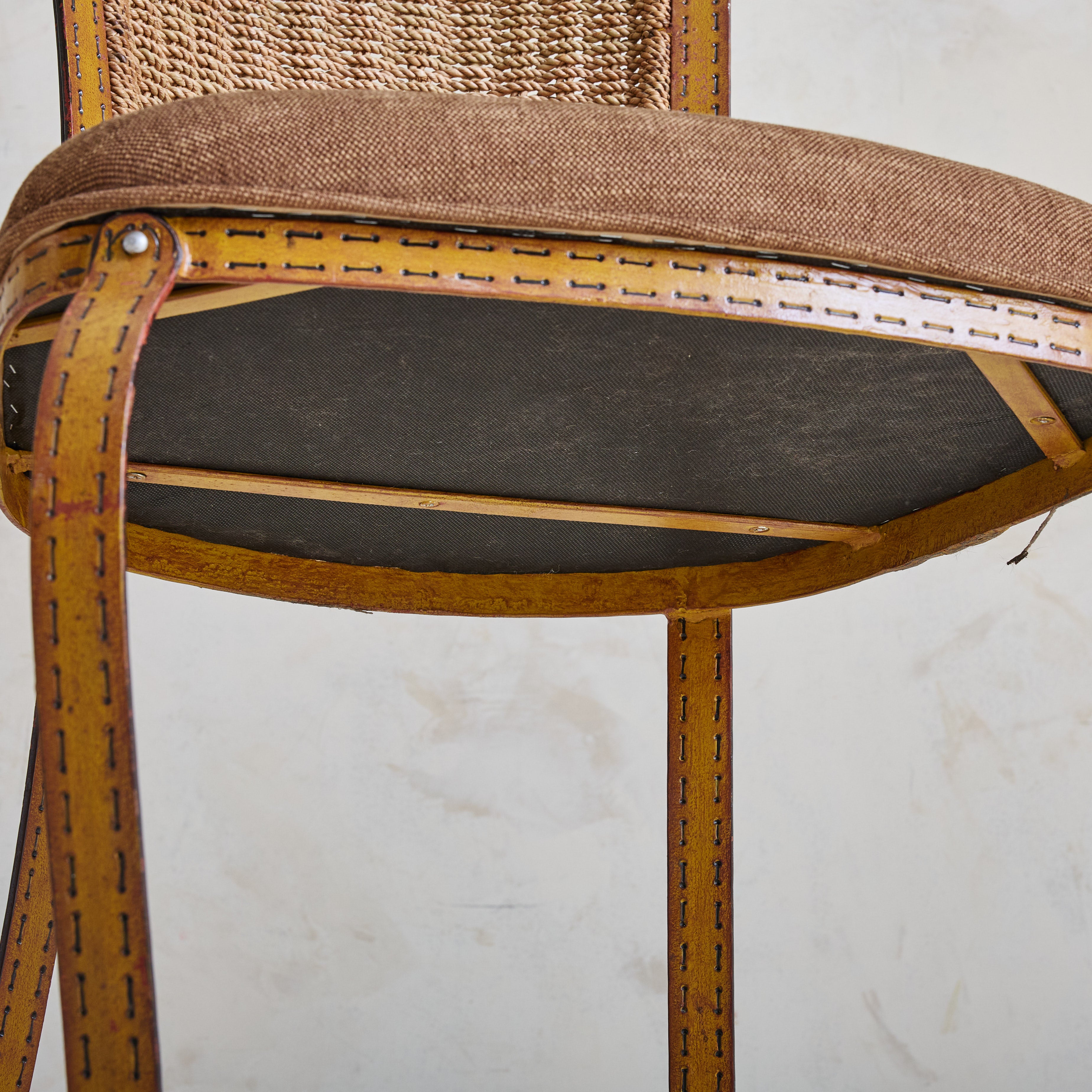 A 1960s French accent chair, attributed to Jacques Adnet, seamlessly blending raw texture with refined craftsmanship. The high, gently flared backrest is intricately woven from natural rope, offering both visual and tactile warmth. A gilt iron frame, enveloped in Adnet’s signature thick saddle leather, showcases meticulous stitch detailing. The seat has been newly reupholstered in a chocolate brown woven fabric with welt detailing, enhancing its earthy, organic appeal.
