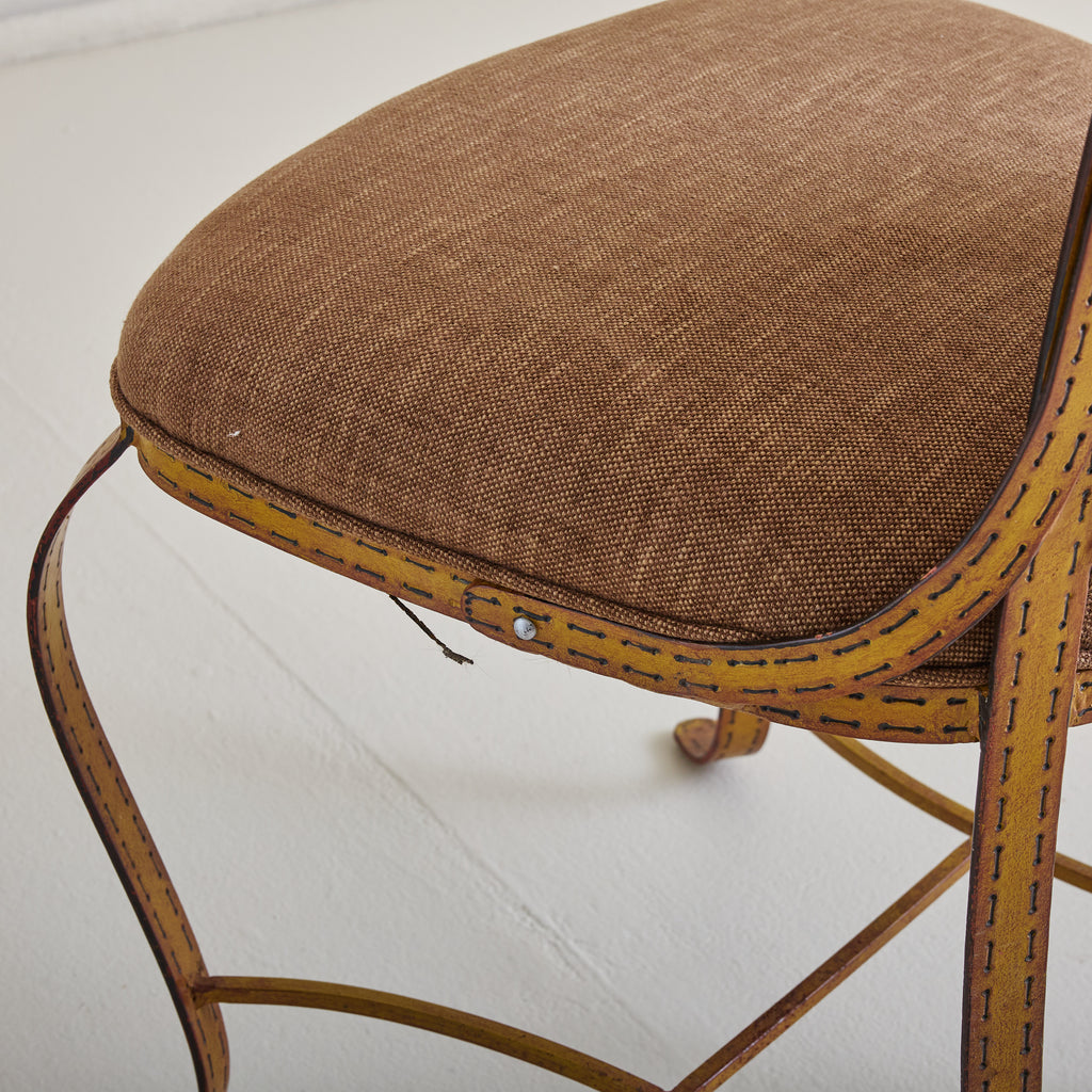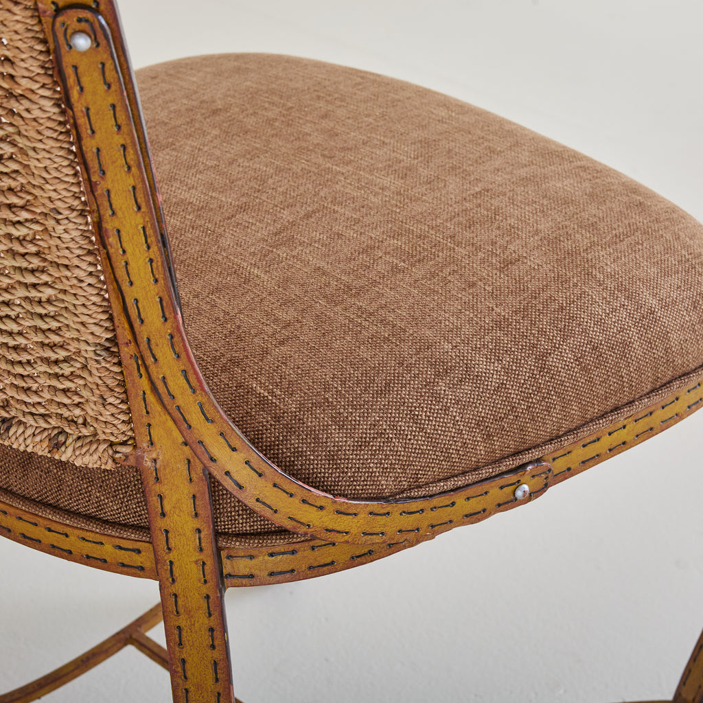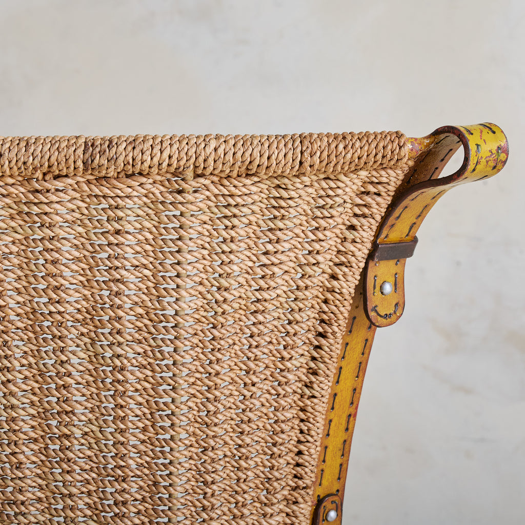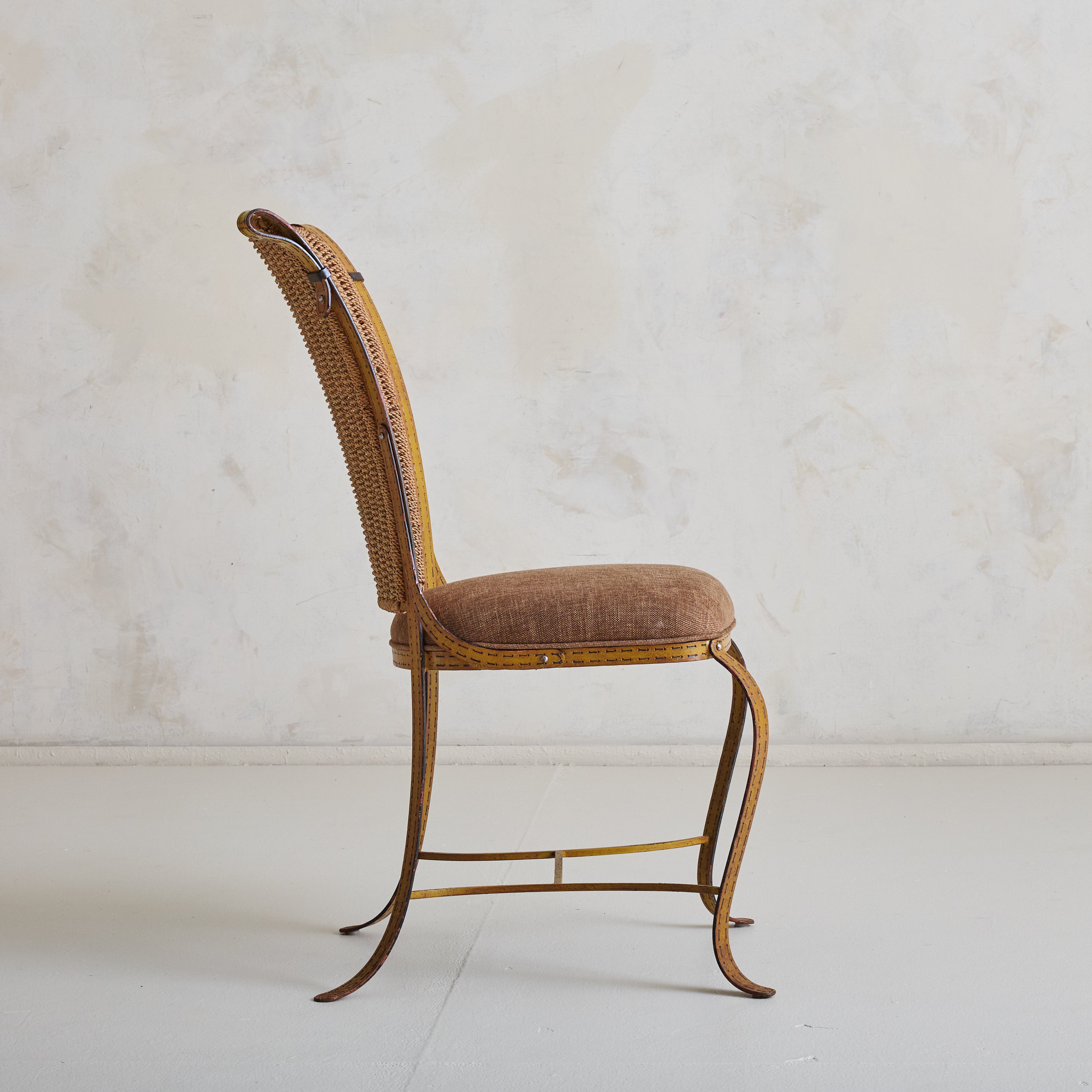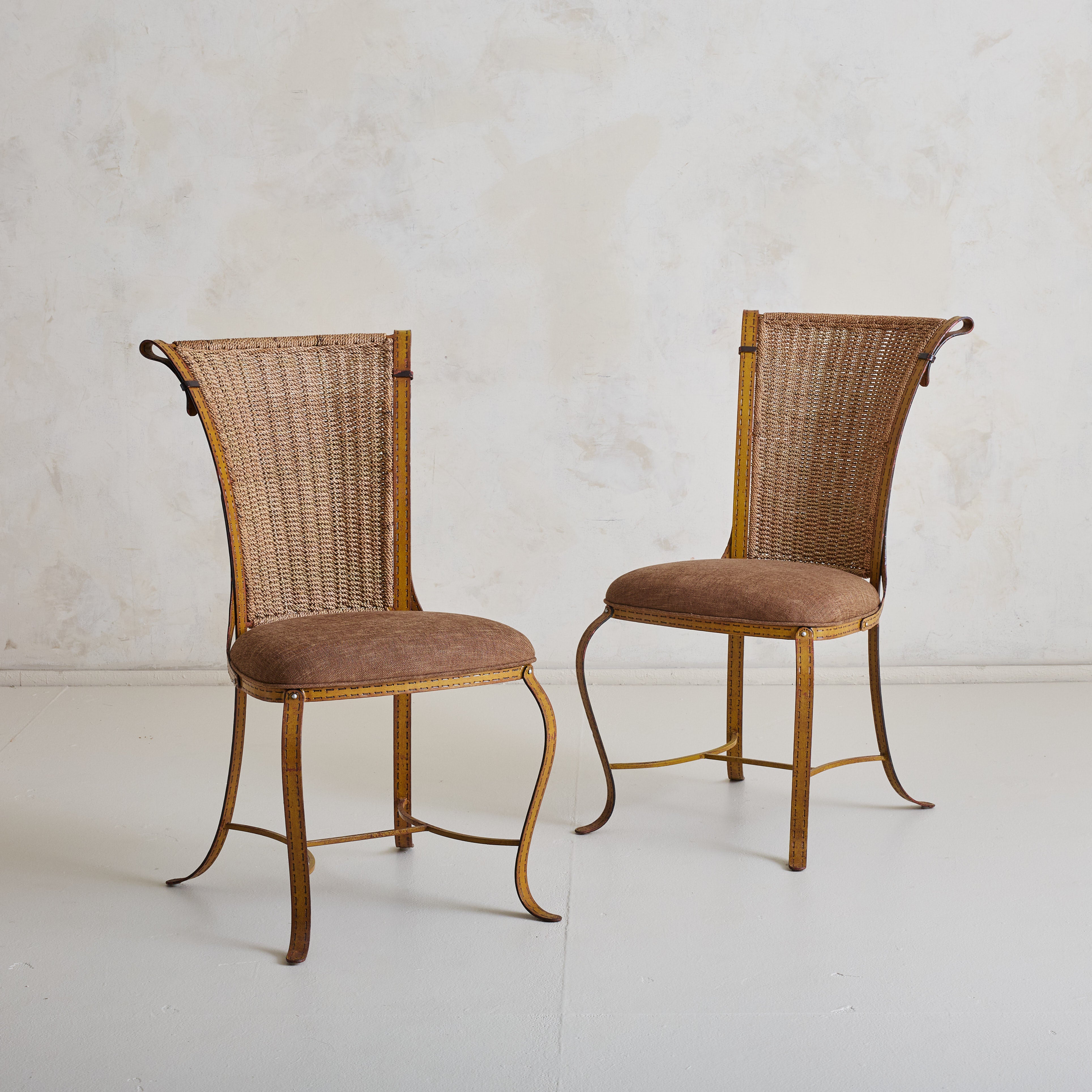 A 1960s French accent chair, attributed to Jacques Adnet, seamlessly blending raw texture with refined craftsmanship. The high, gently flared backrest is intricately woven from natural rope, offering both visual and tactile warmth. A gilt iron frame, enveloped in Adnet’s signature thick saddle leather, showcases meticulous stitch detailing. The seat has been newly reupholstered in a chocolate brown woven fabric with welt detailing, enhancing its earthy, organic appeal.
