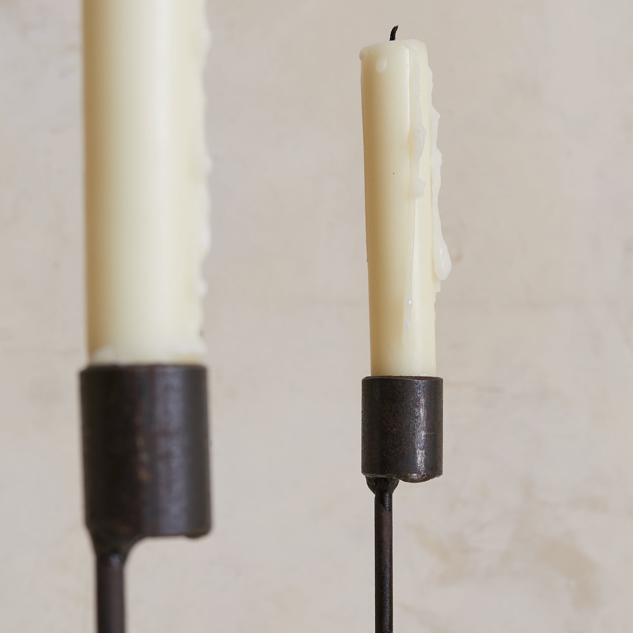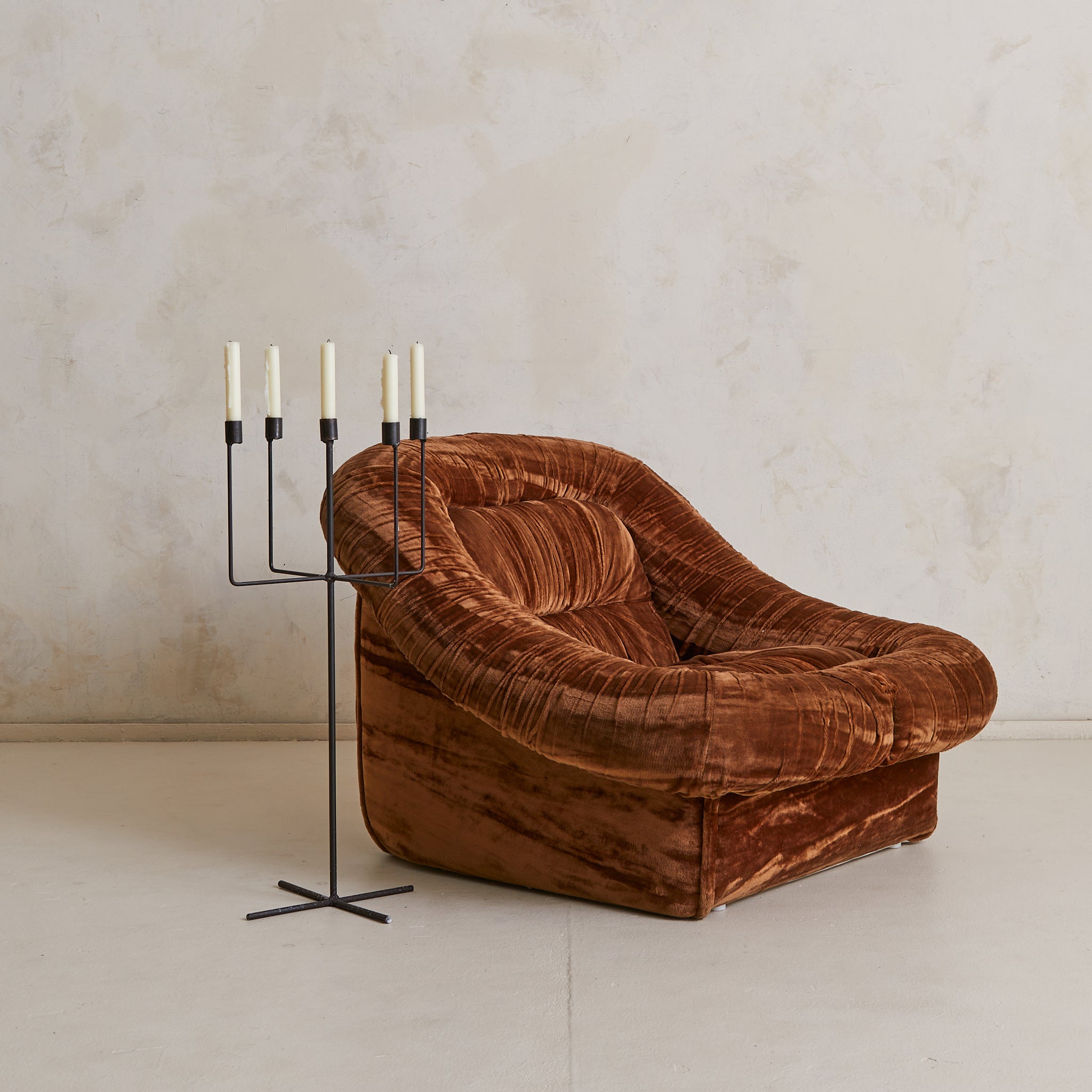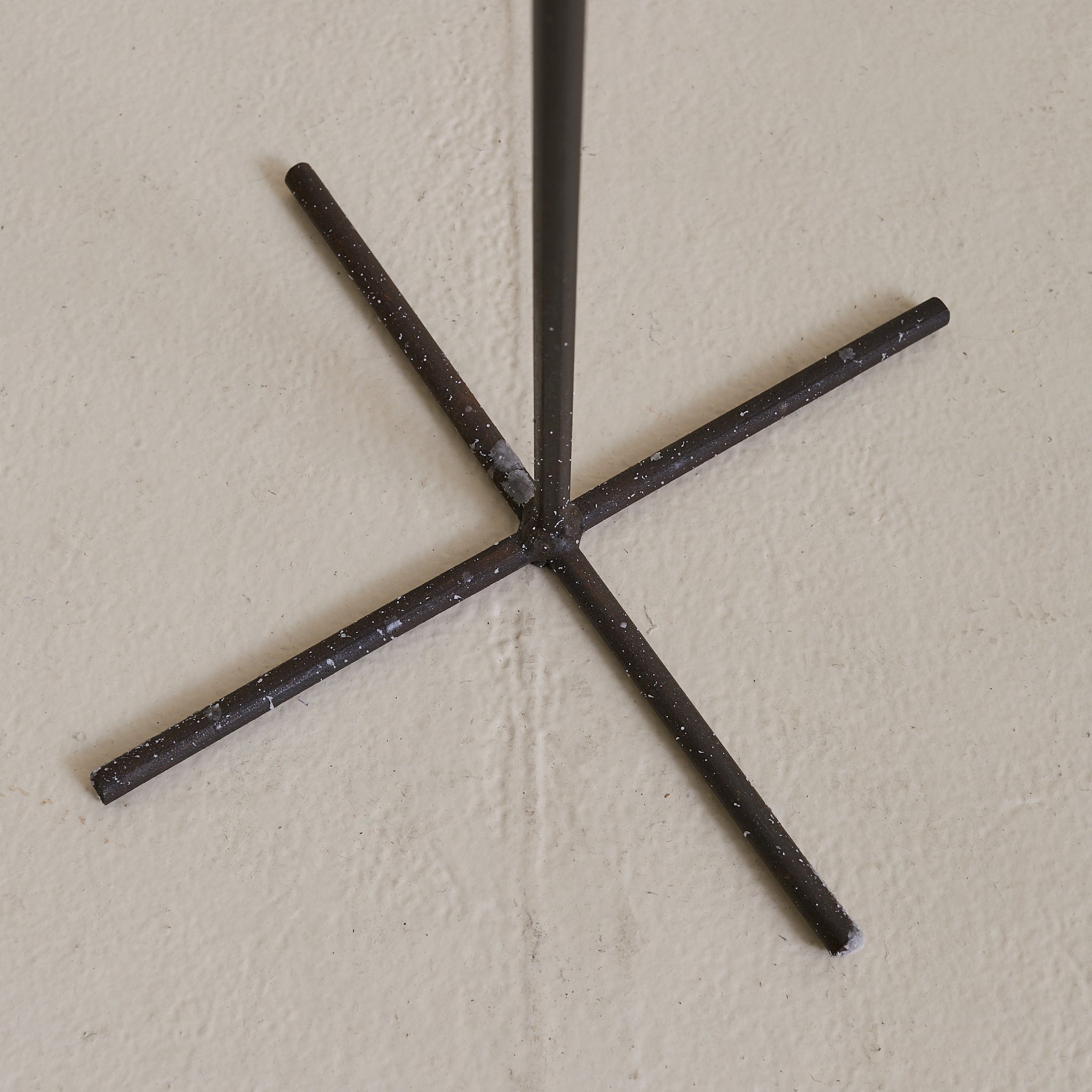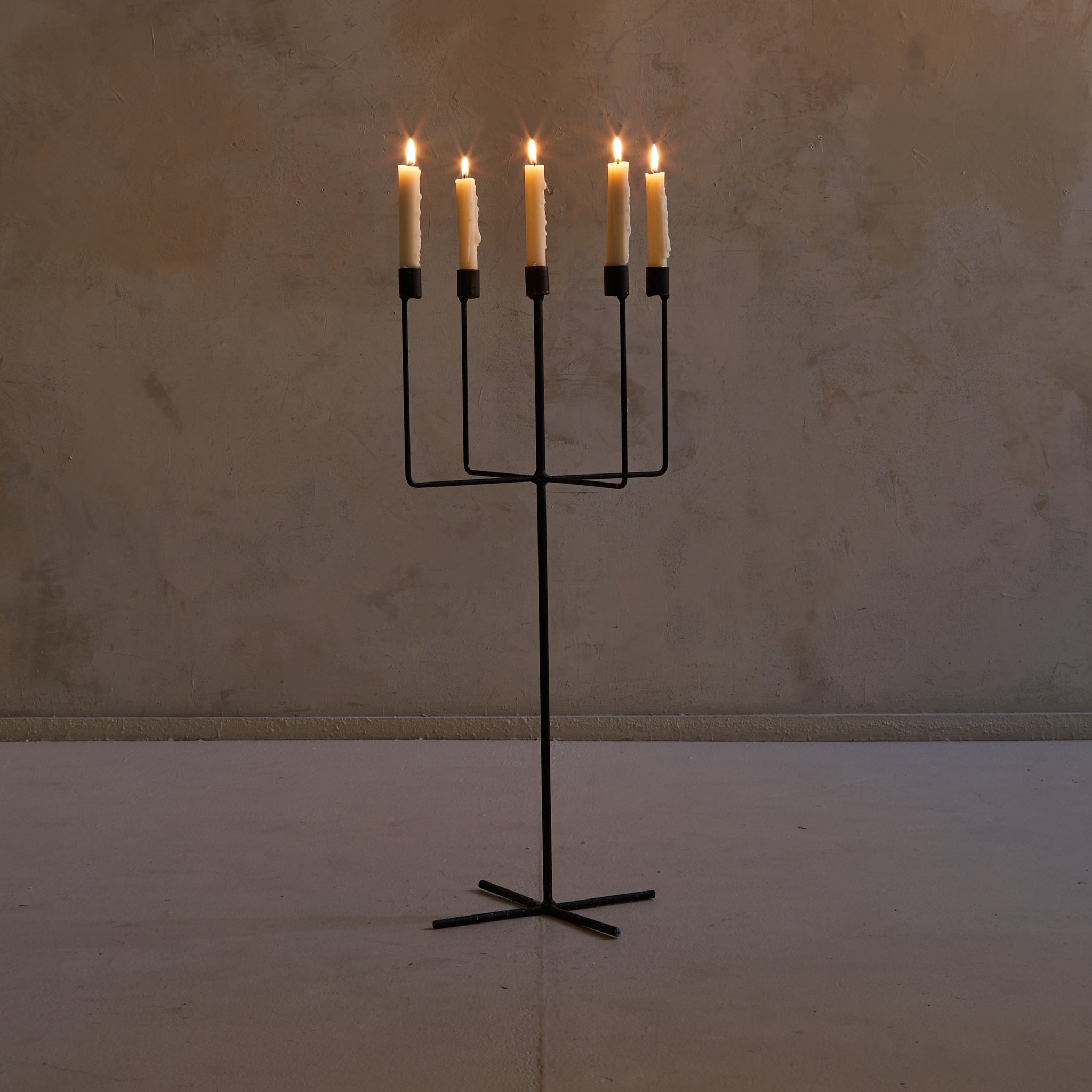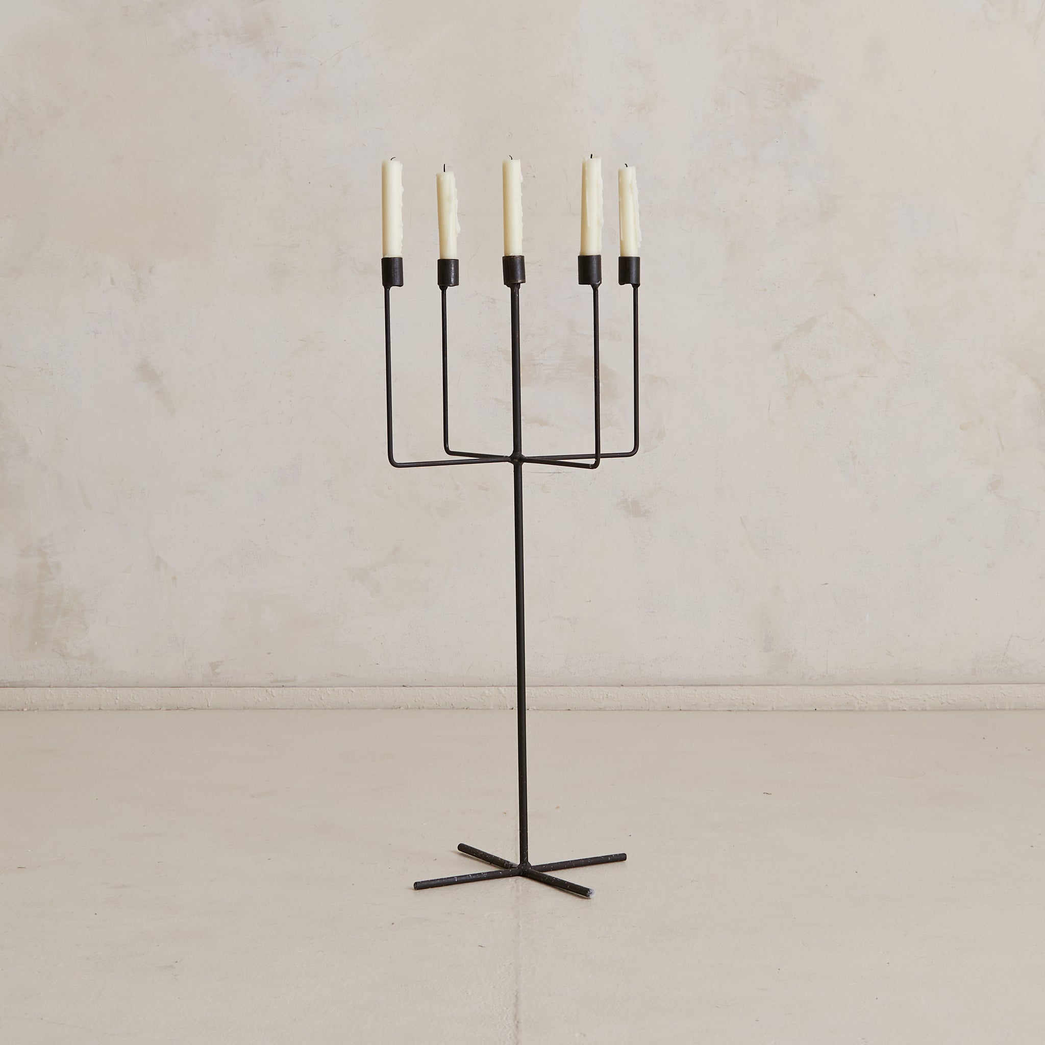 A tall French floor candelabra from the 1960s, constructed in welded iron with a dark, timeworn patina. Five candle cups rise evenly from a minimal armature—linear, upright, almost architectural in composition—anchored by a simple star-shaped base. Graphic and elemental, it reads as sculpture by day and a quiet beacon by night.