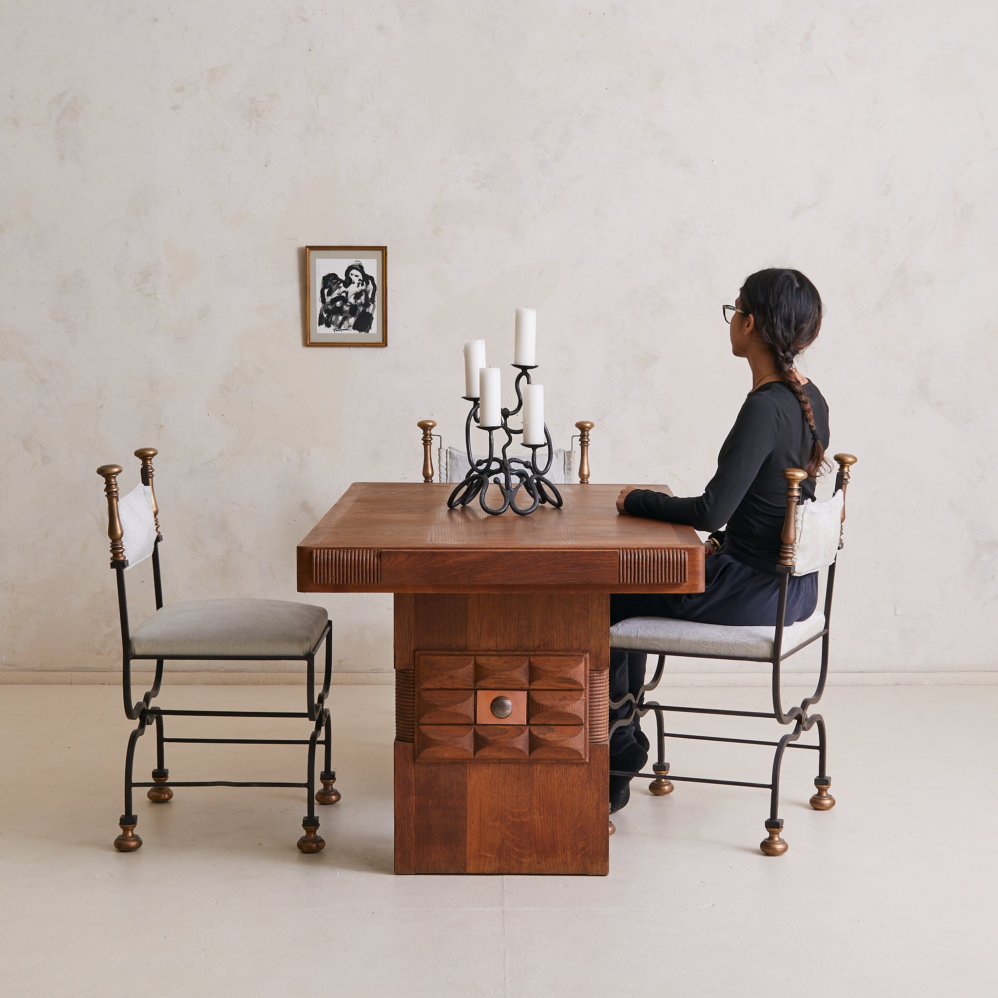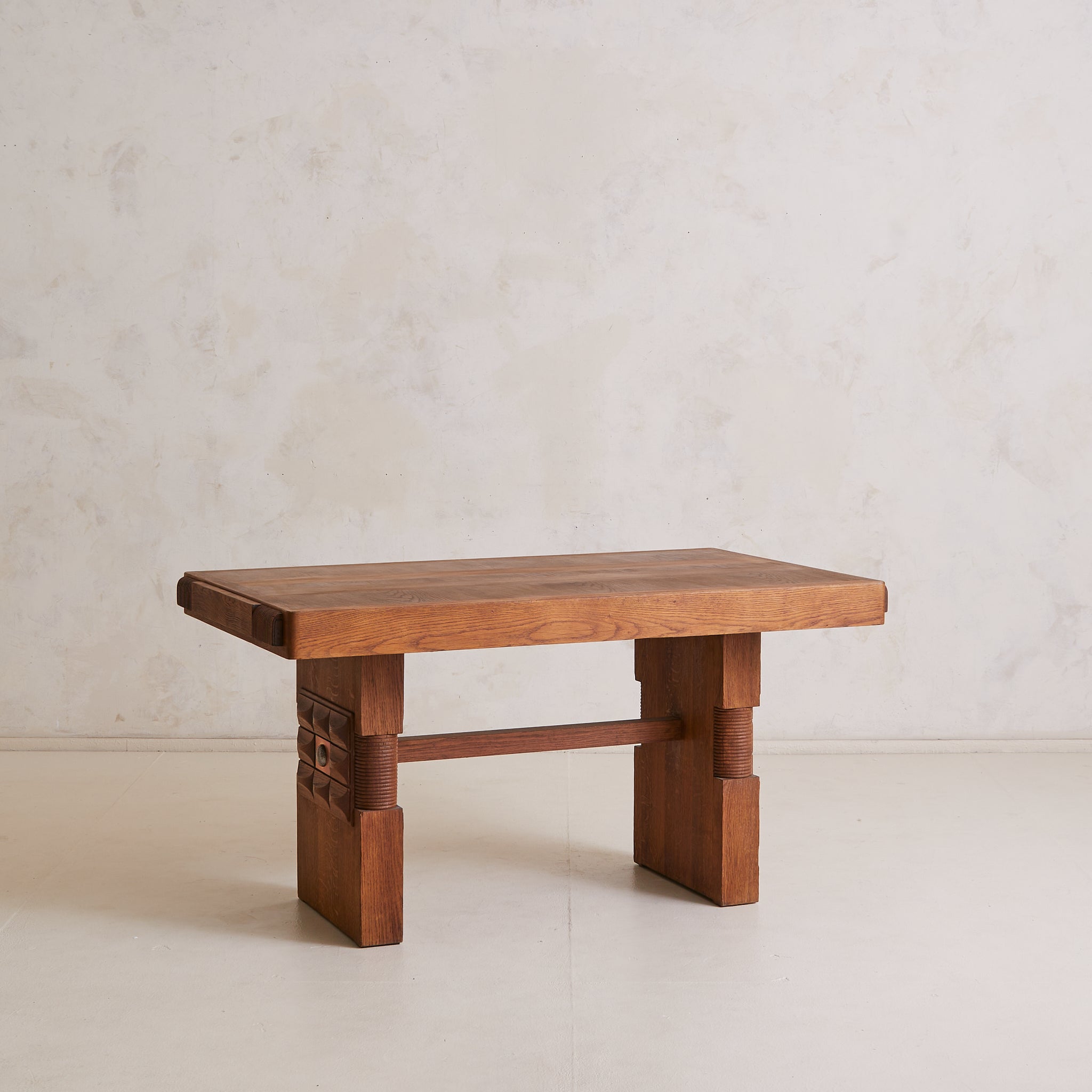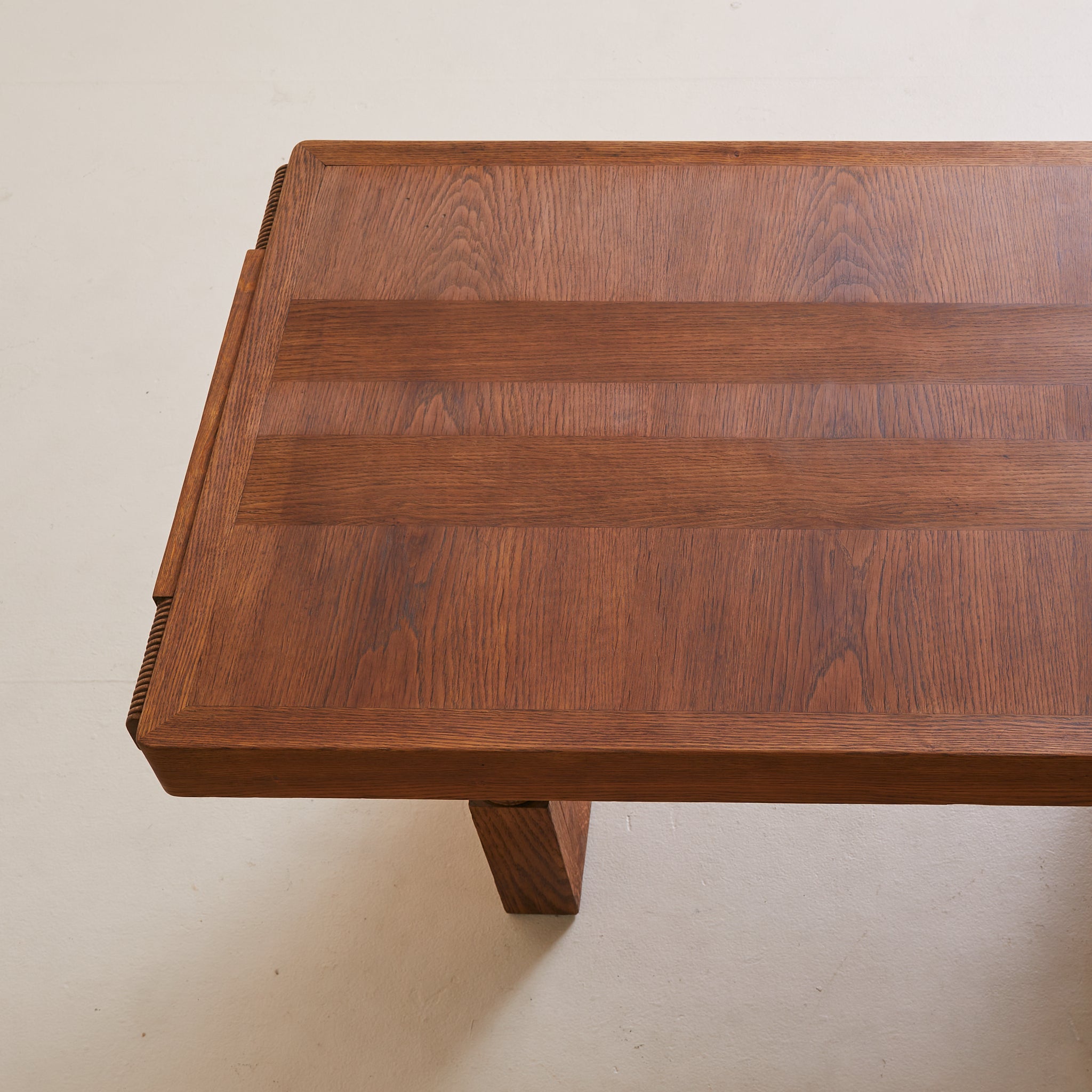 Designed in the 1940s by Charles Dudouyt, this versatile table exemplifies the French modernist’s thoughtful craftsmanship and sculptural vocabulary, rendered in oak. The solid frame features a thick top with subtle inlay work, its proportions balanced and intentional.