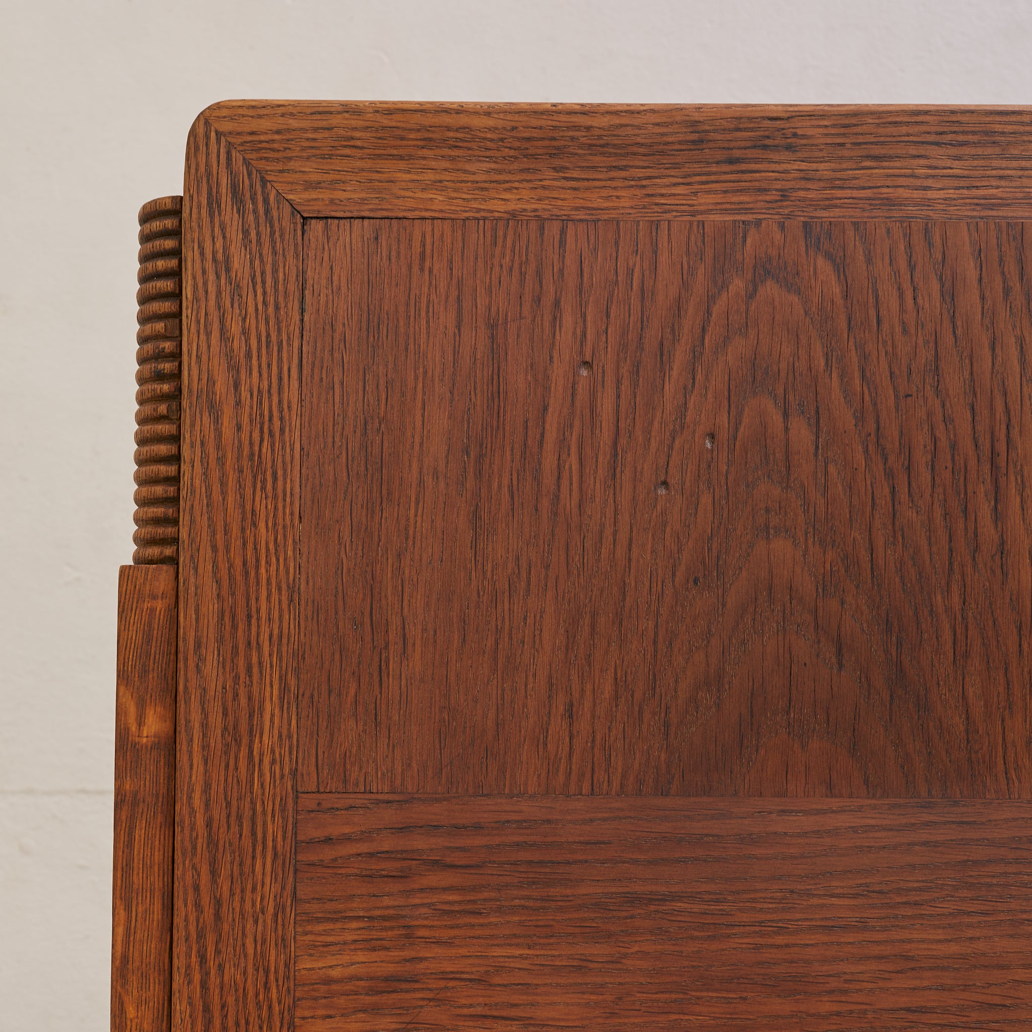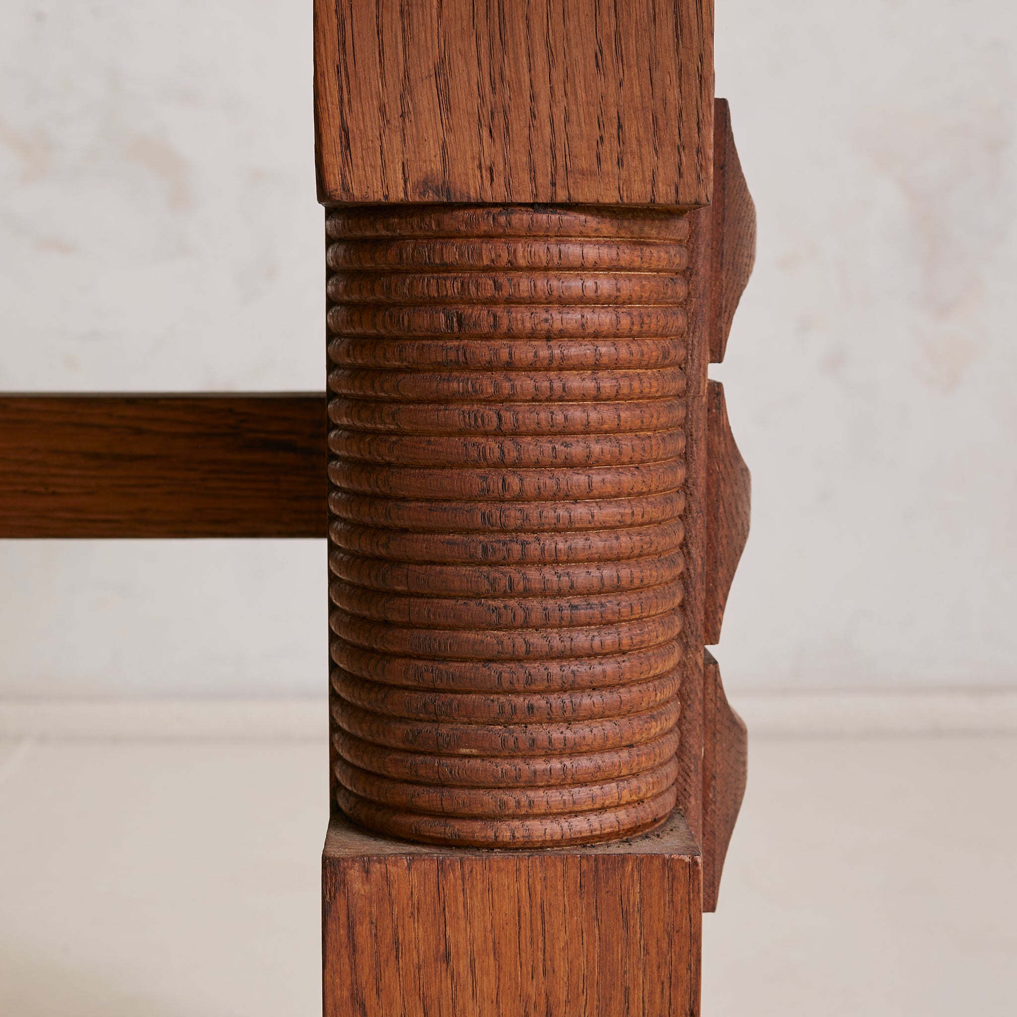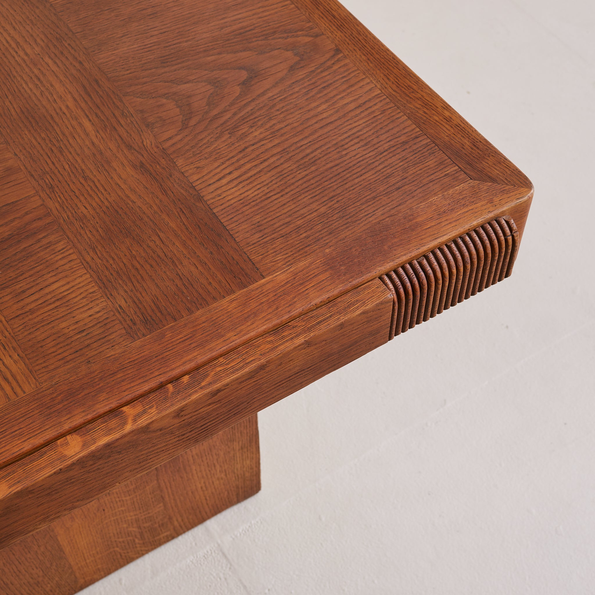 Designed in the 1940s by Charles Dudouyt, this versatile table exemplifies the French modernist’s thoughtful craftsmanship and sculptural vocabulary, rendered in oak. The solid frame features a thick top with subtle inlay work, its proportions balanced and intentional.