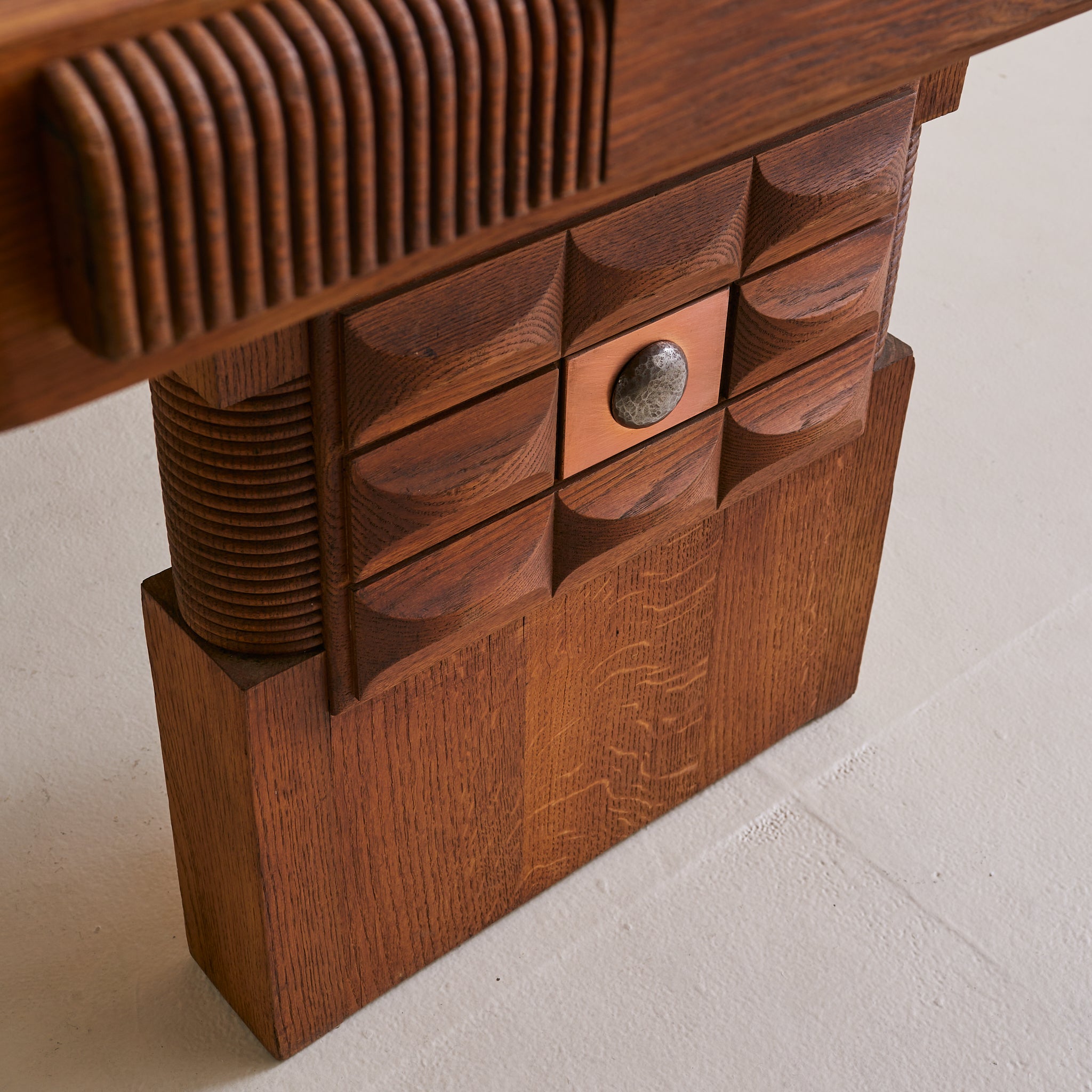 The base is where Dudouyt’s hand is most felt—each leg carved with rhythmic ribbing, decorative panels raised in relief, and insets of warm copper punctuated by silver-toned medallions. These details add texture and presence without overwhelming the form, a signature of Dudouyt’s restrained yet expressive style.