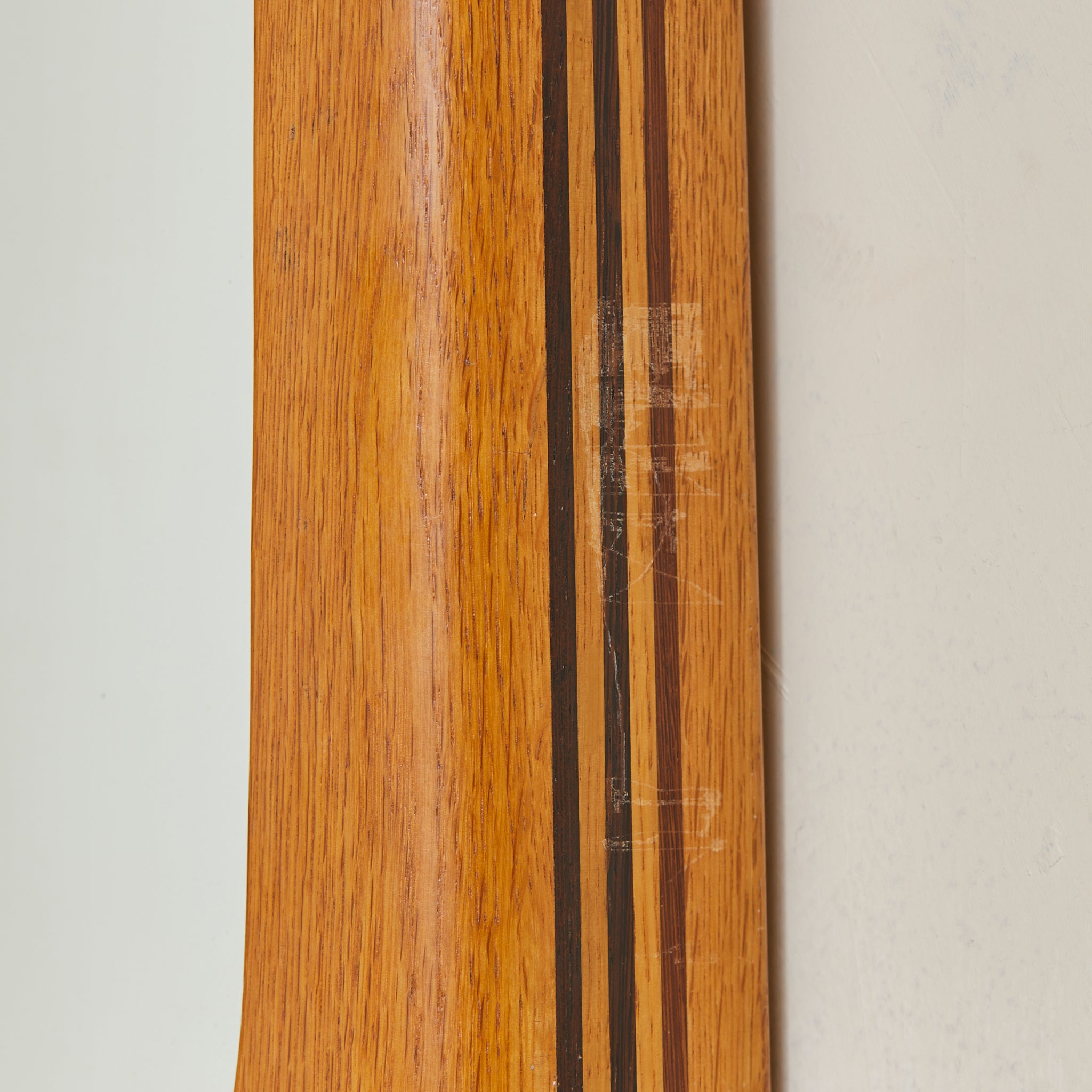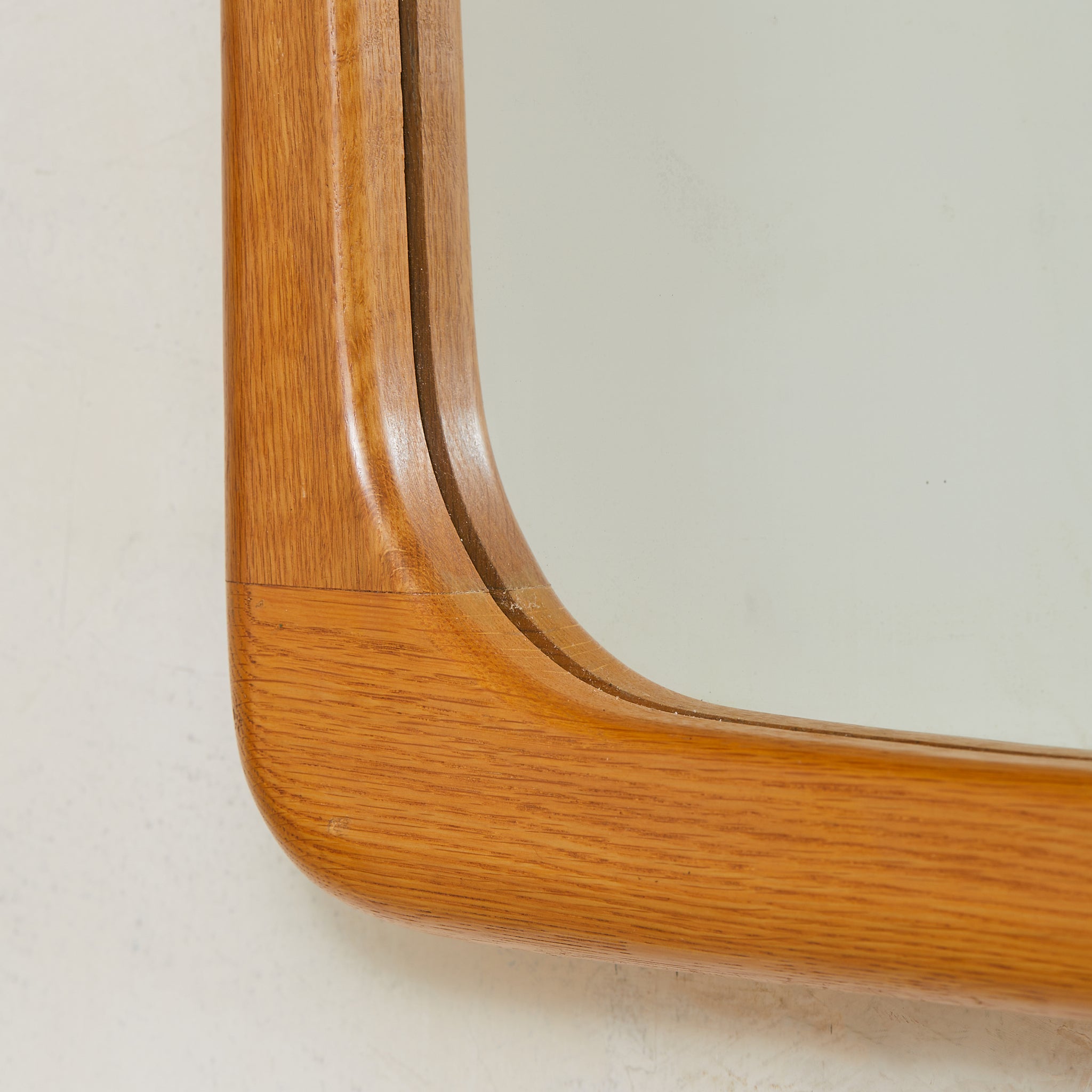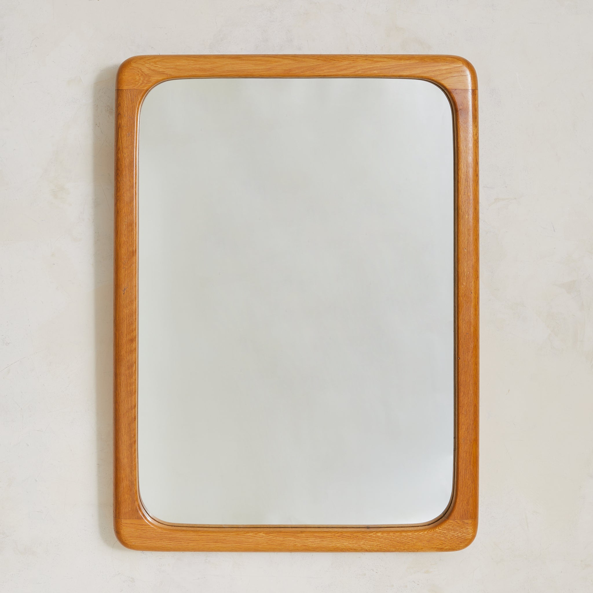 Handcrafted in France in the 1960s, this wall mirror is defined by gentle curvature and thoughtful detail. Its rounded rectangular frame is sculpted from golden oak, accented with subtle inlaid woodwork in a deeper tone—an understated contrast that draws the eye without overwhelming.