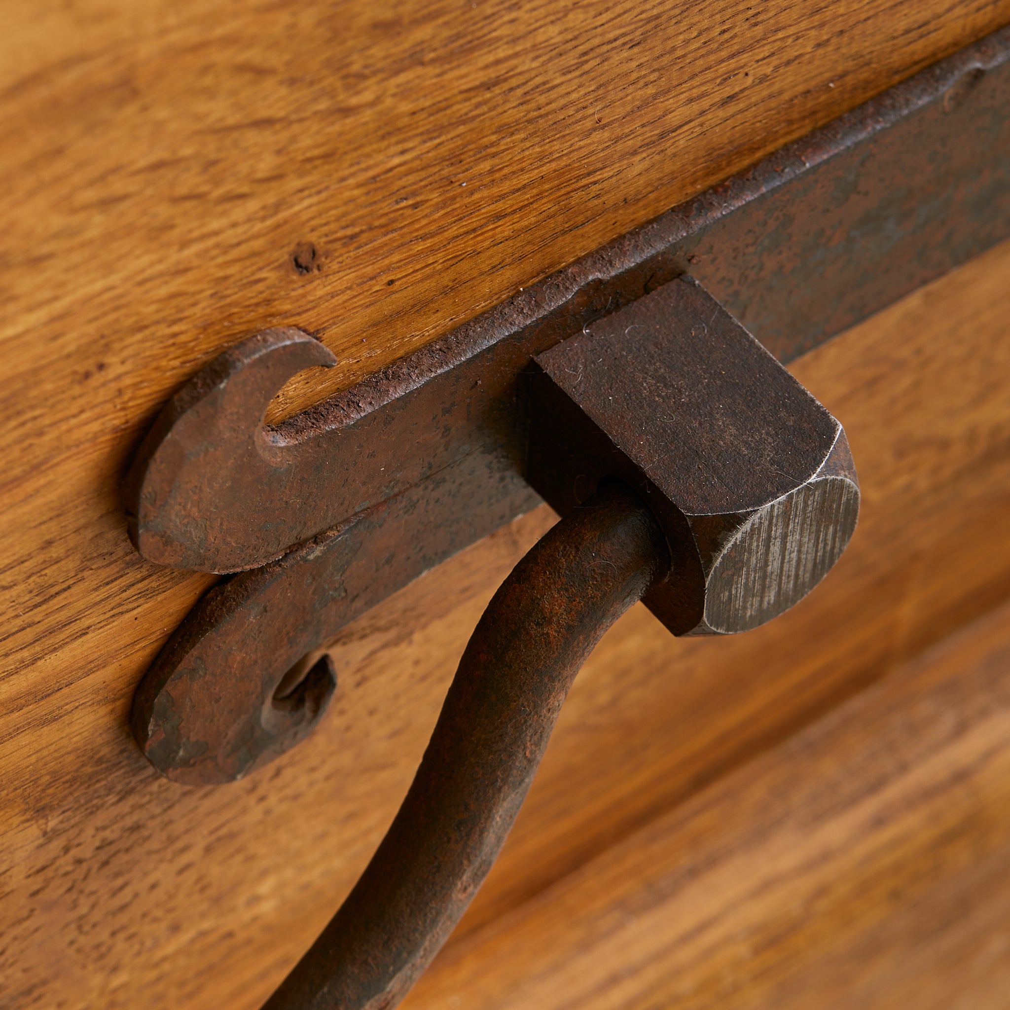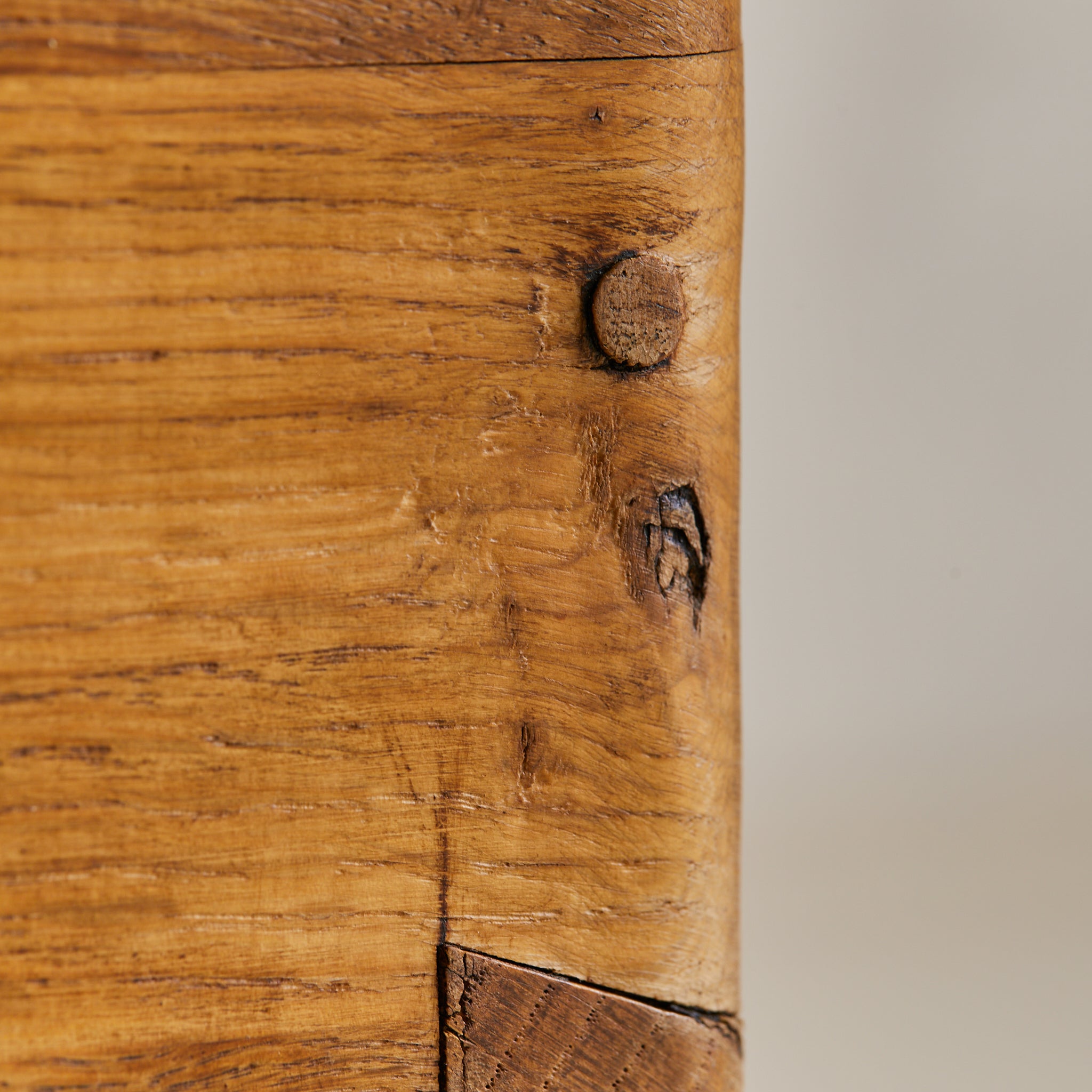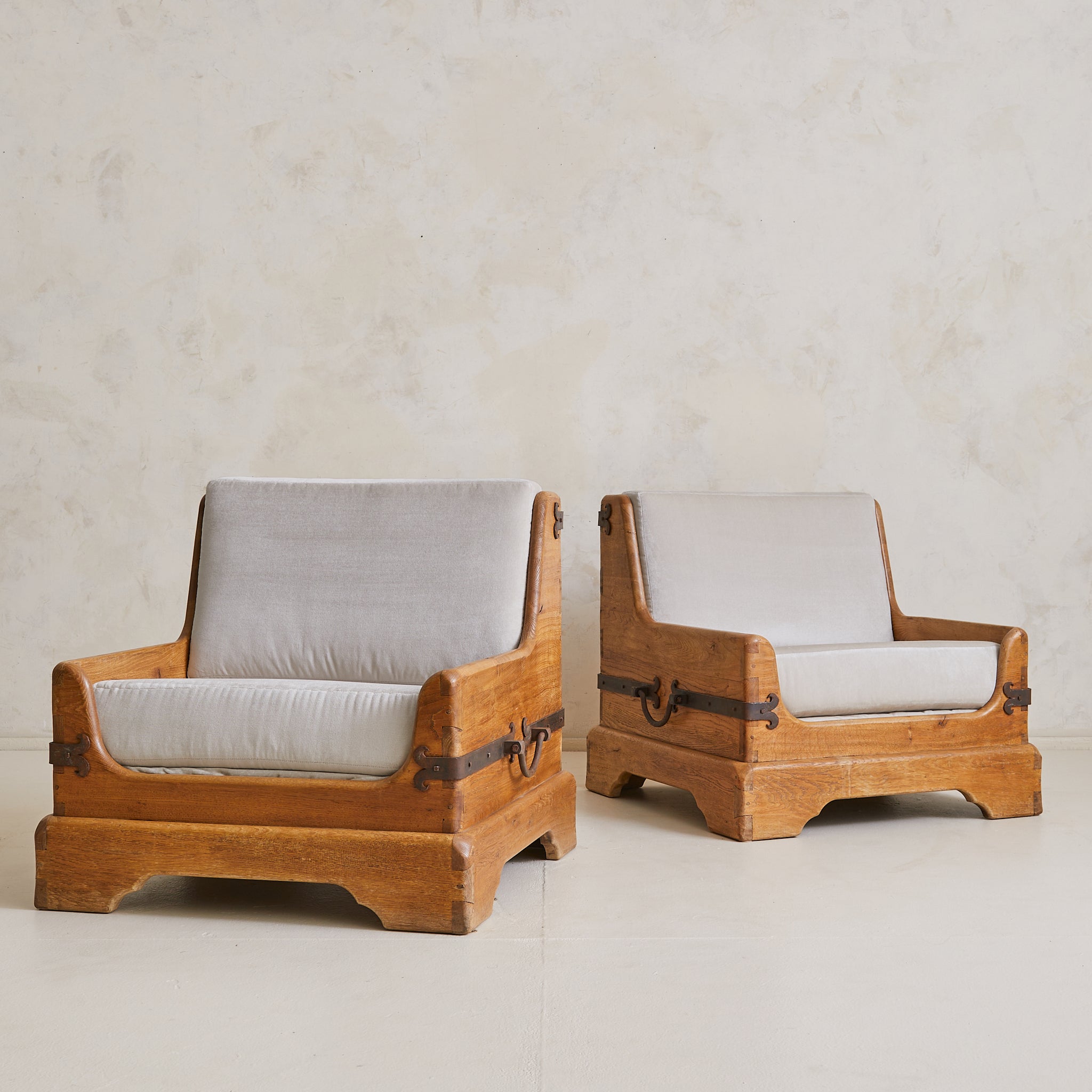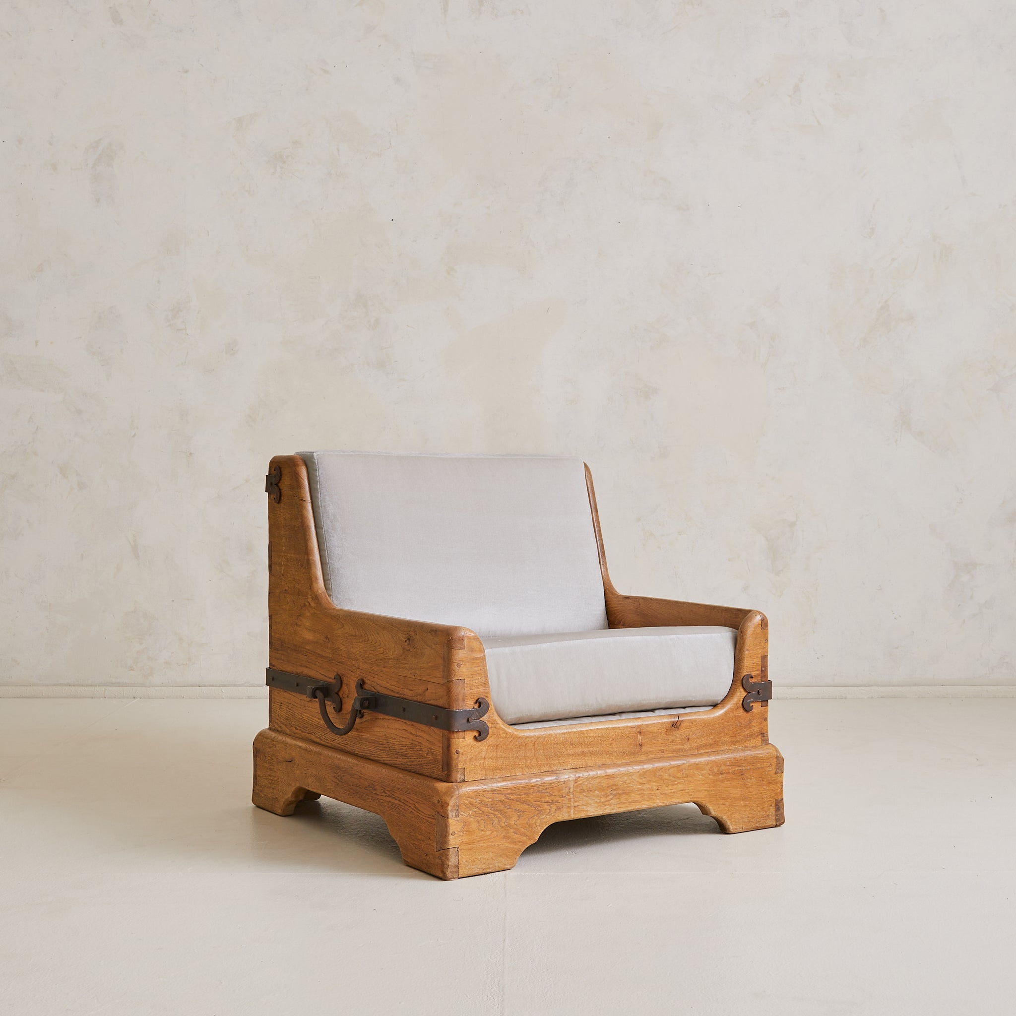 A 1950s French armchair hewn from solid oak, its architectural frame defined by weighty proportions and hand-forged iron hardware. Exposed dovetail joinery and a timeworn surface bear witness to decades of use, with a rich patina that deepens its character.