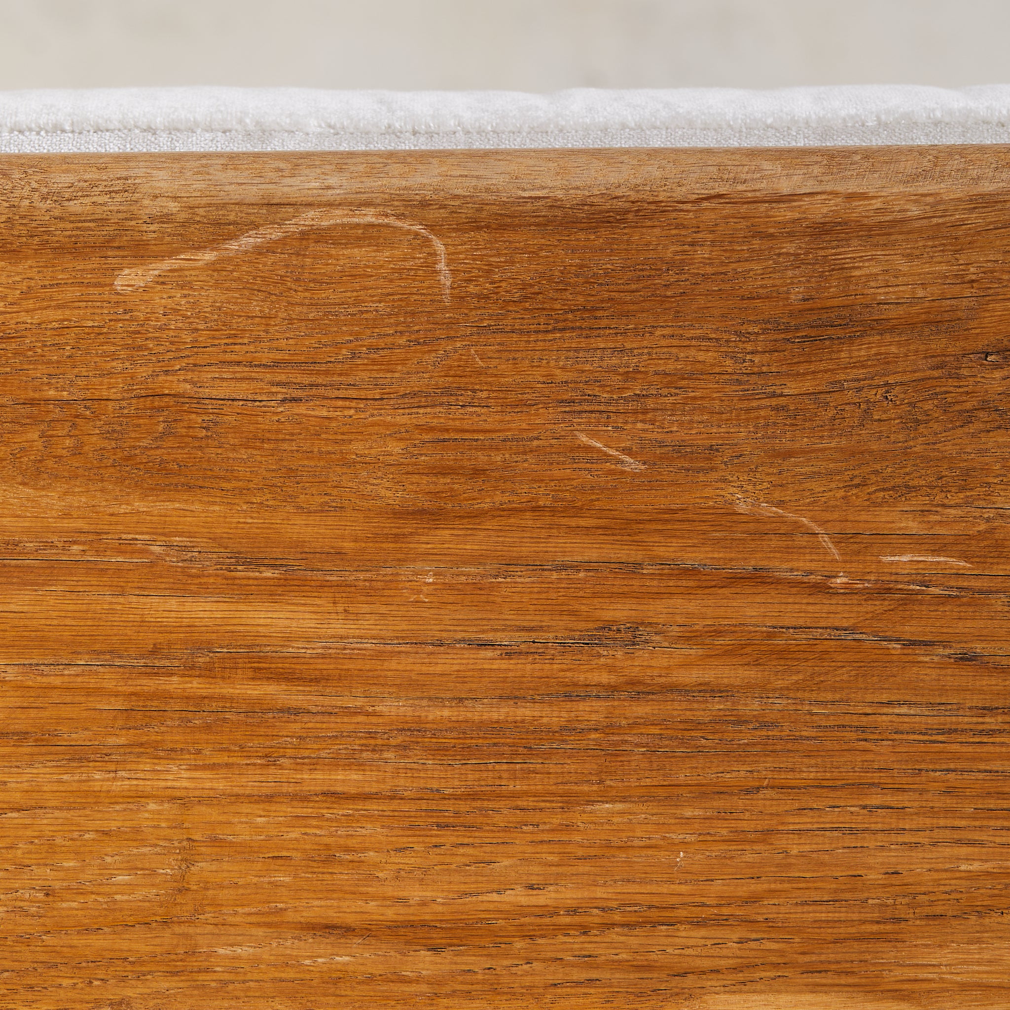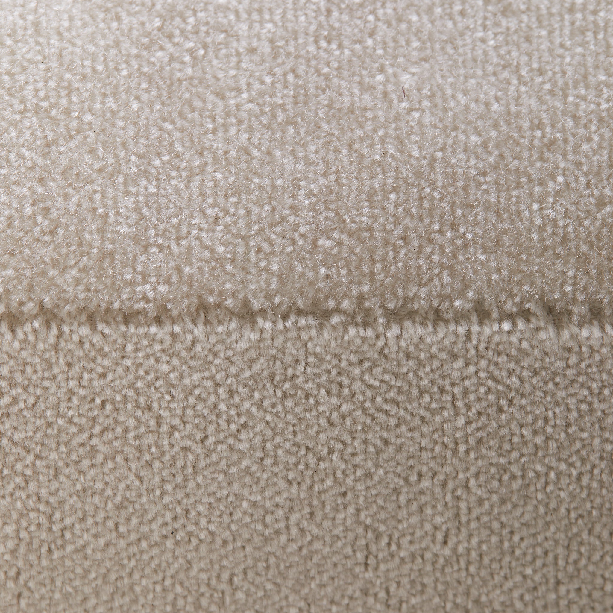Newly upholstered in soft almond cotton velvet, the medium-density foam cushions provide a plush counterpoint to the chair’s rugged, sculptural form.