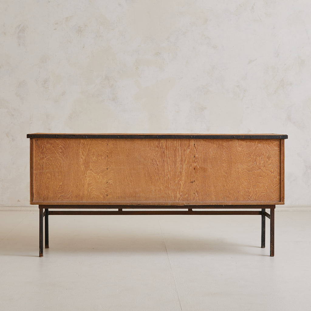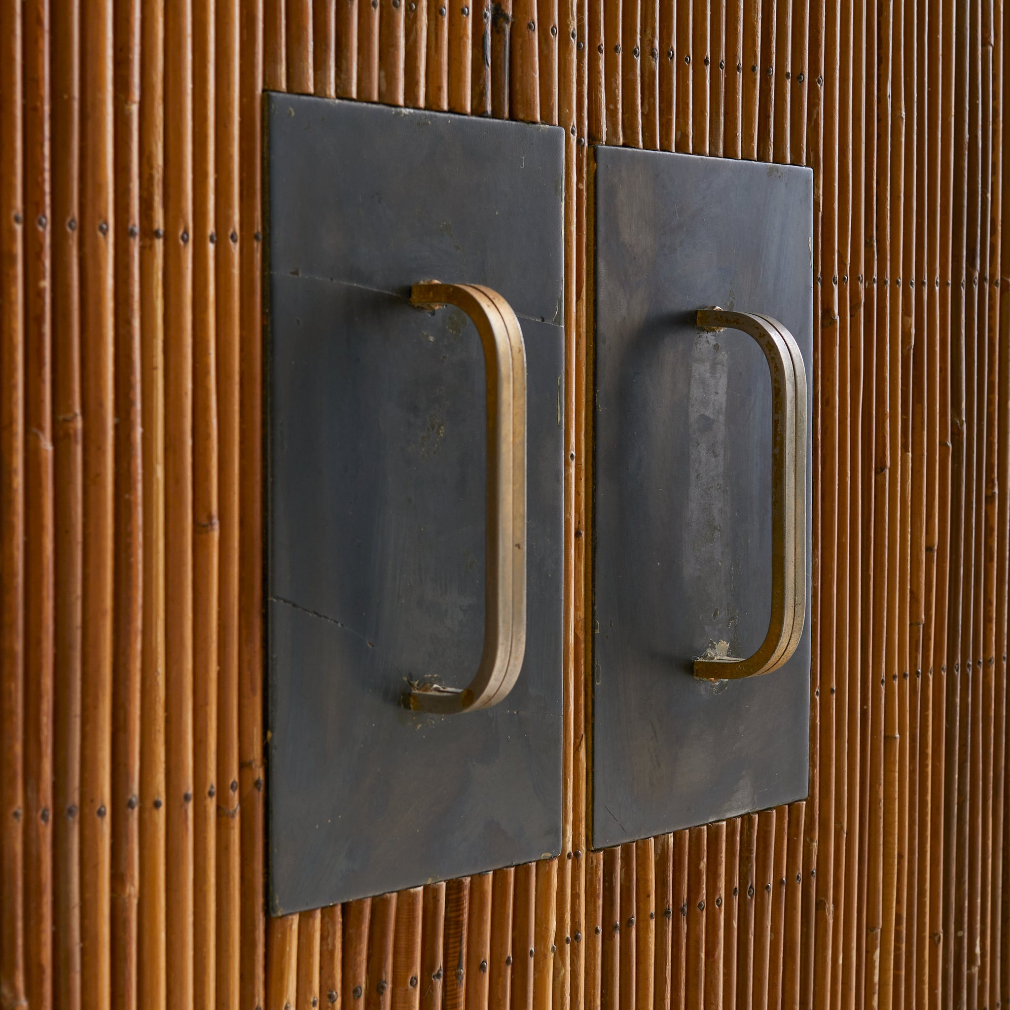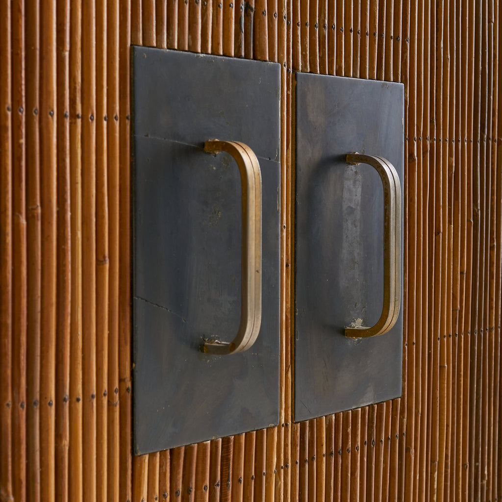 Crafted in France in the 1960s, this low sideboard is a striking study in material rhythm and sculptural restraint. Vertical runs of hand‑split pencil reed cloak the pine case—top, sides, drawers, and doors—creating a unified, textural skin in warm ochre tones. The stepped arrangement of three drawers and central double doors introduces a graphic cadence, punctuated by patinated steel escutcheons and curved pulls—gestures that nod unmistakably to the design language of Audoux‑Minet.