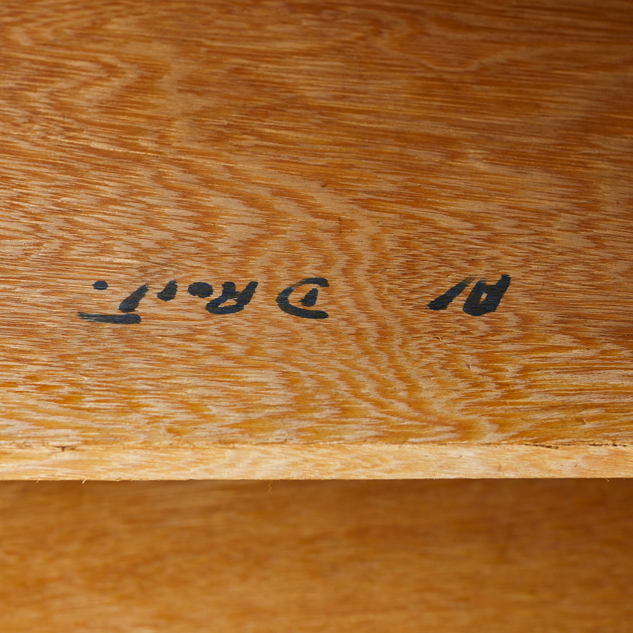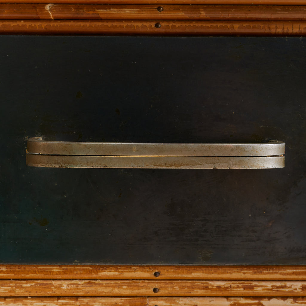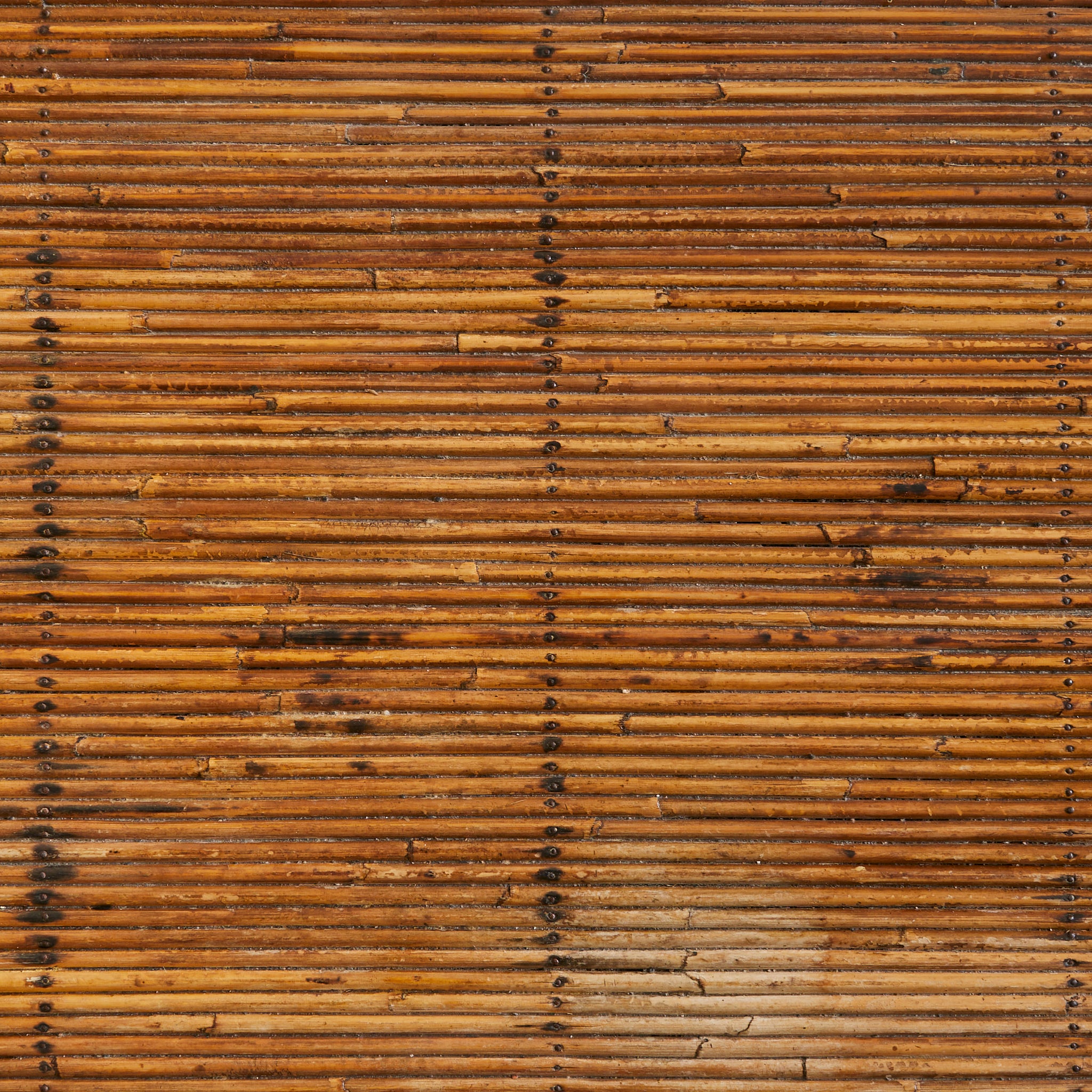 Crafted in France in the 1960s, this low sideboard is a striking study in material rhythm and sculptural restraint. Vertical runs of hand‑split pencil reed cloak the pine case—top, sides, drawers, and doors—creating a unified, textural skin in warm ochre tones. The stepped arrangement of three drawers and central double doors introduces a graphic cadence, punctuated by patinated steel escutcheons and curved pulls—gestures that nod unmistakably to the design language of Audoux‑Minet.