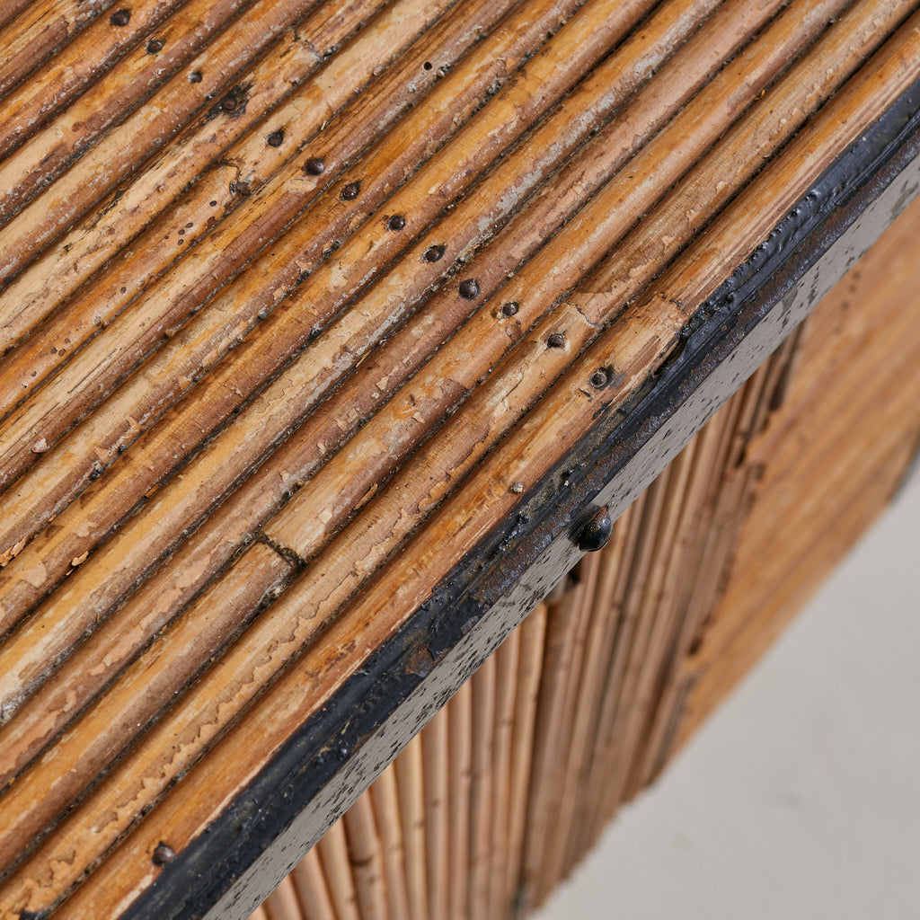 The forged-iron sled base anchors the form, its industrial lines providing a sharp counterpoint to the organic reed surface. Rustic yet architectural, the piece reflects a uniquely French postwar sensibility—where artisanal craft meets modernist volume.