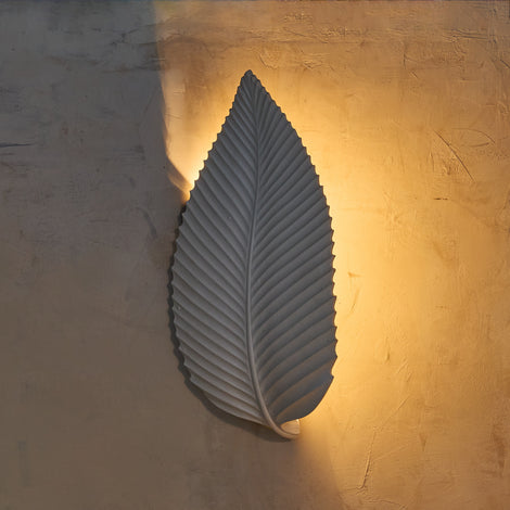 A 1970s French leaf sconce, crafted entirely from plaster. The sconce features a curved leaf motif shade with realistic textural details. It can be hung horizontally or vertically and mounts directly to the wall without the need for a backplate.