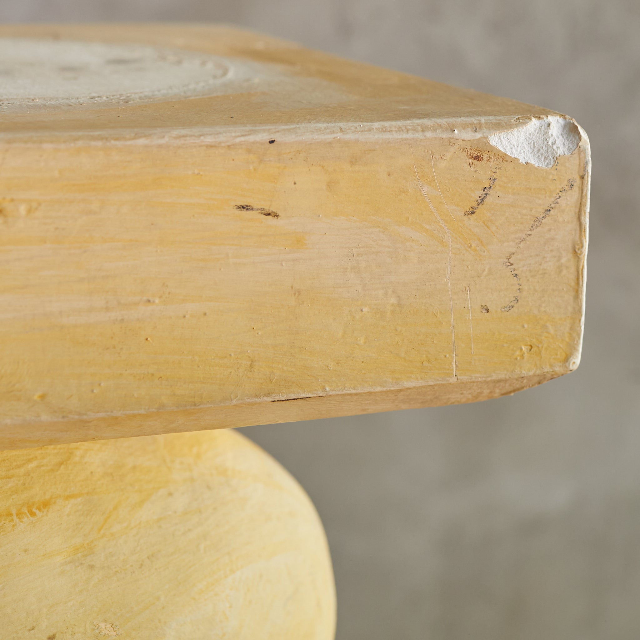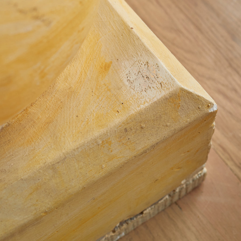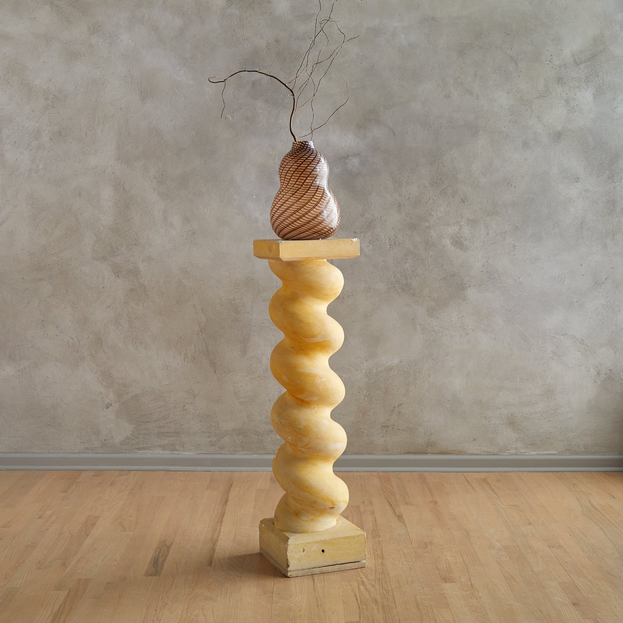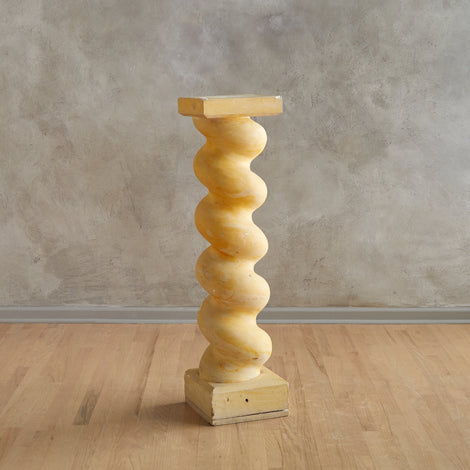 This 1980s French pedestal features a playful spiral silhouette rendered in plaster and set on a sturdy wooden base. Its totemic shape and soft ochre finish lend architectural interest—ideal for displaying art, plants, or standing on its own as a statement object.