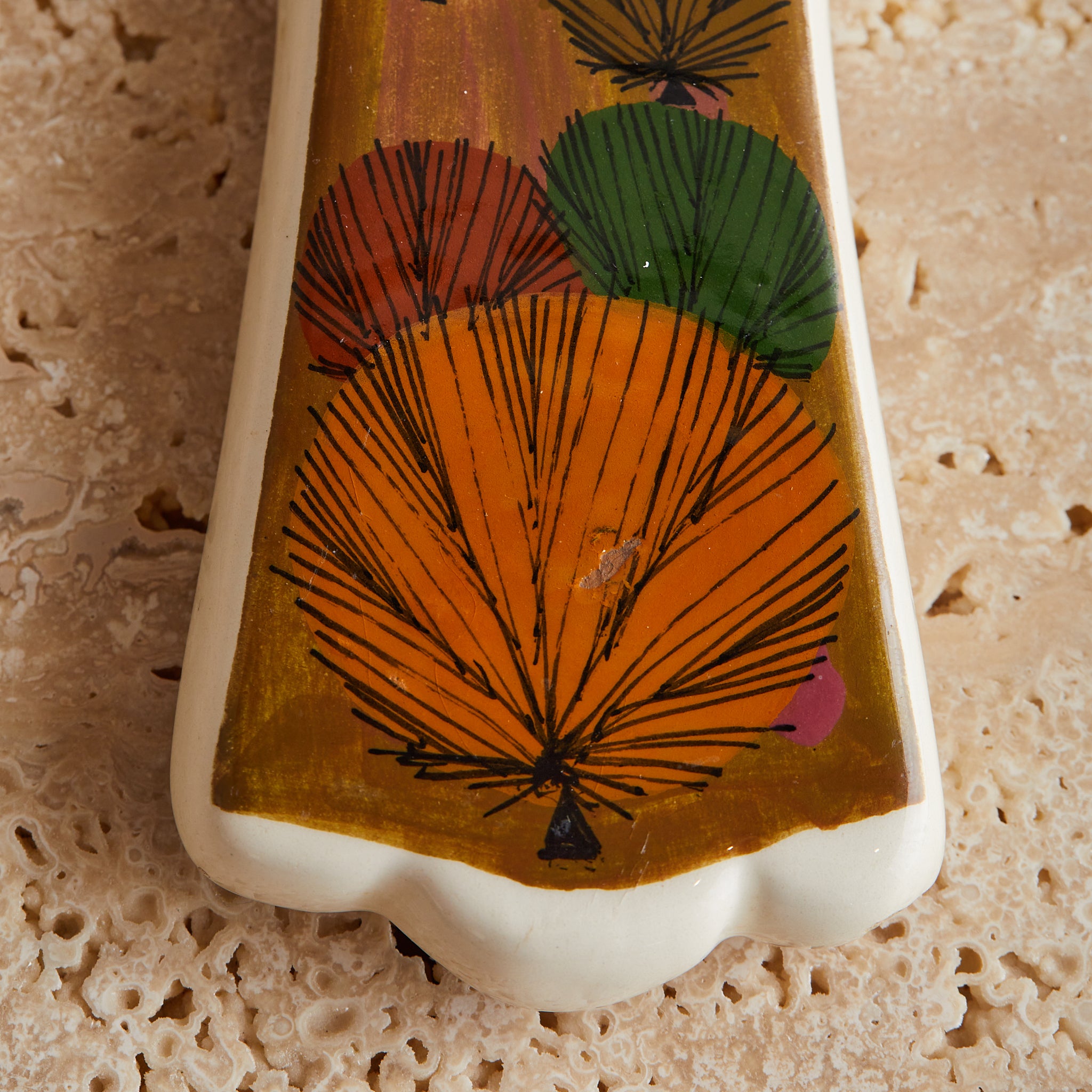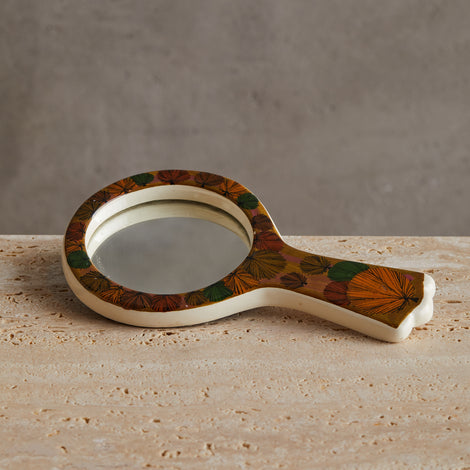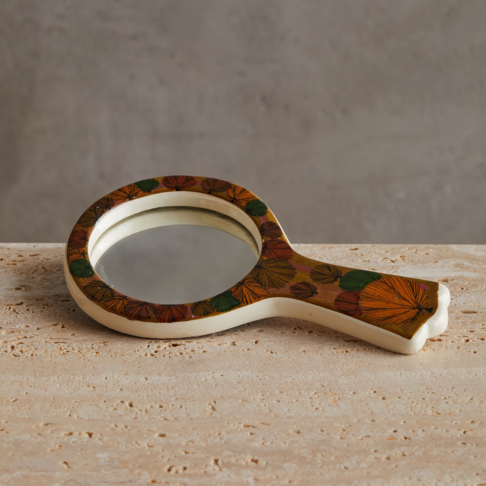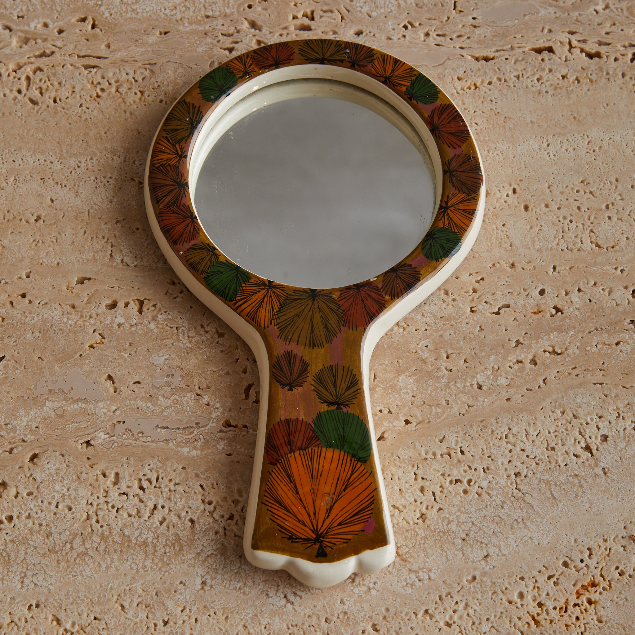 A French ceramic hand mirror, dating to the 1960s. The ivory-toned frame is hand-painted with abstract floral motifs in burnt orange, forest green, and ochre—each form etched in black. Signed on the reverse.