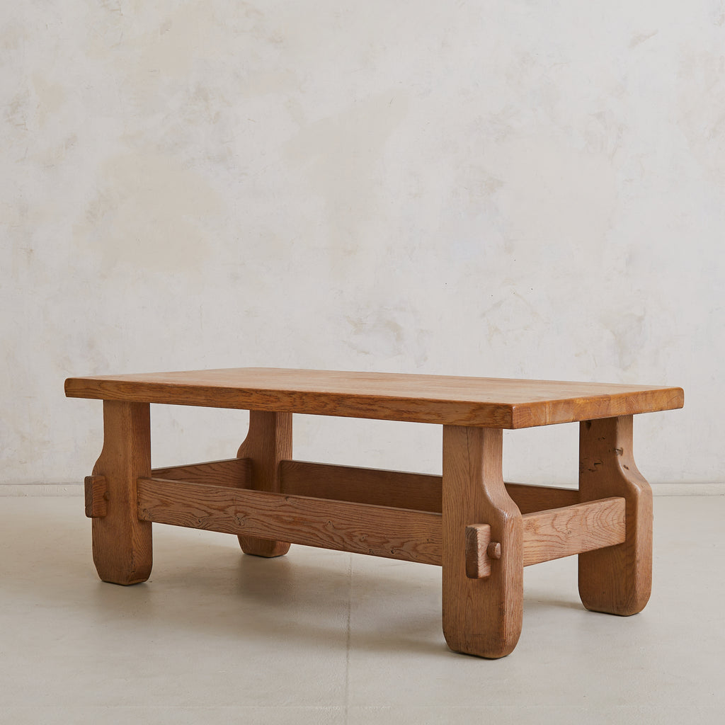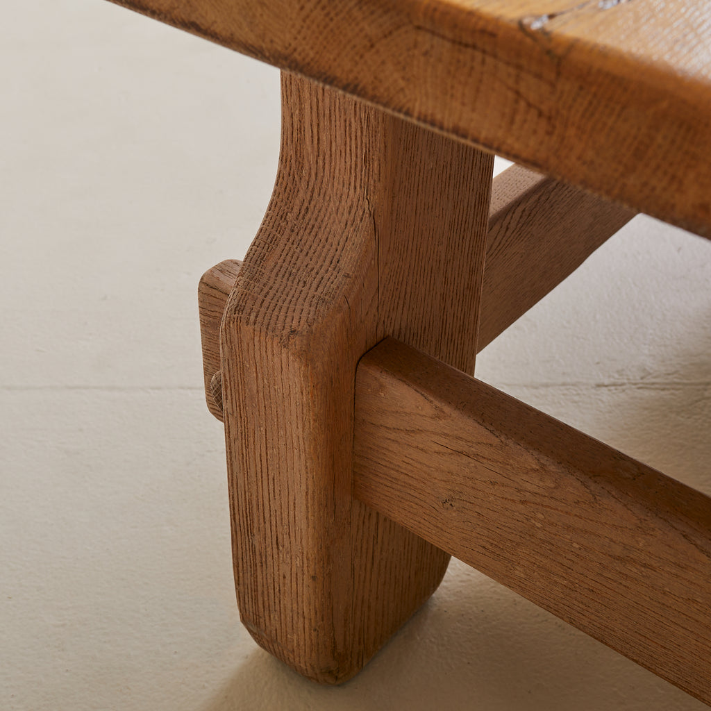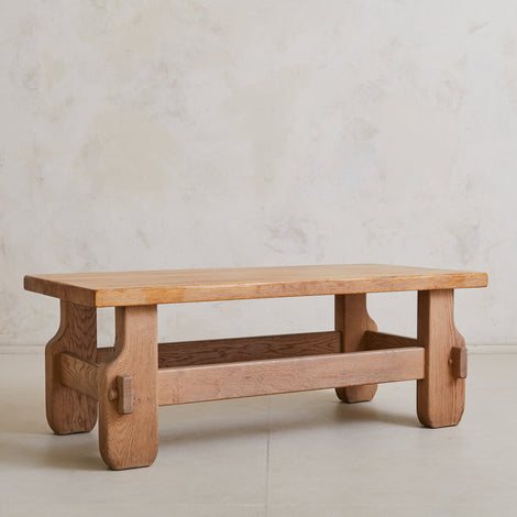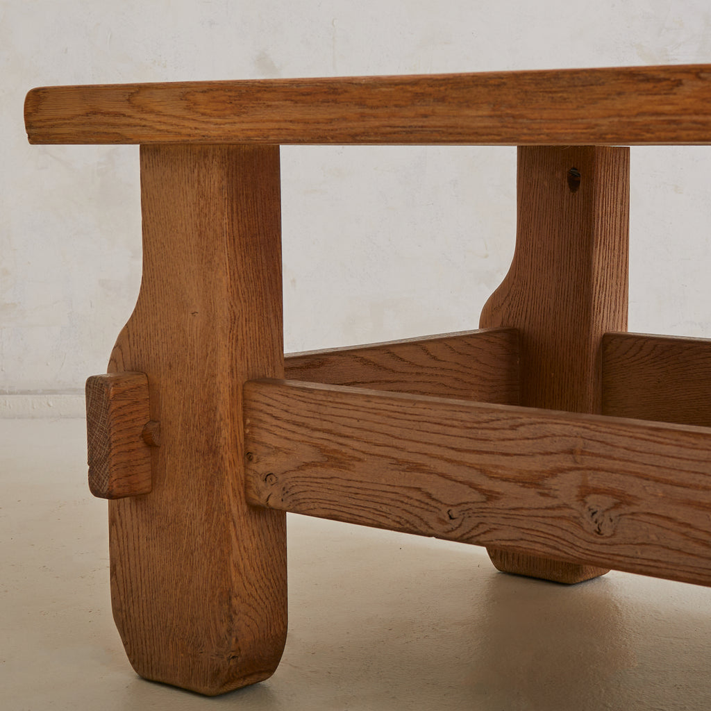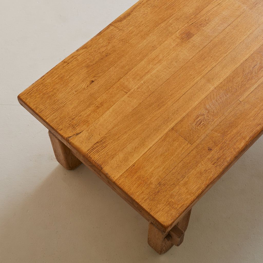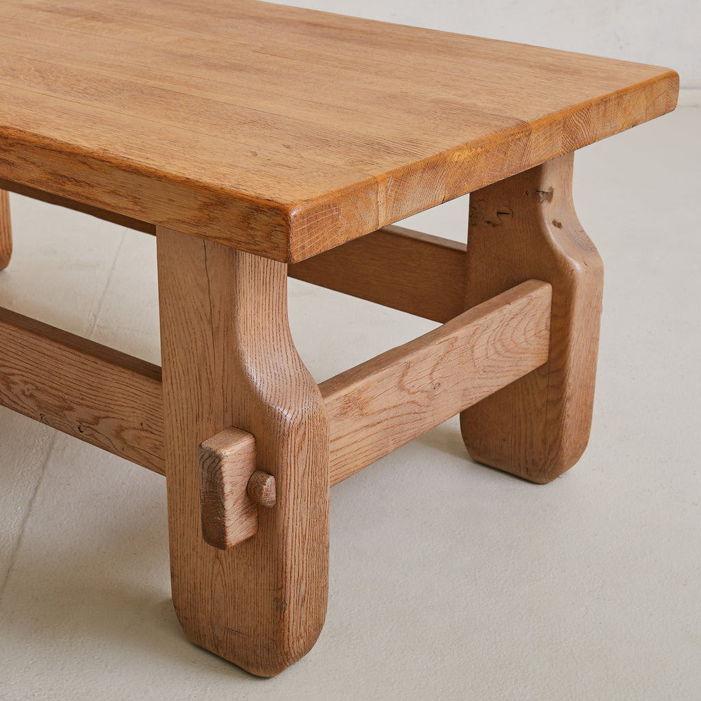 This French coffee table from the 1960s is rendered in solid oak with an architectural clarity that feels both grounded and elevated. The rectangular top is generously scaled yet restrained, resting on bold, sculpted legs joined with impeccable precision.