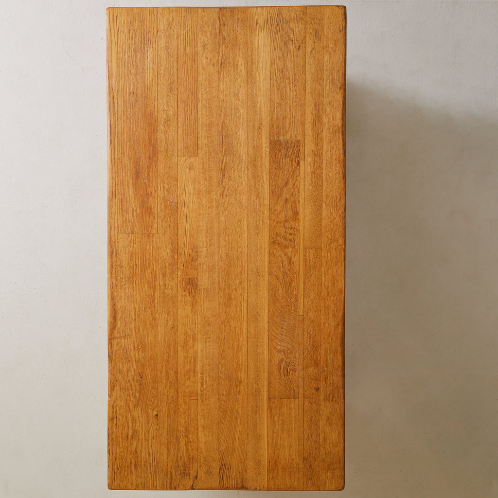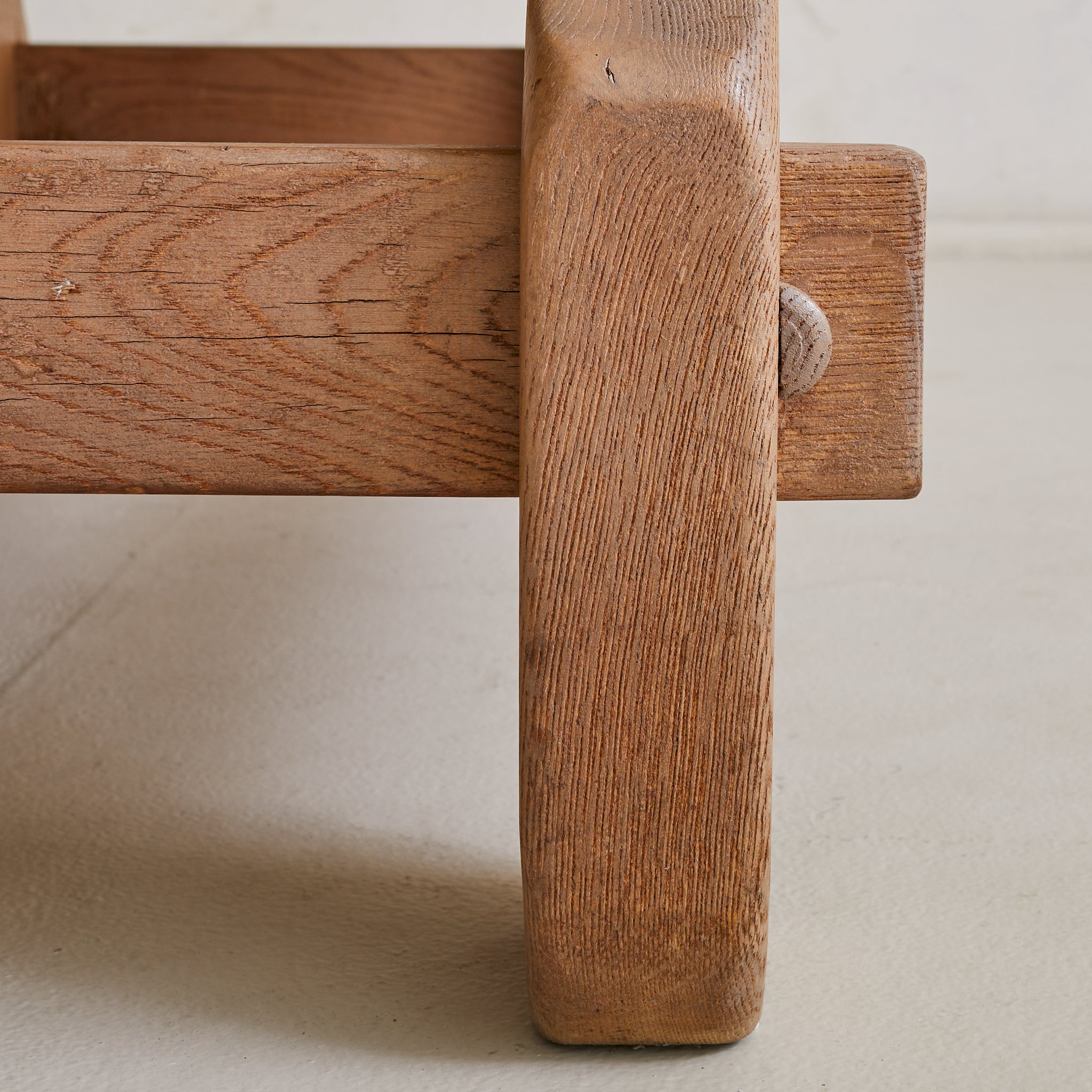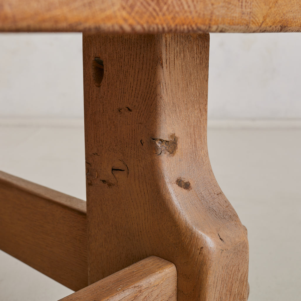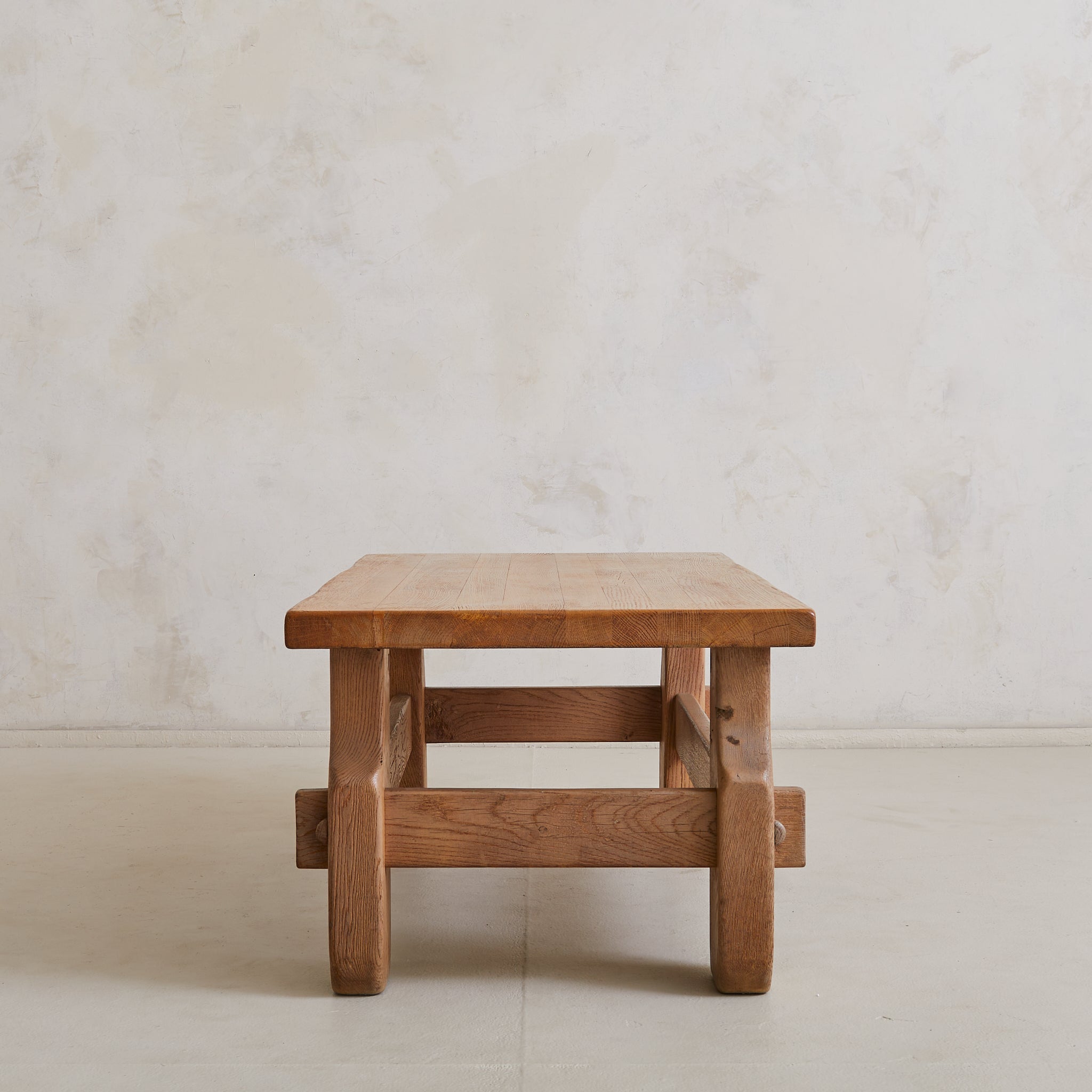 This French coffee table from the 1960s is rendered in solid oak with an architectural clarity that feels both grounded and elevated. The rectangular top is generously scaled yet restrained, resting on bold, sculpted legs joined with impeccable precision.