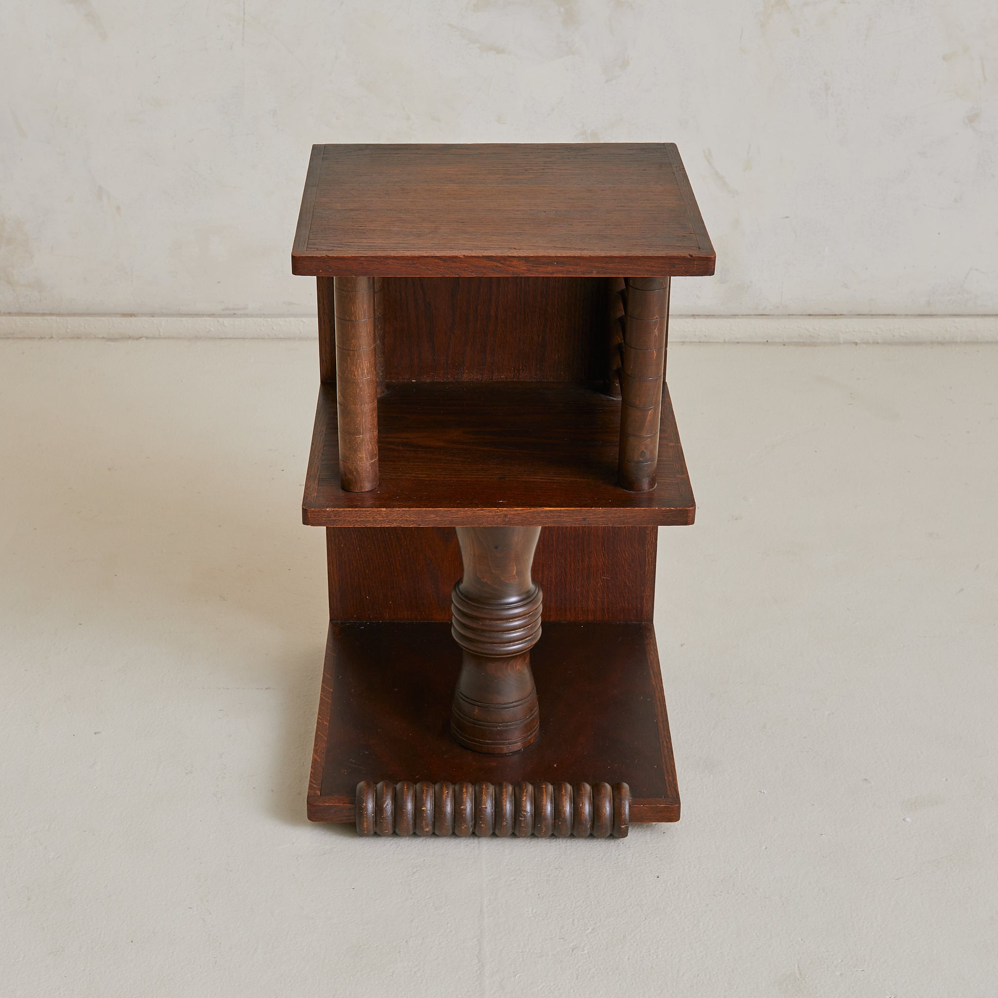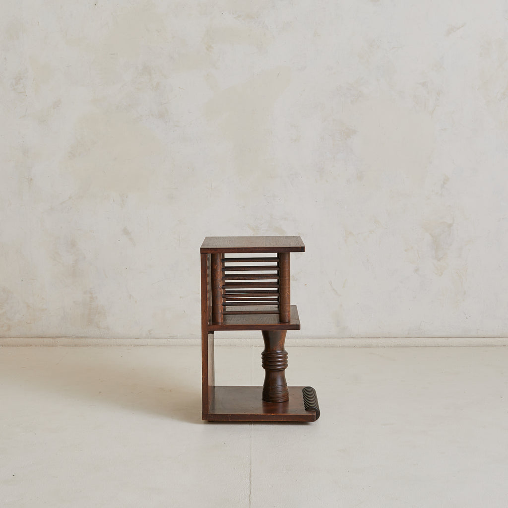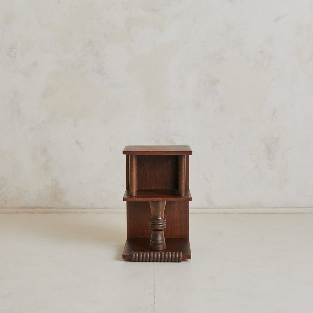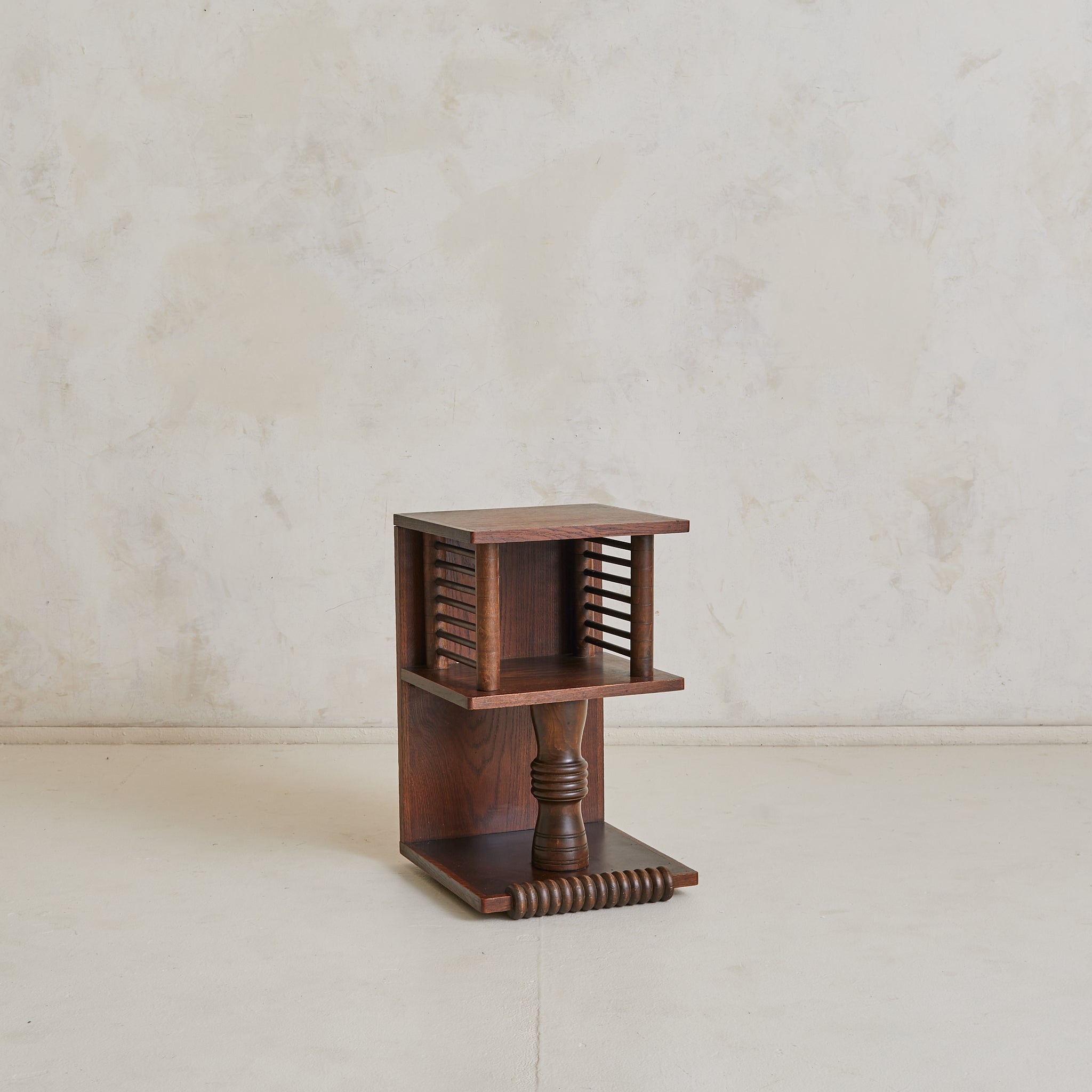 A compact study in rhythm and relief, this solid oak side table channels the sculptural vocabulary of French modernist Charles Dudouyt—where architectural planes meet playful bobbin accents. A square top floats above an open cubby framed by vertical spool rails; below, a tapered baluster support rests on a stepped plinth base, creating a stacked rhythm that holds visual weight from every angle.