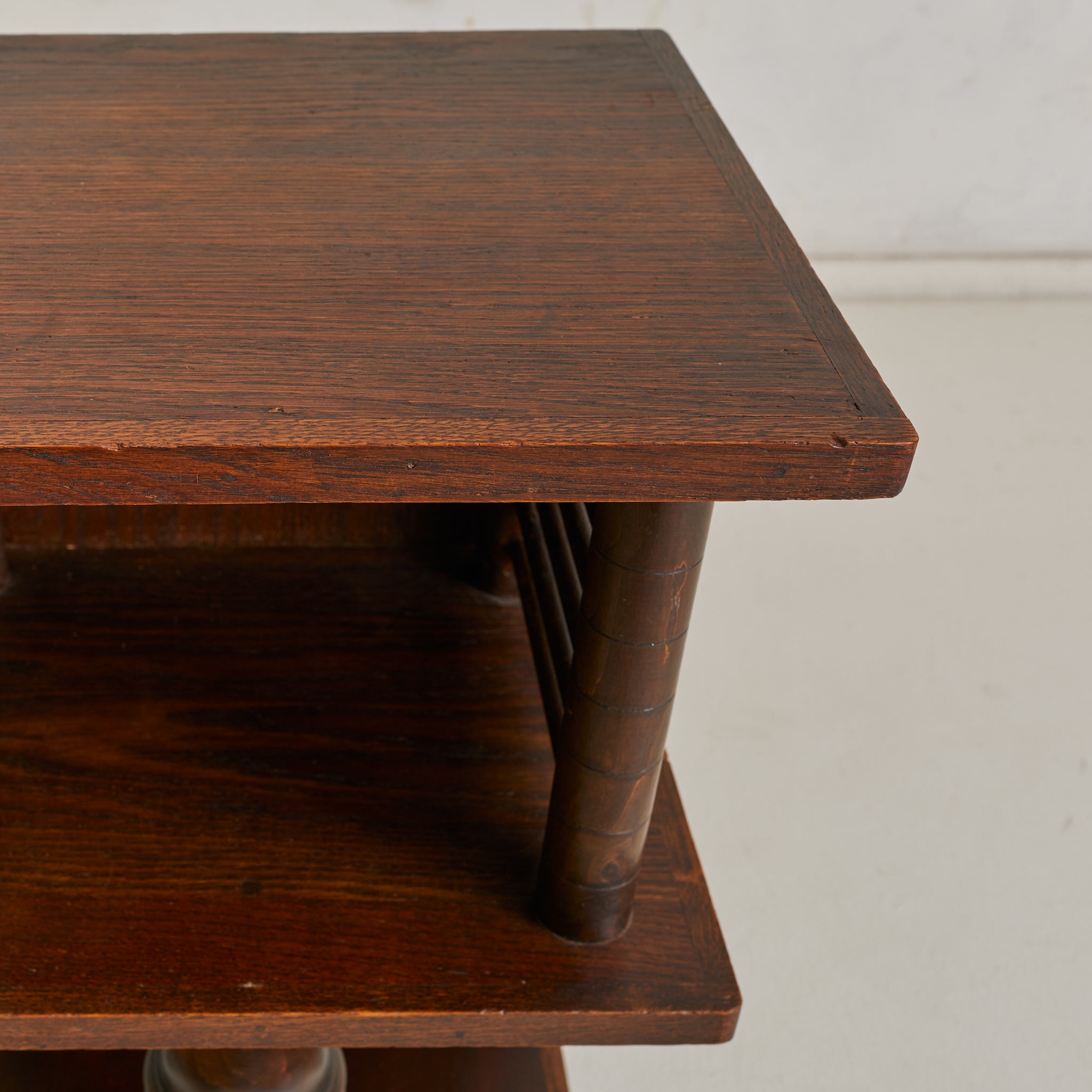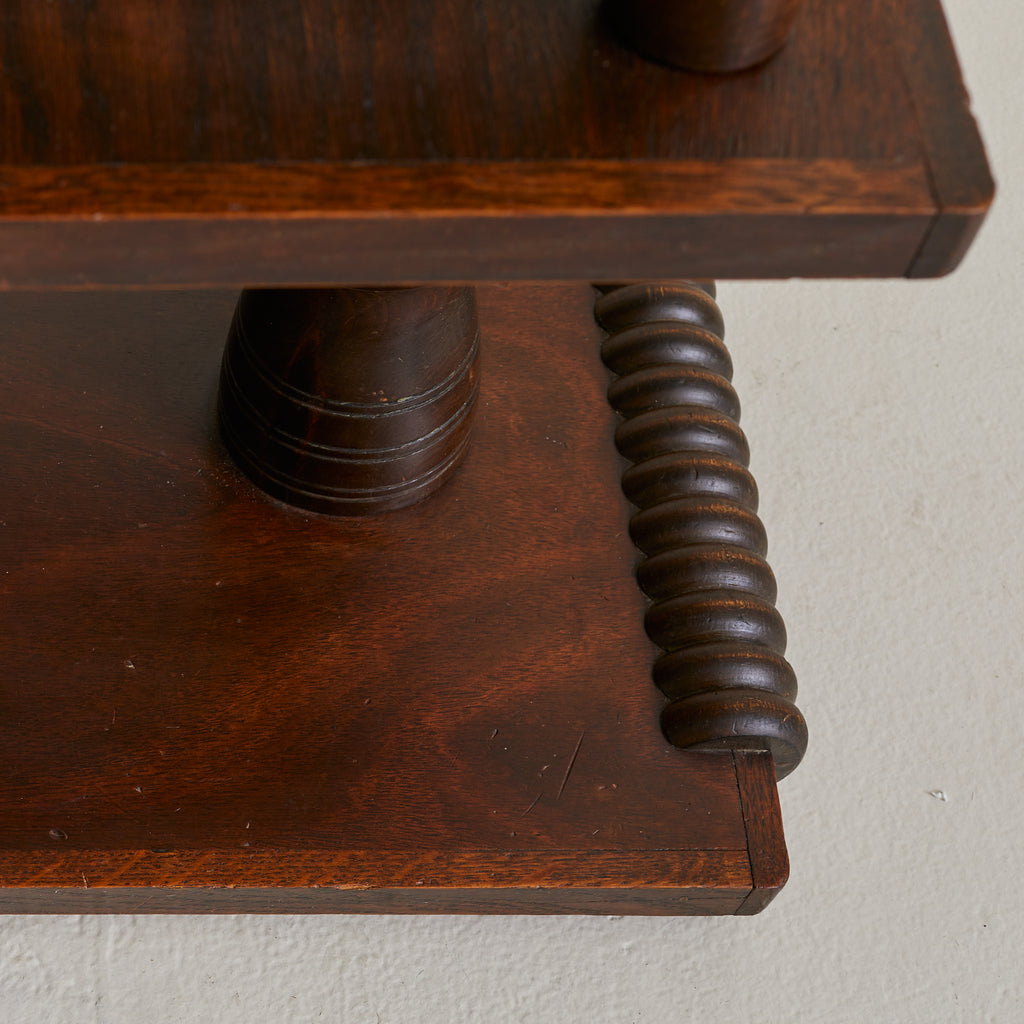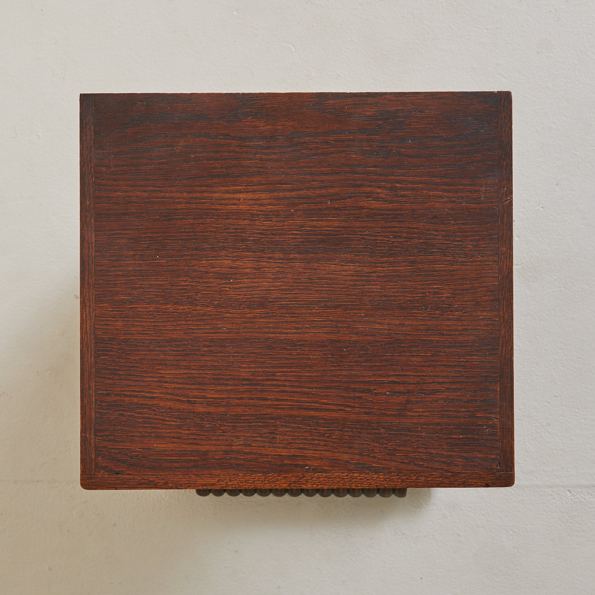 A compact study in rhythm and relief, this solid oak side table channels the sculptural vocabulary of French modernist Charles Dudouyt—where architectural planes meet playful bobbin accents. A square top floats above an open cubby framed by vertical spool rails; below, a tapered baluster support rests on a stepped plinth base, creating a stacked rhythm that holds visual weight from every angle.