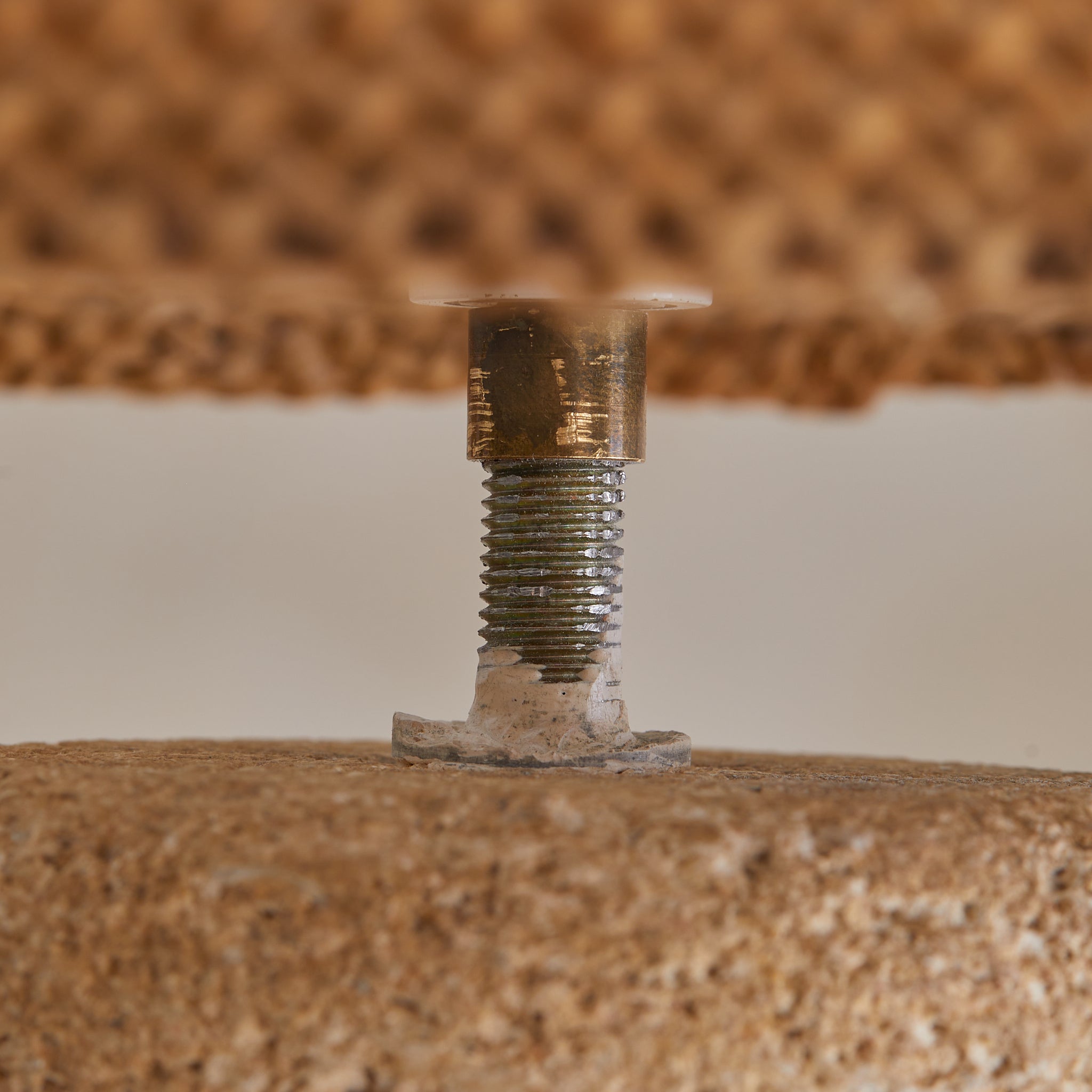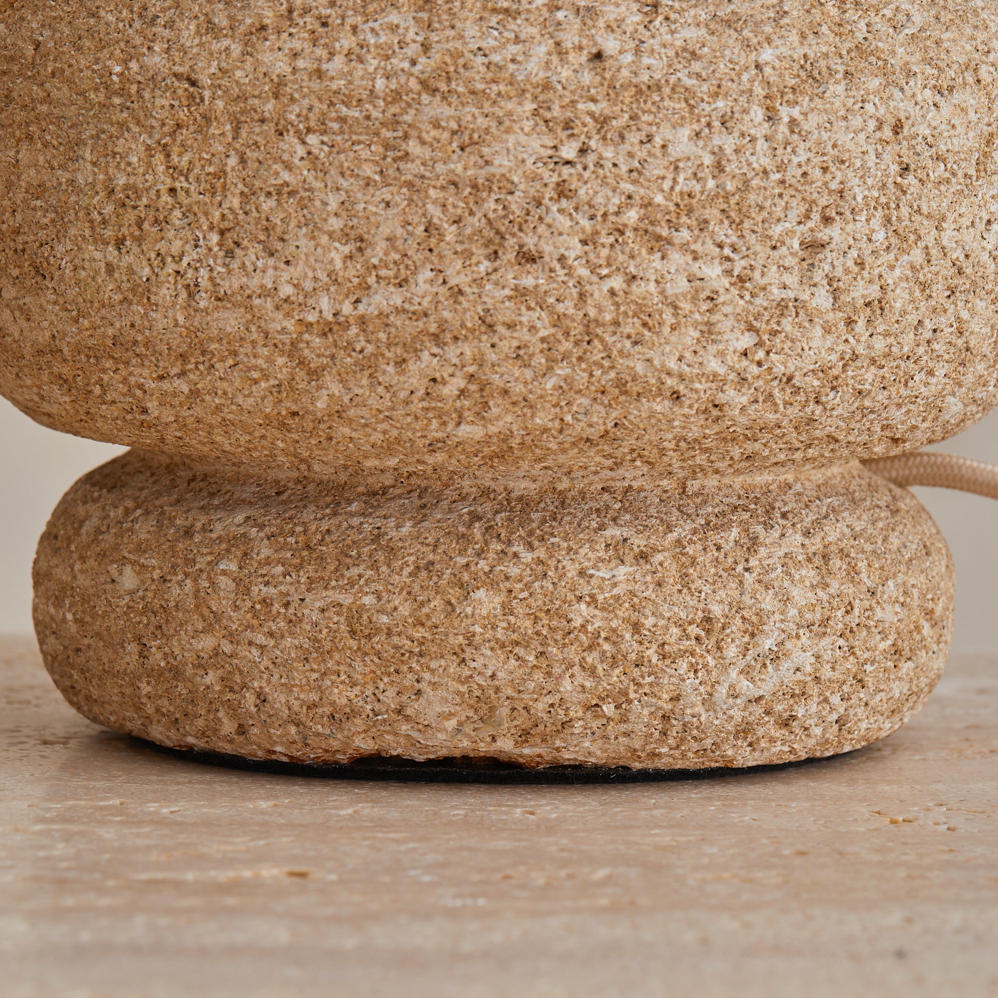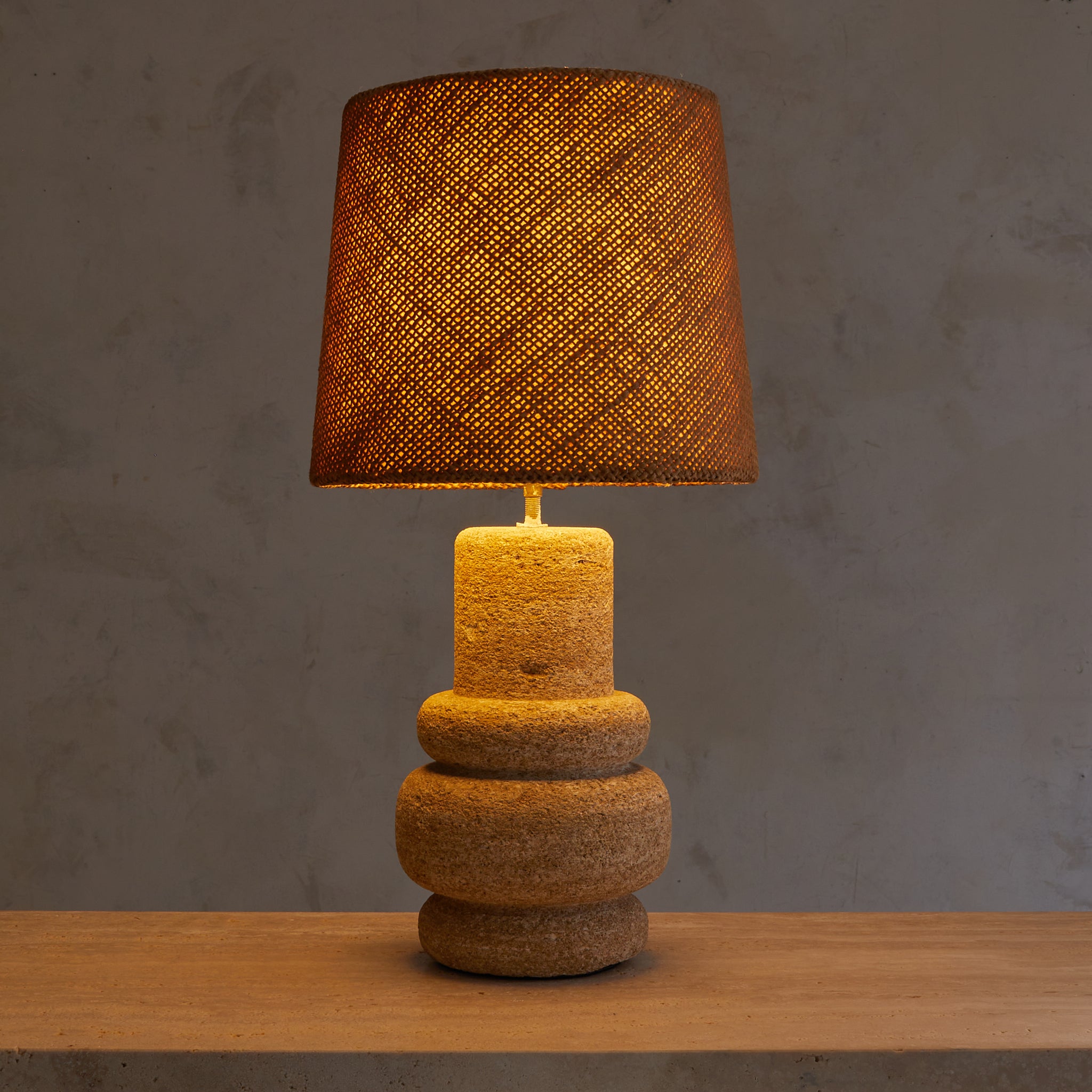 Carved from coarse French stone and shaped by hand, this 1970s table lamp balances weight and warmth in equal measure. The stacked silhouette, cylindrical and tiered, recalls a column unearthed from a sunbaked ruin. But when lit, it softens.