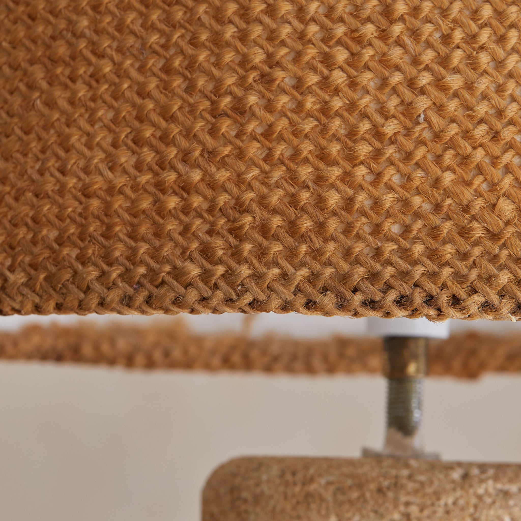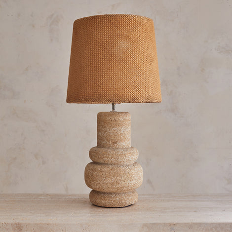 A woven shade in natural fiber casts a honeyed glow, filtering light through its loose weave with a gentle hush. Perfect on a console, a bedside, or anywhere a room welcomes texture and softness.