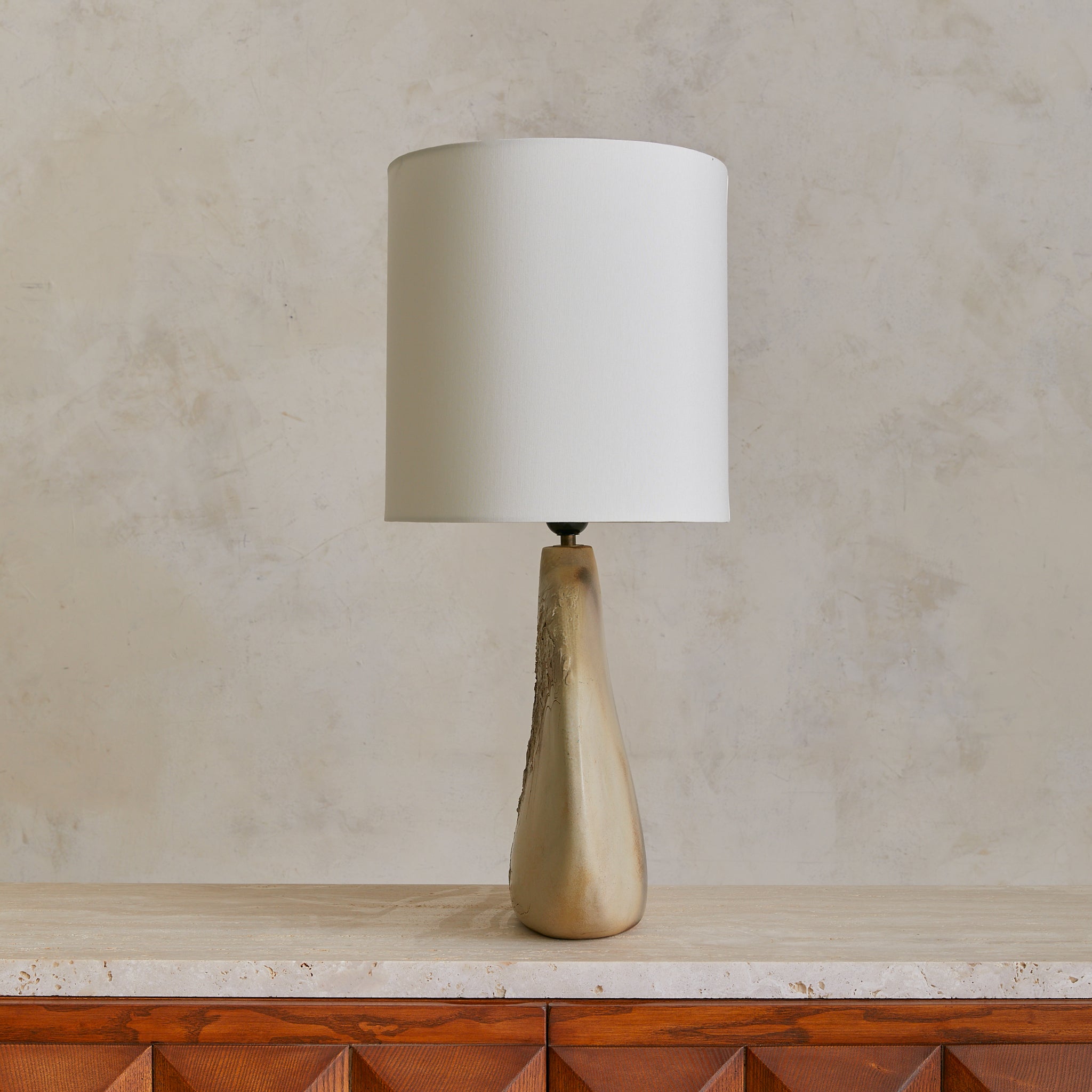 Newly paired with a hand-crafted oval shade, the composition feels sculptural enough for a console, gentle enough for a bedside.