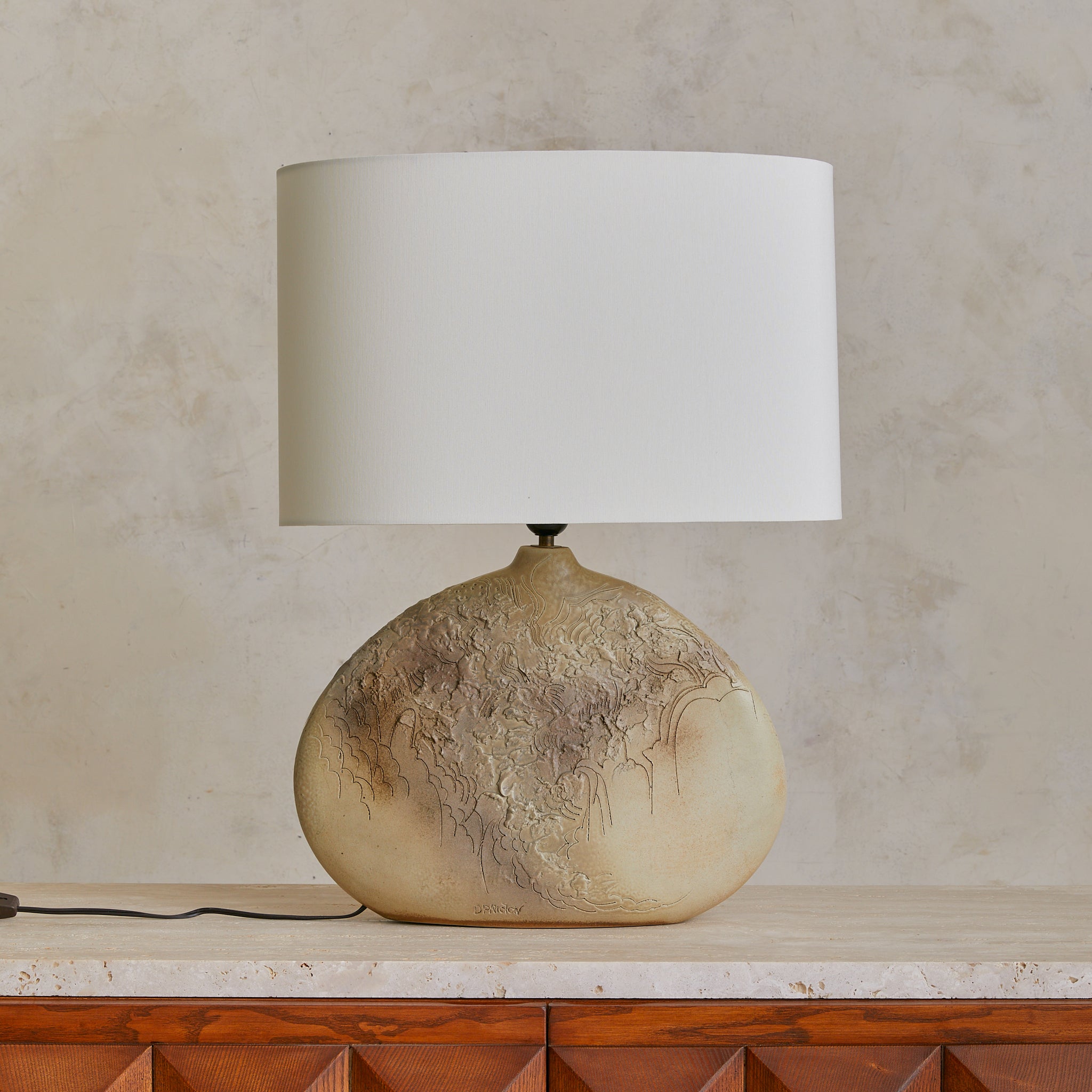 A French table lamp from the 1970s, signed by the artist and sculpted in ceramic with a rich matte glaze and textured relief. The rounded base reads like softened stone, its surface incised with an abstracted landscape—peaks, arches, and organic swells that shift in the light.