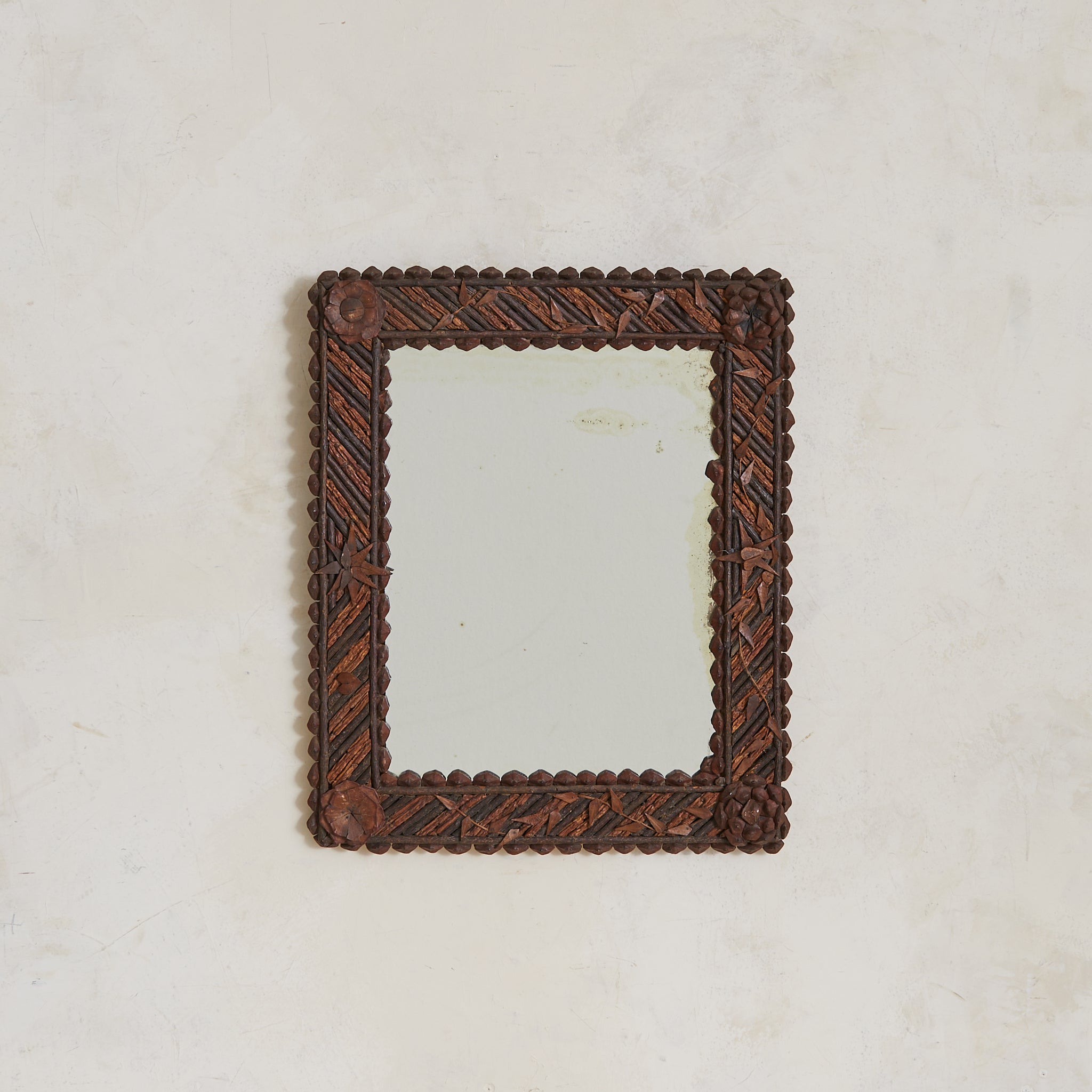 A French Tramp Art wall mirror from the early 20th century, hand-carved in relief with layered floral rosettes and foliate bands. The frame is constructed from dark-stained wood, its rhythmic diagonal grain interrupted by hand-hewn petals and trailing vines. A raised scalloped border softens the mirror’s rectangular form.
