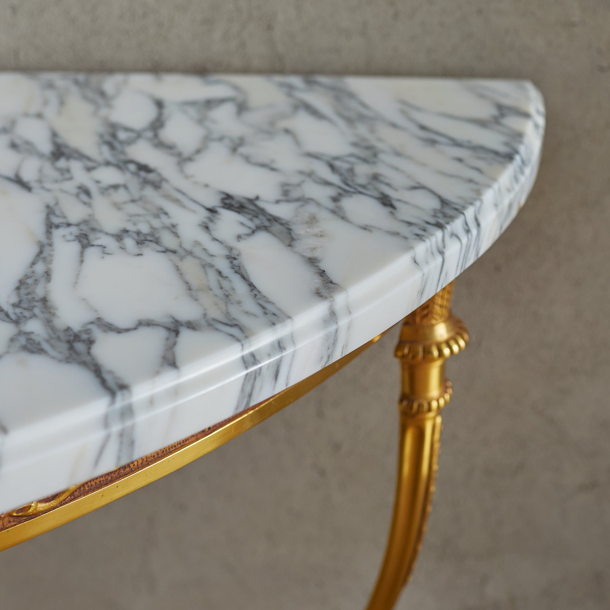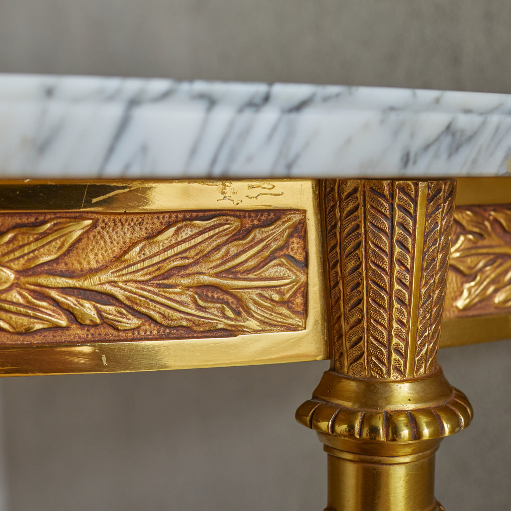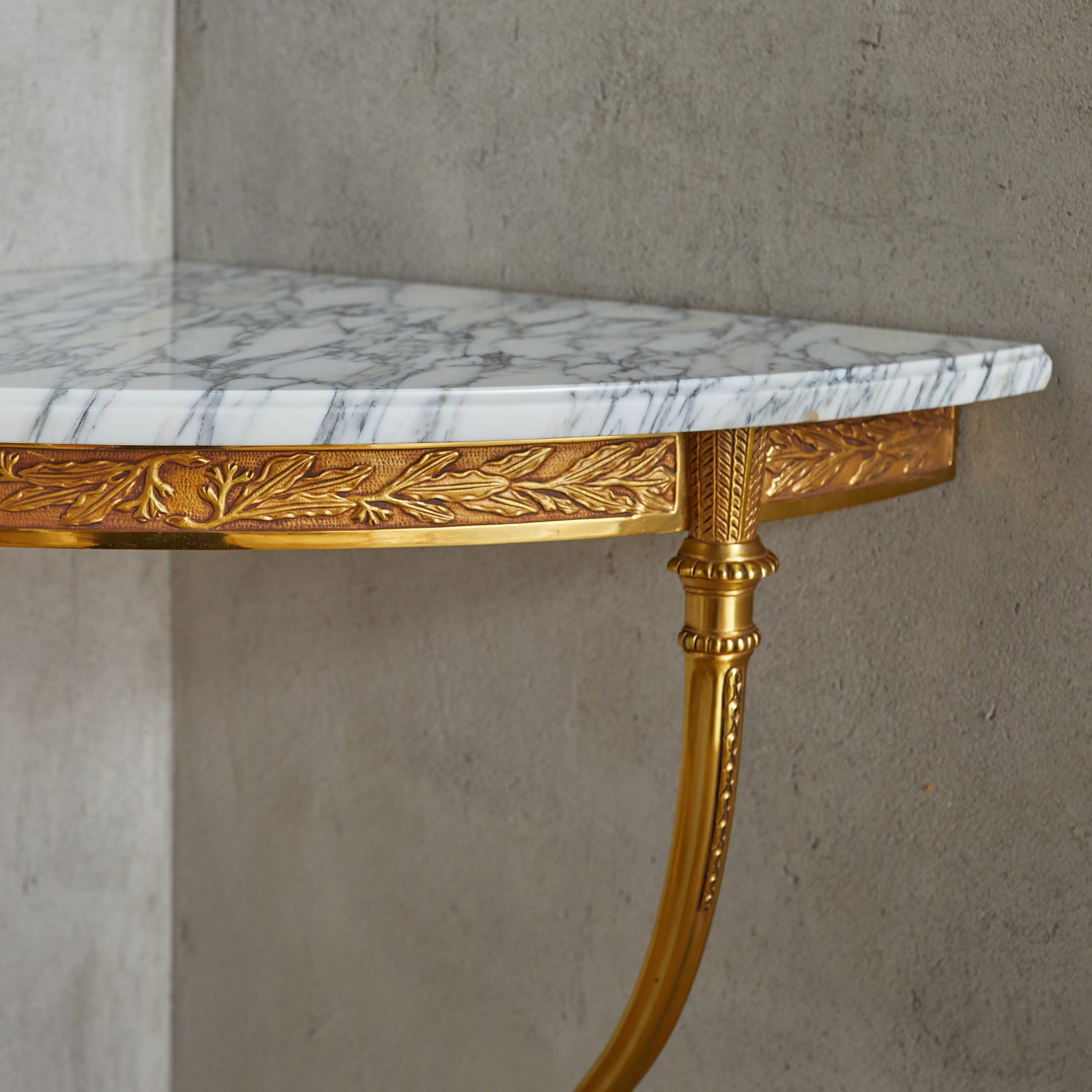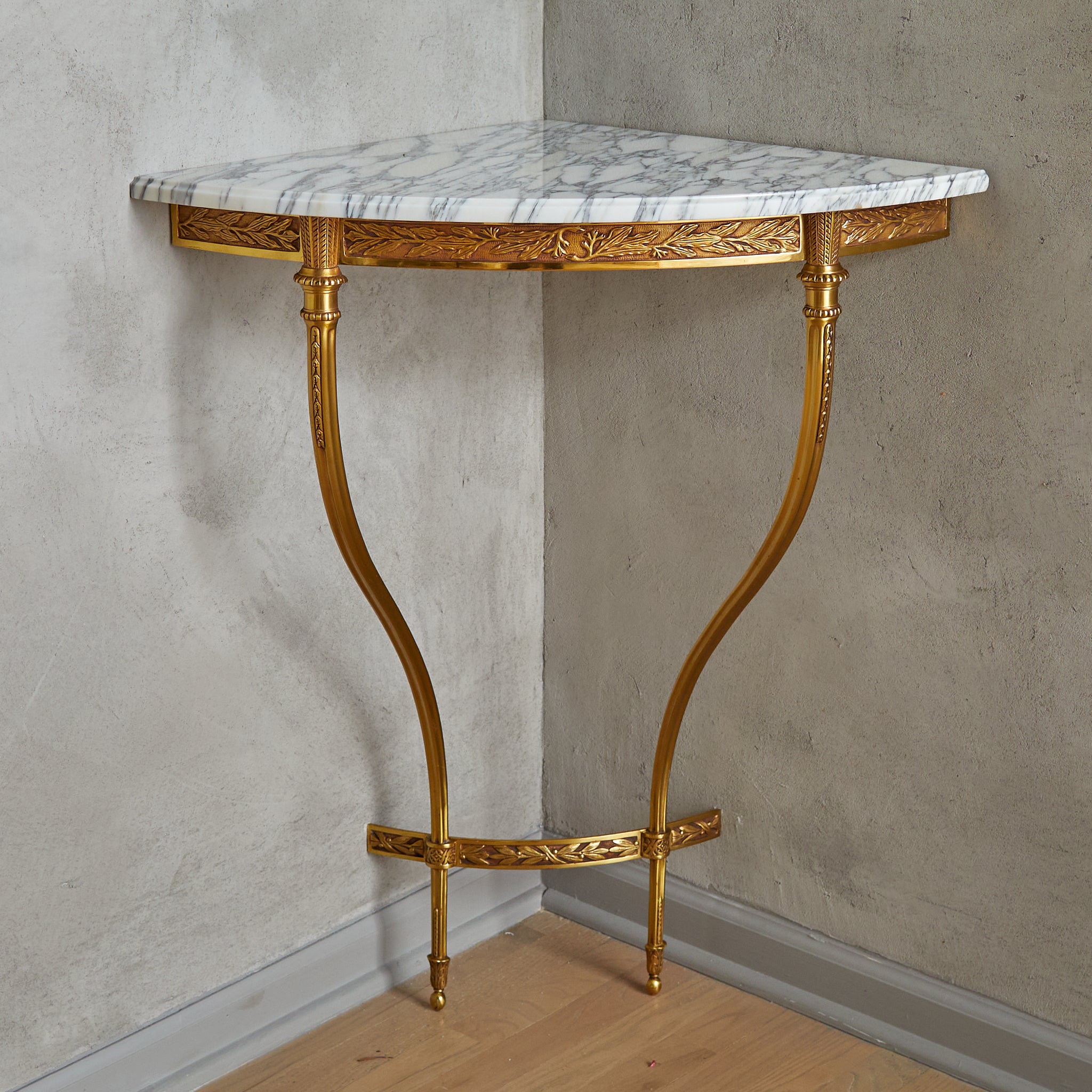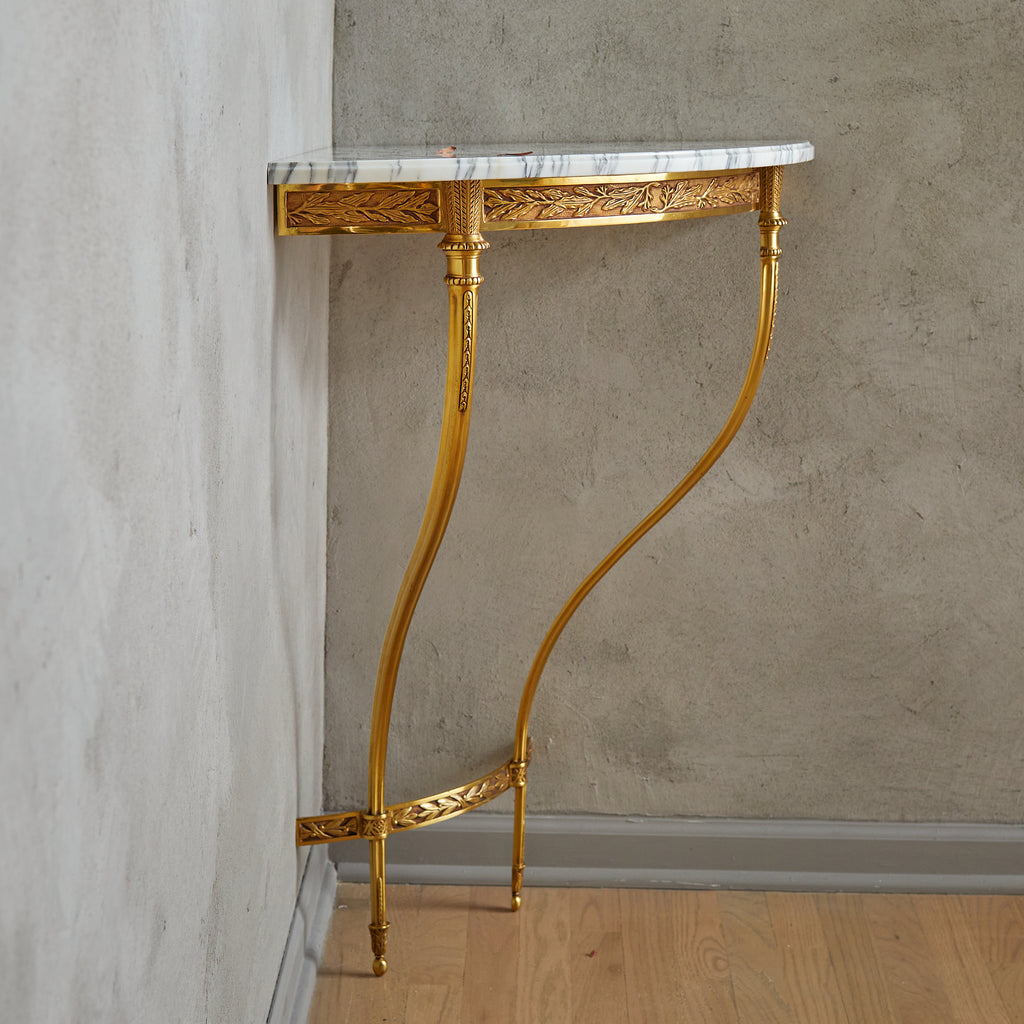 This 1950s French corner console seamlessly blends ornate detailing with elegant proportions. The gilded brass frame, accented with delicate foliate and geometric engravings, features two softly curved legs that lend a sense of lightness. A Carrara marble top with an ogee edge, richly veined with natural variations, delicately rests upon the frame.