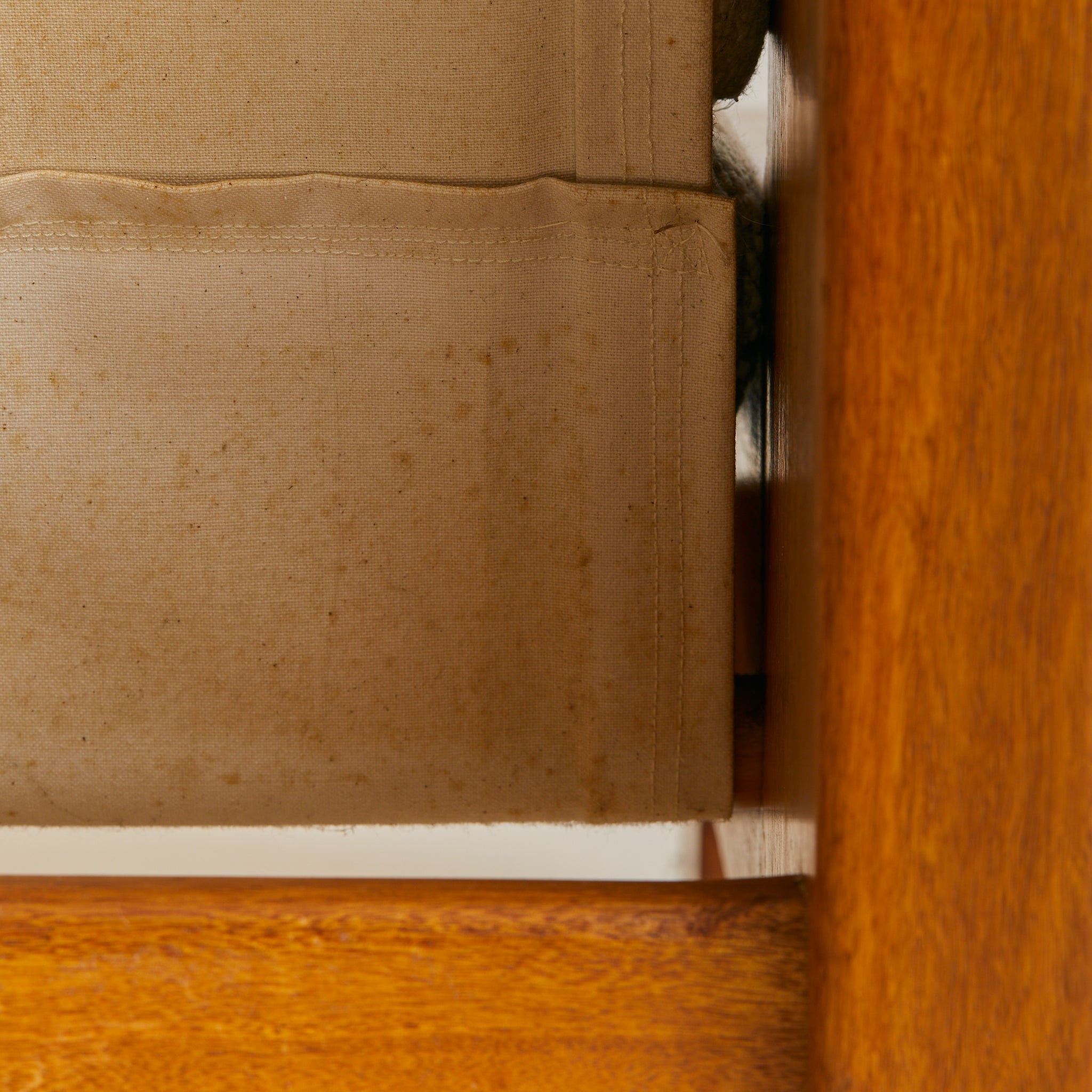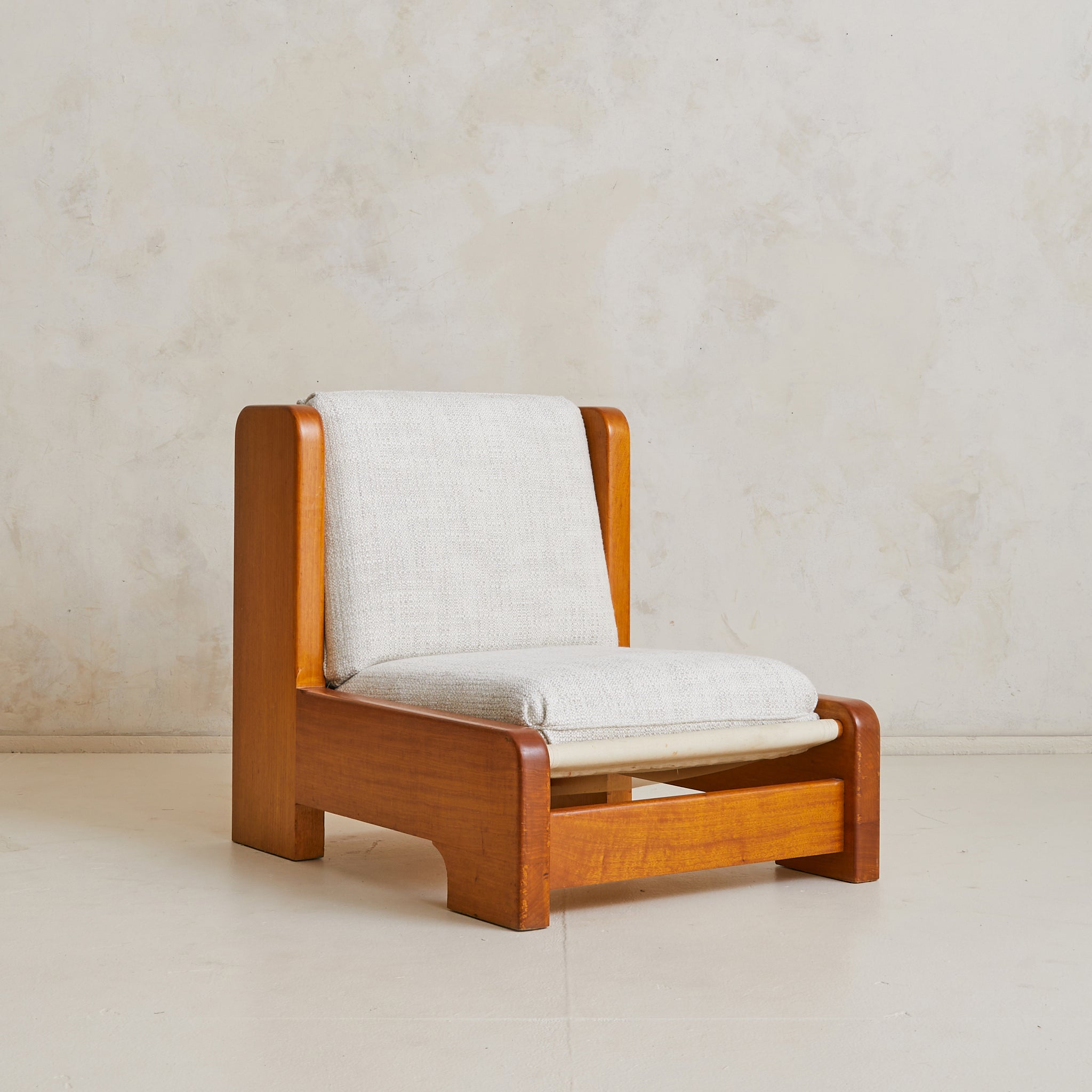 A 1970s French lounge chair, designed by an architect for his personal residence. The solid wood frame reads almost architectural—broad, grounded, and precisely constructed, with softly rounded corners. The seat cushions float on a canvas sling, its proportions thoughtfully scaled for comfort.