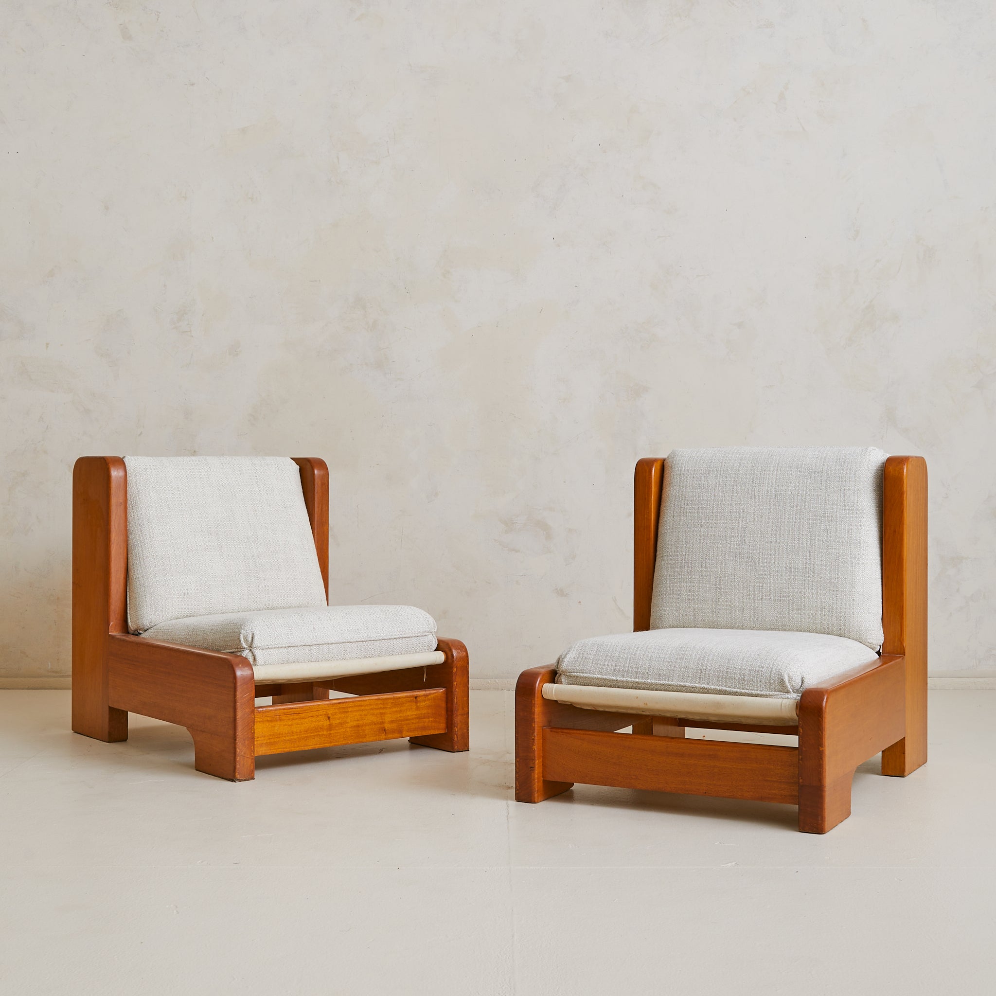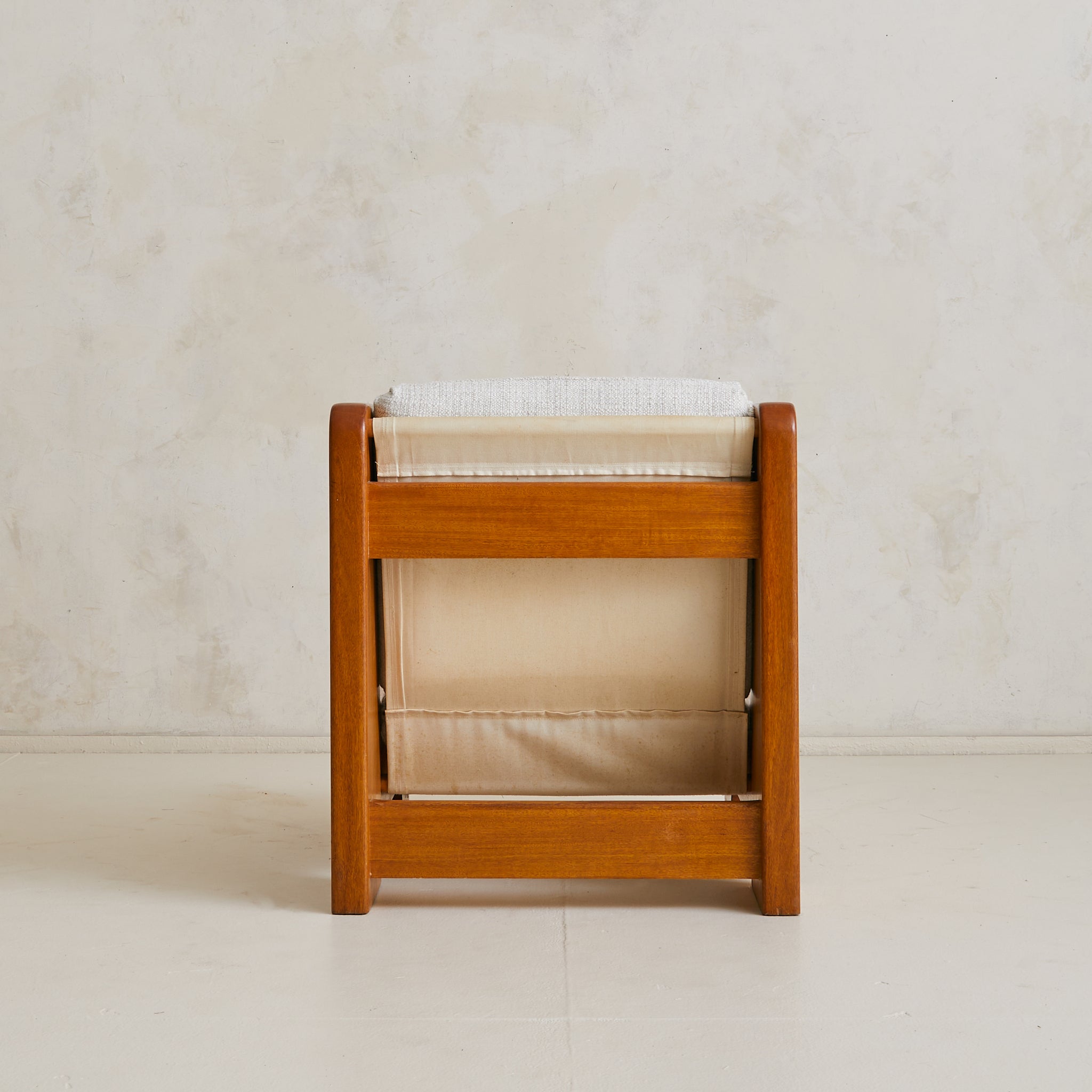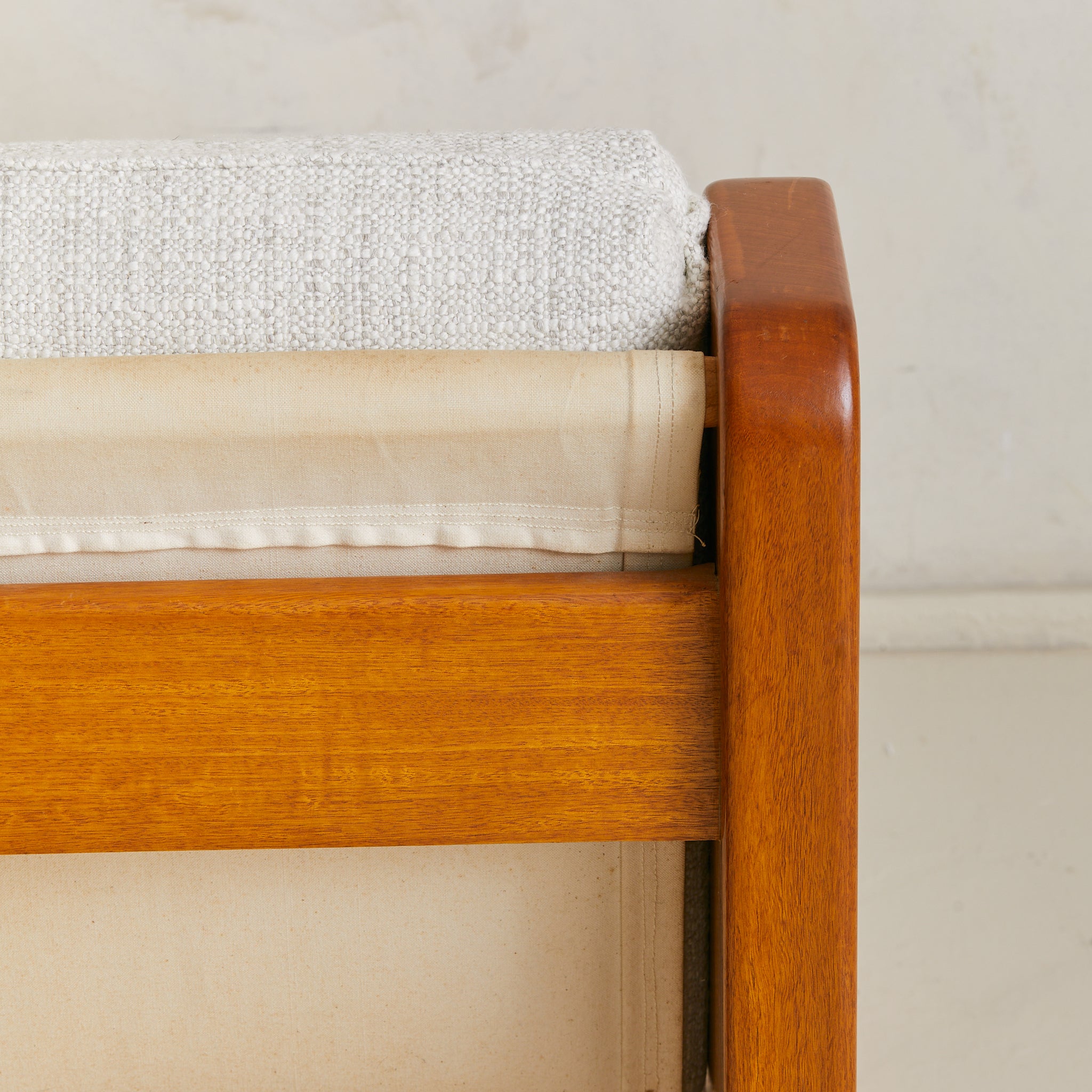 Newly upholstered in a mottled ivory and sand bouclé, the cushions are generous yet tailored, offering contrast against the warm tone of the wood. Crafted with an architect’s eye for line, joinery, and scale, the chair is equally suited to a reading corner or styled as a pair to anchor a conversation area.