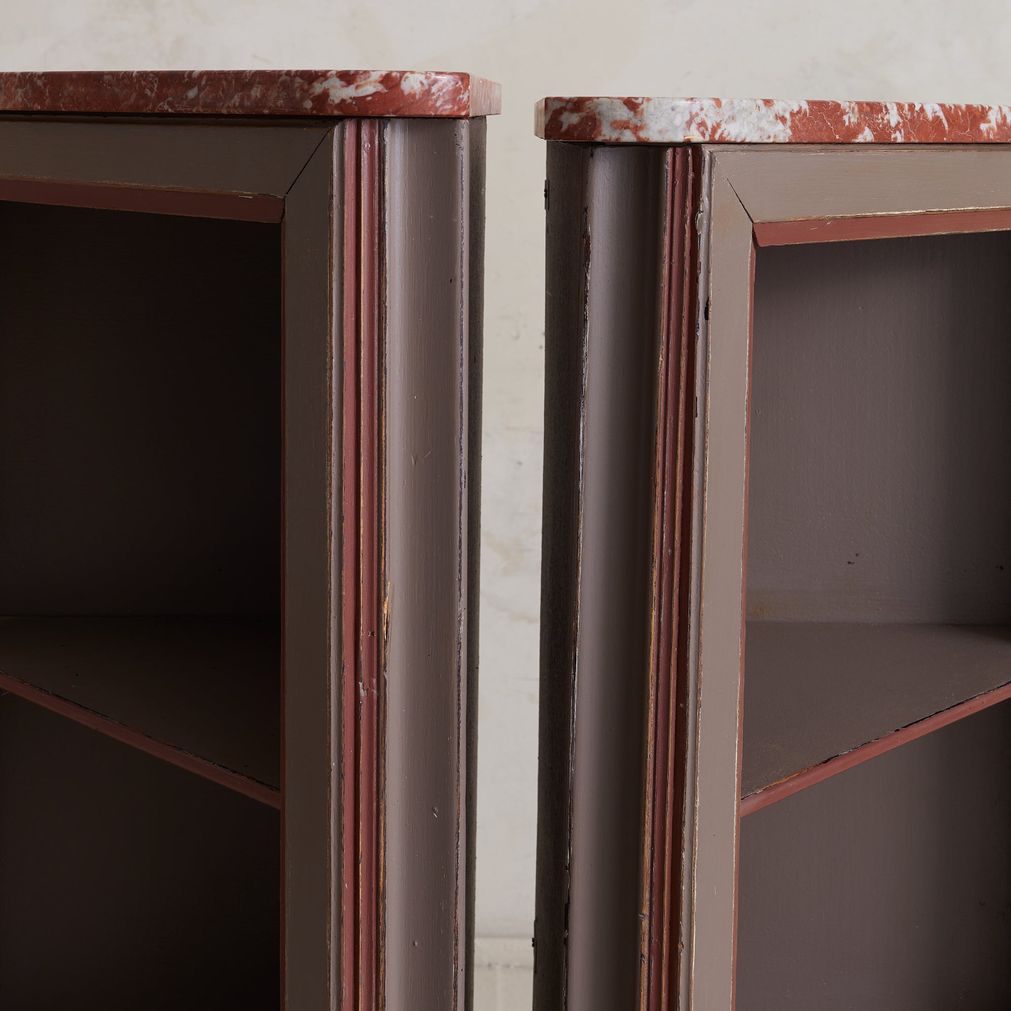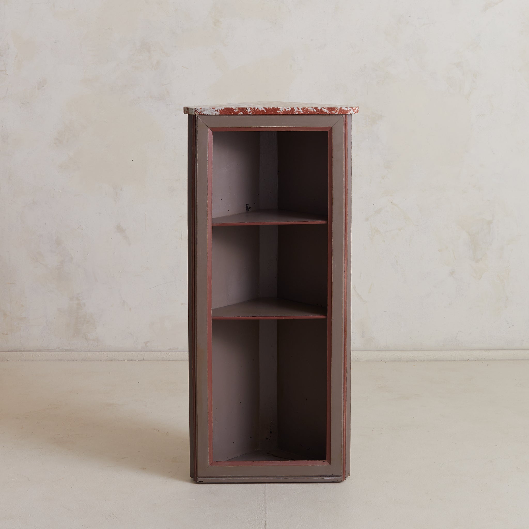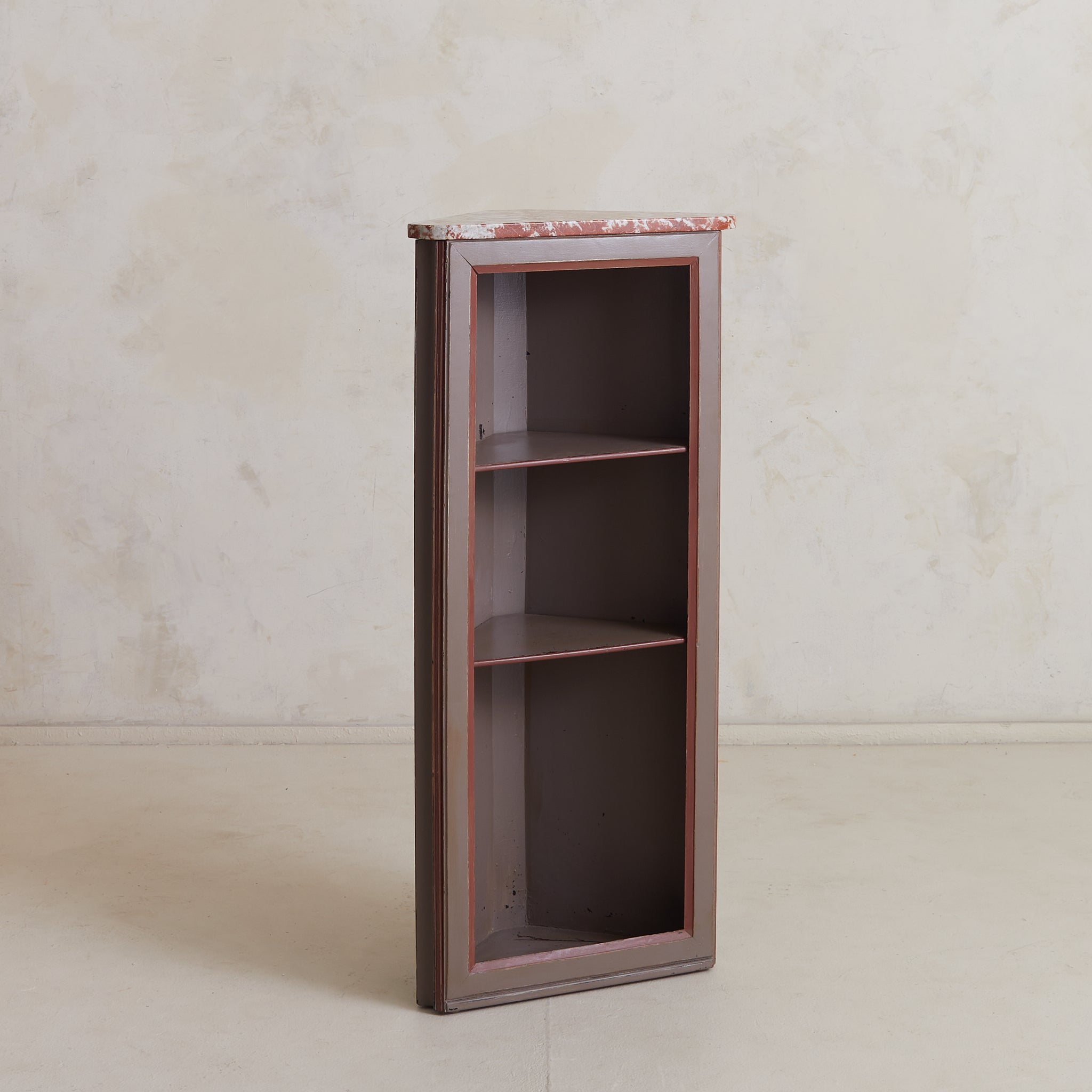 A 1930s French corner shelf constructed of painted wood, softened by decades of natural patina. Its muted umber tones provide a subdued counterpoint to the Rosso Francia marble top—a richly pigmented stone prized for its deep red-orange body and dramatic white veining.