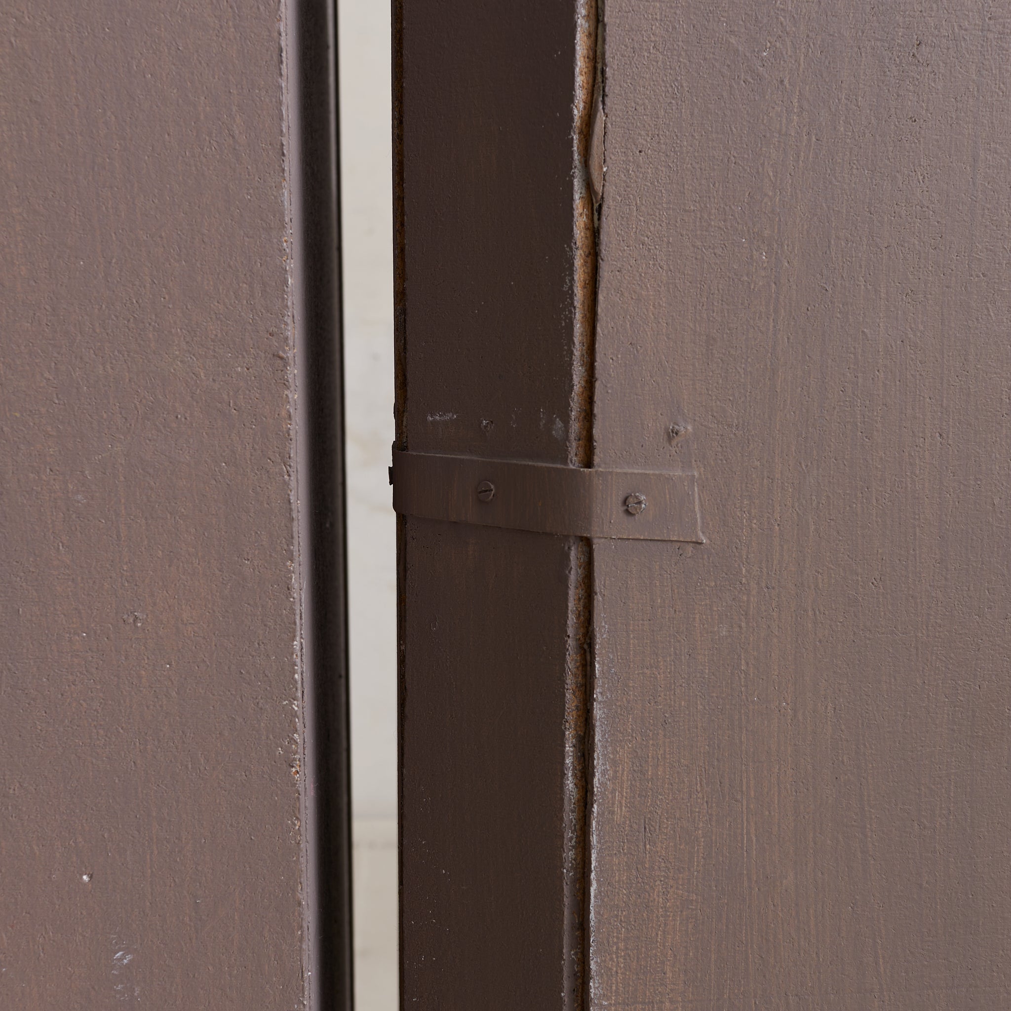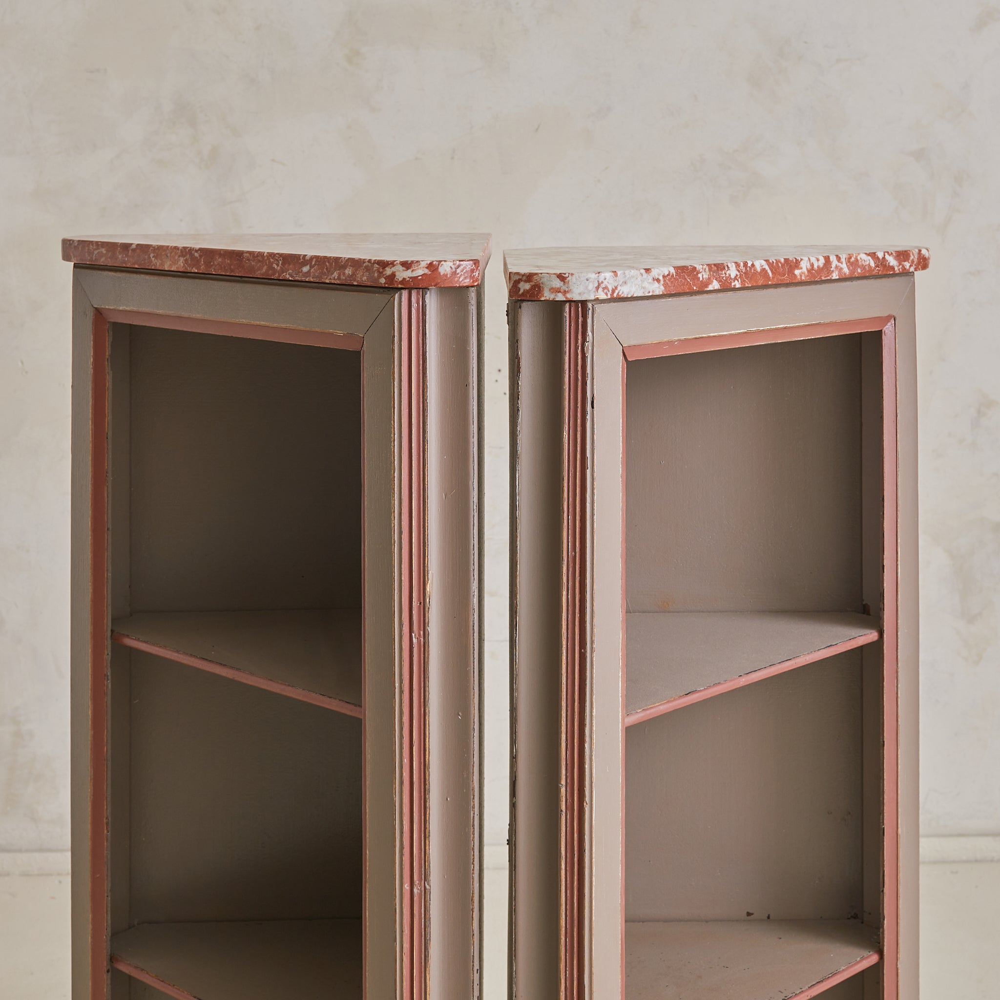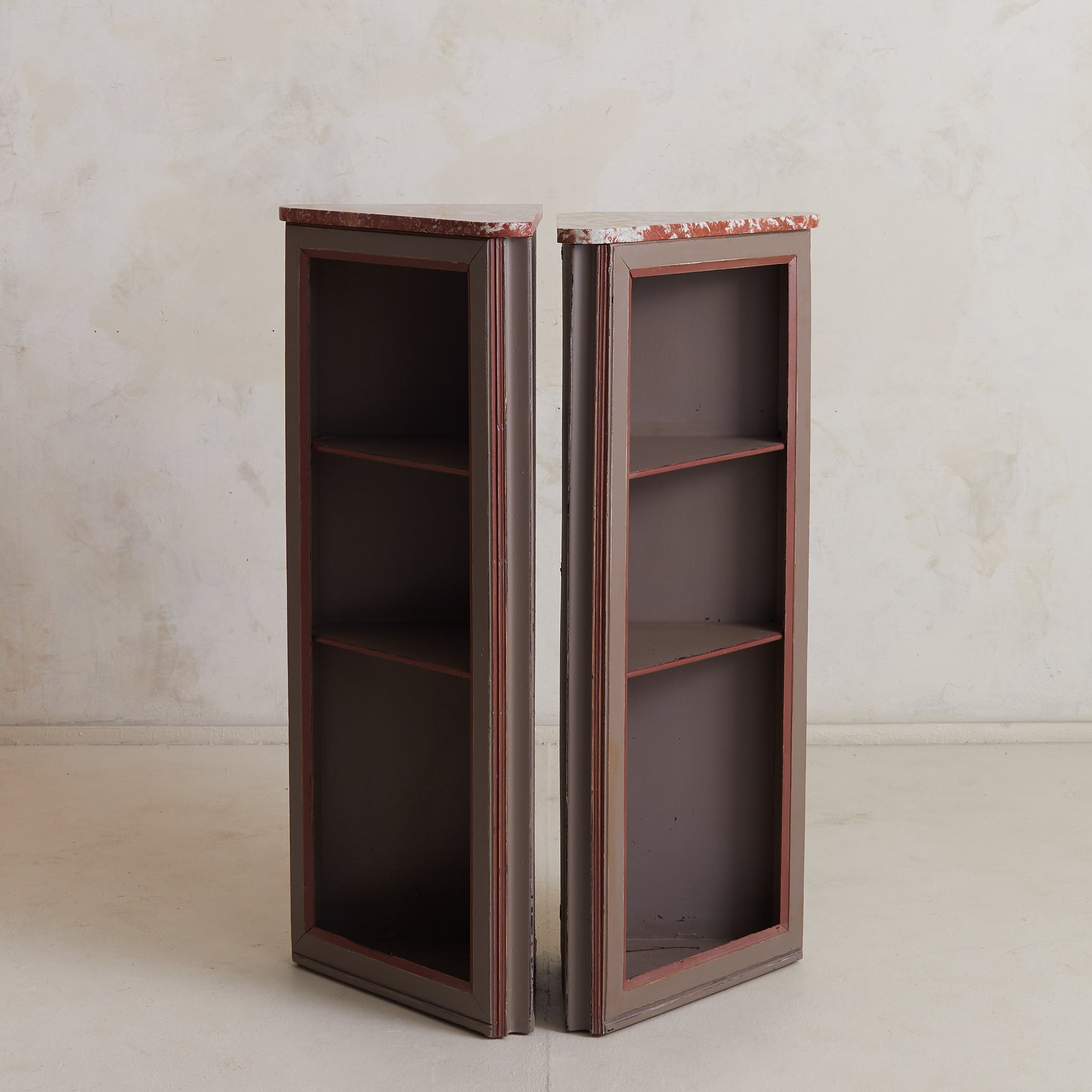 A 1930s French corner shelf constructed of painted wood, softened by decades of natural patina. Its muted umber tones provide a subdued counterpoint to the Rosso Francia marble top—a richly pigmented stone prized for its deep red-orange body and dramatic white veining.