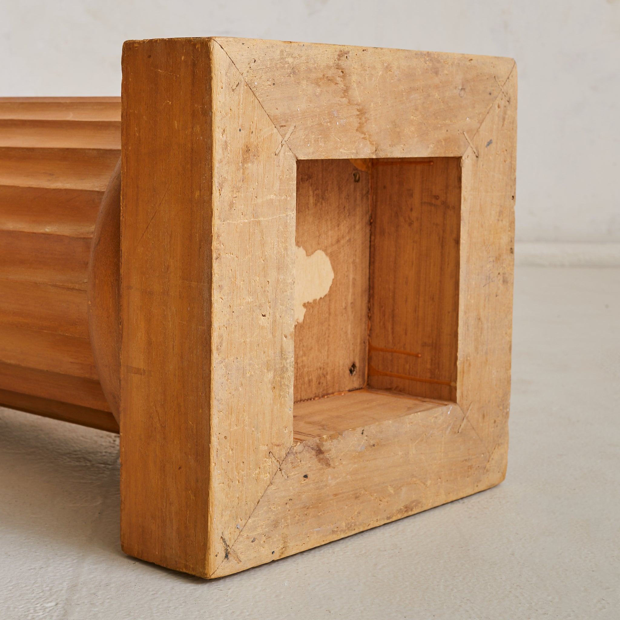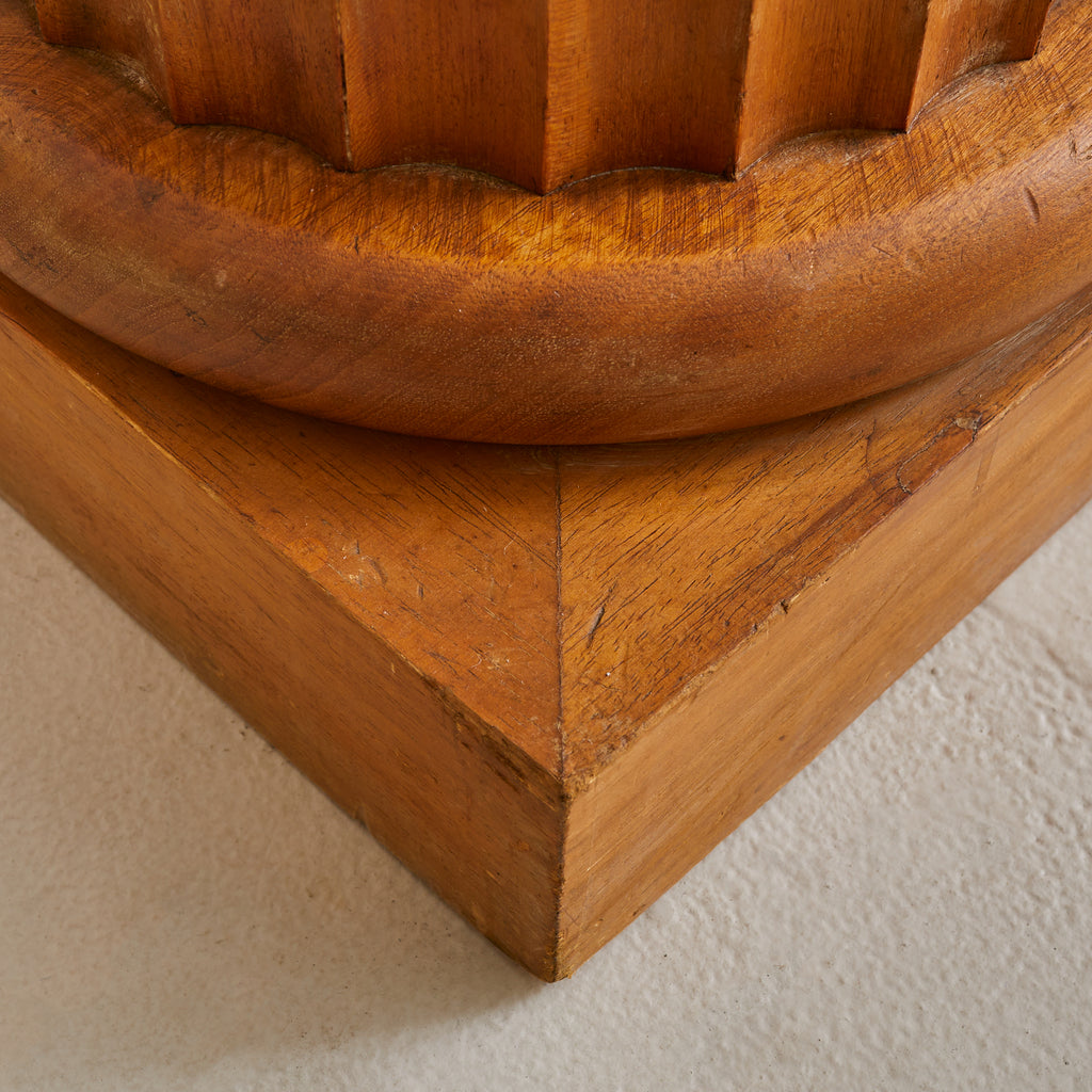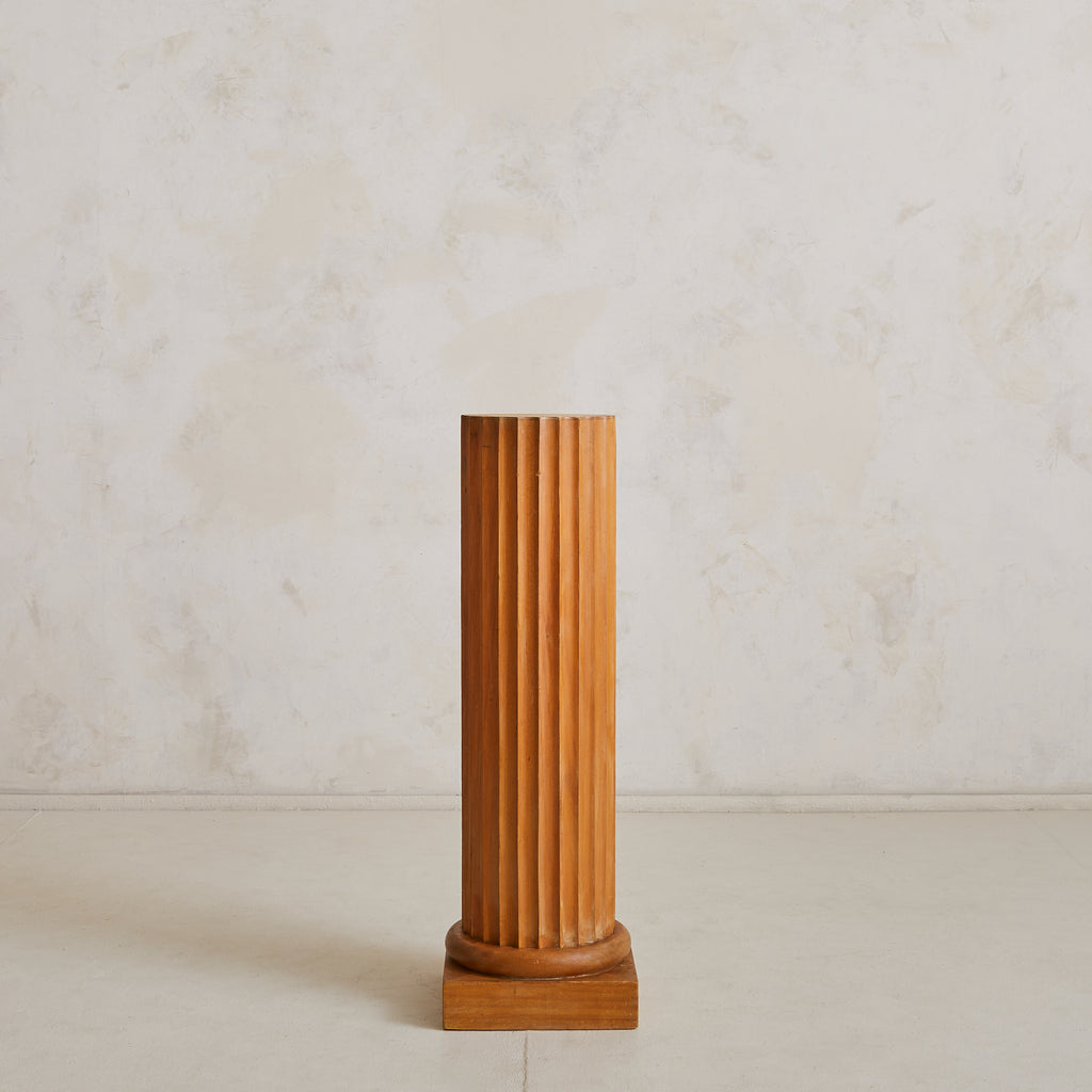 An elegant 1940s French pedestal in the neoclassical style, its fluted column form evokes architectural grandeur. Crafted from solid wood with vertical grooves, it rests on a squared base, offering balance and quiet strength. A sculptural accent or plinth for display, it channels French modernism while nodding to ancient Greco-Roman forms.