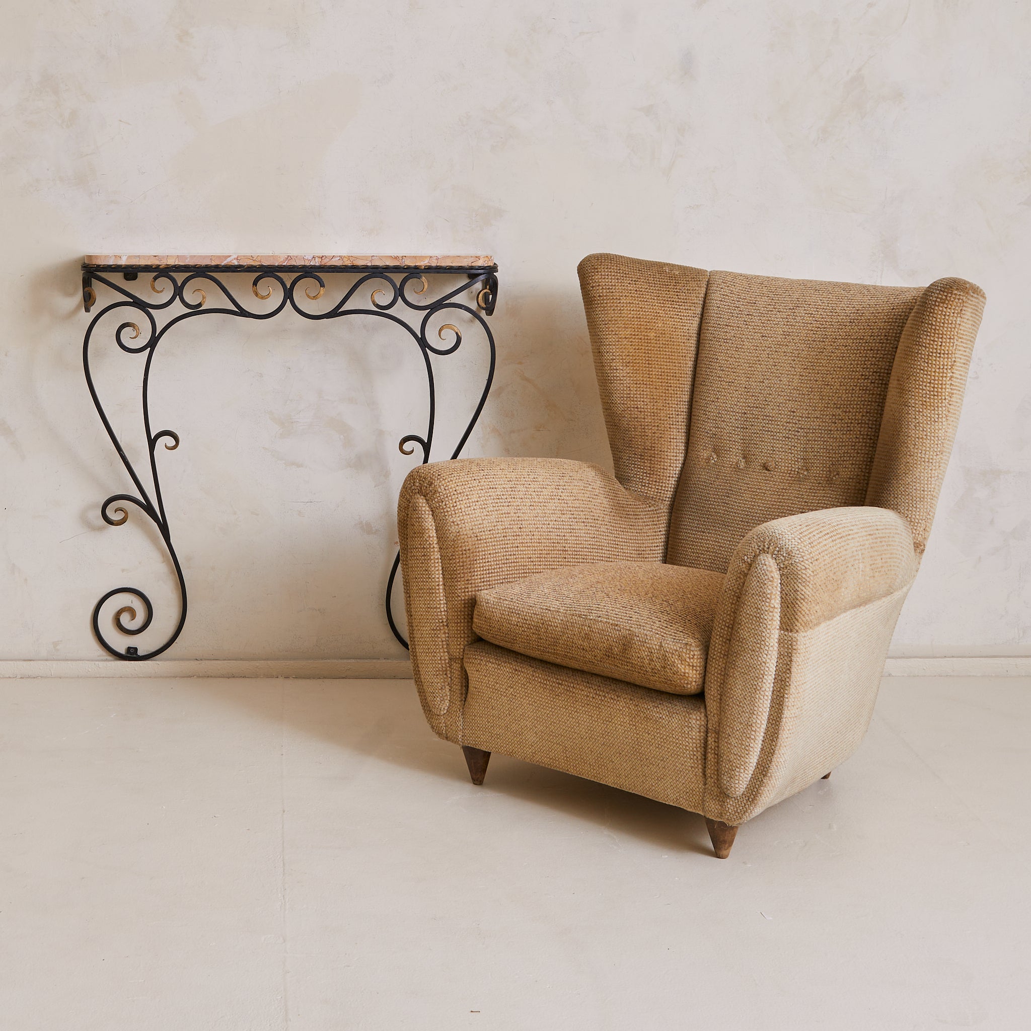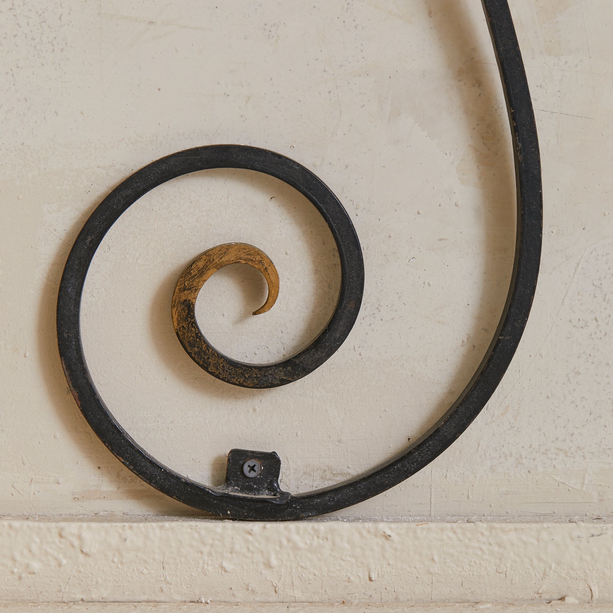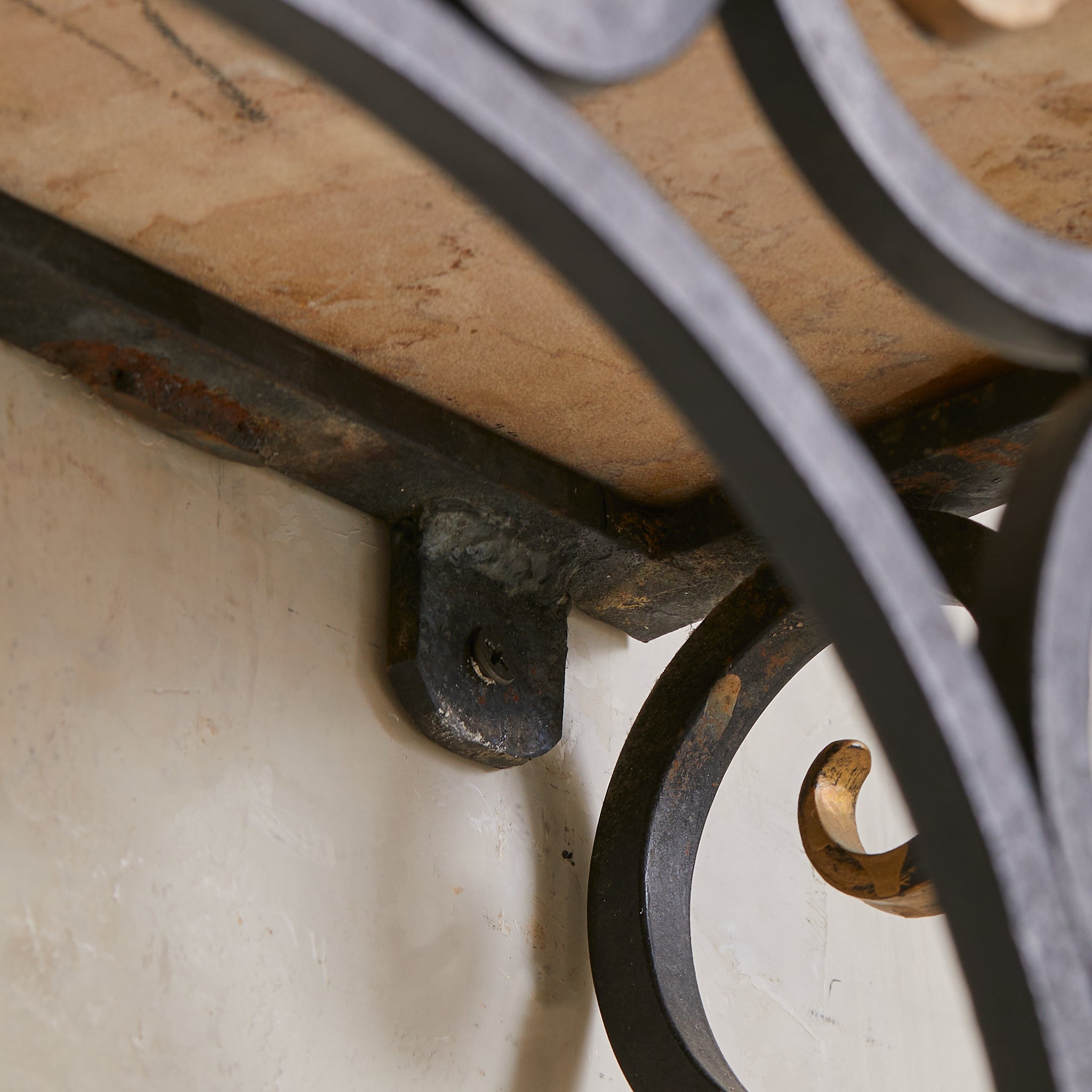 A 1940s French wall-mounted console, sourced in the South of France. Hand-wrought in iron, the sinuous frame unfurls in baroque scrollwork—each curve ending in gilt accents, burnished softly with age.