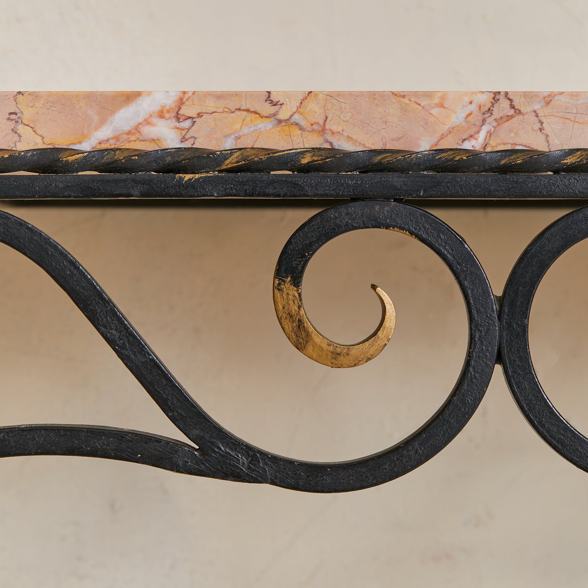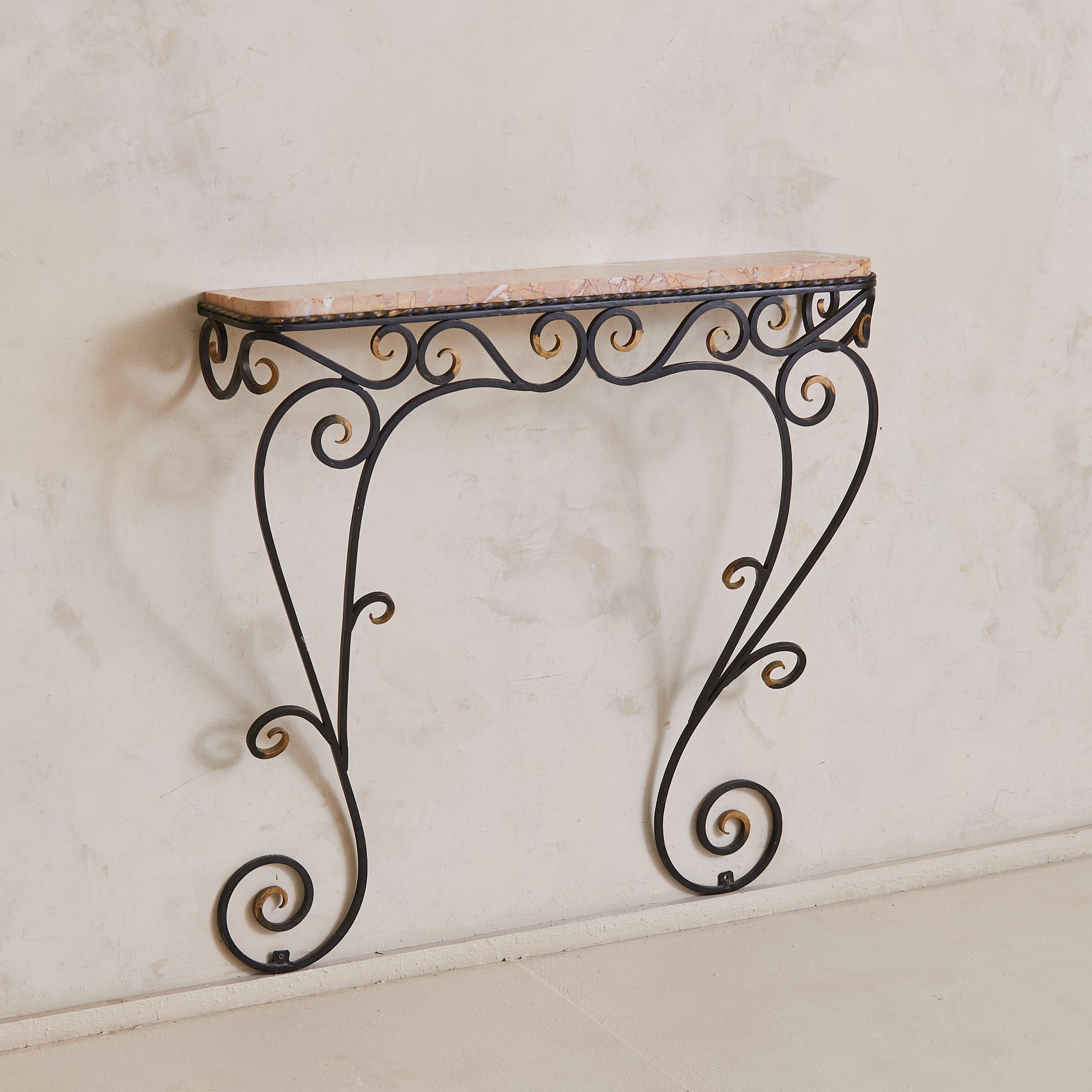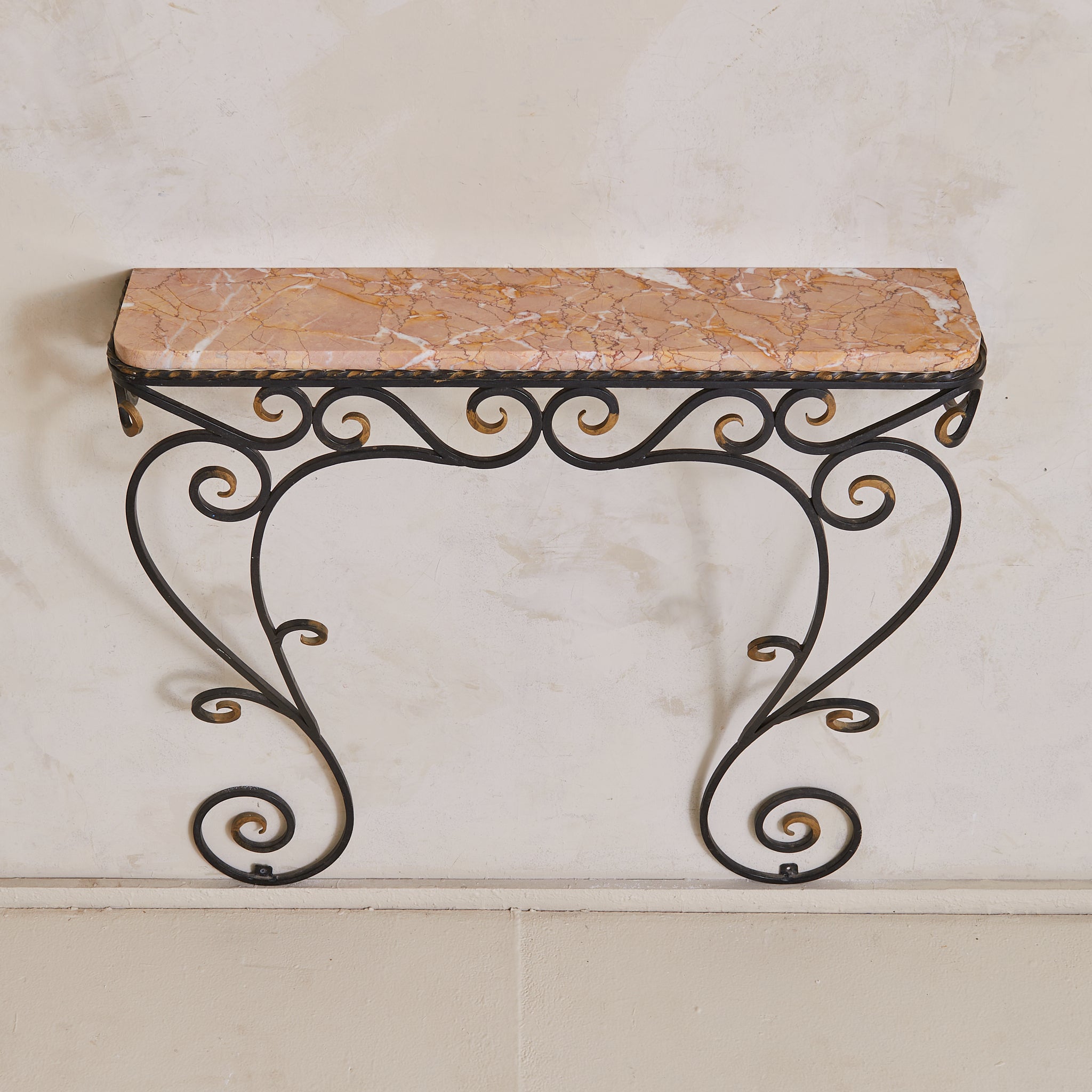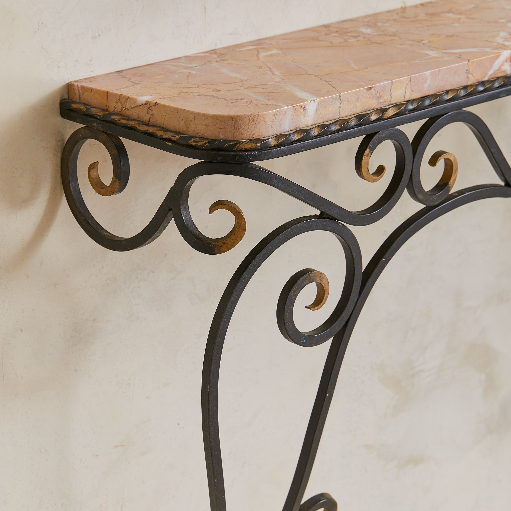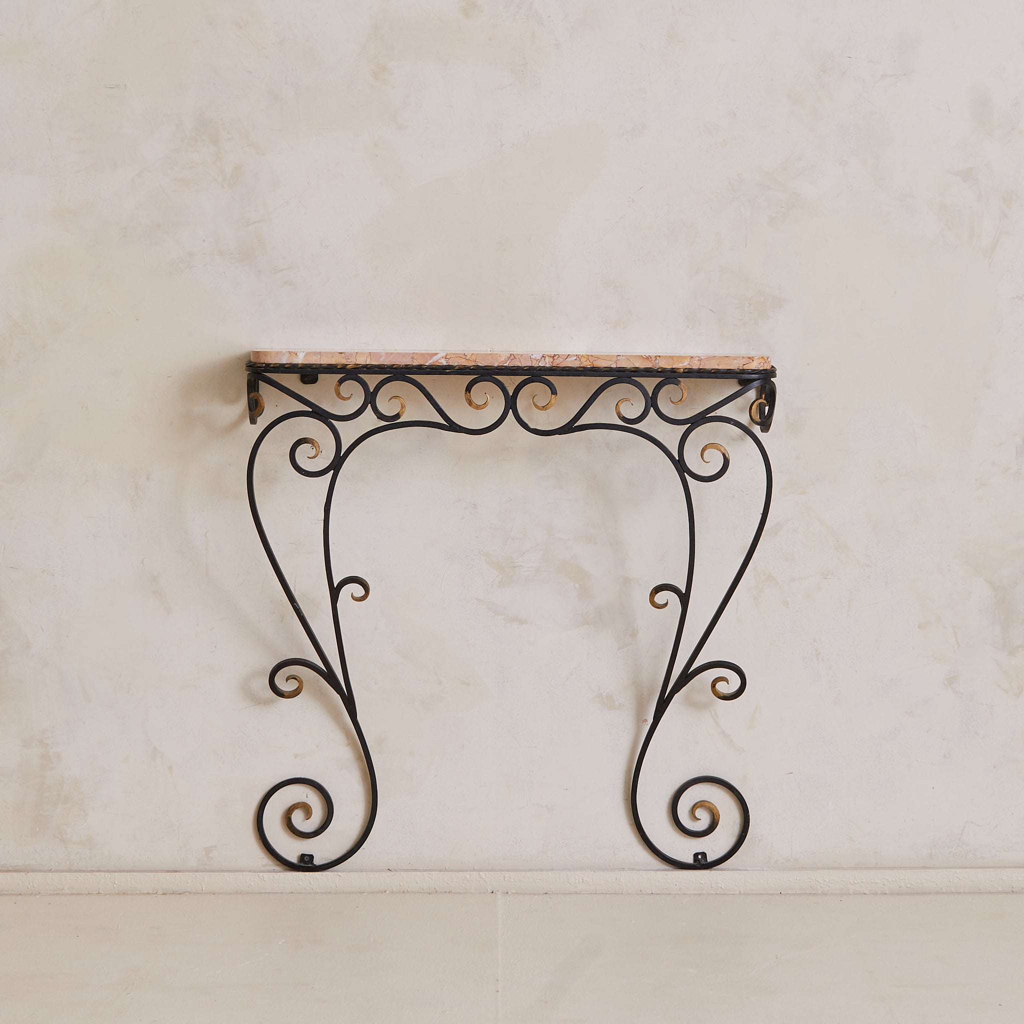 French Wrought Iron Wall-Mounted Console with Rose Marble Top, 1940s