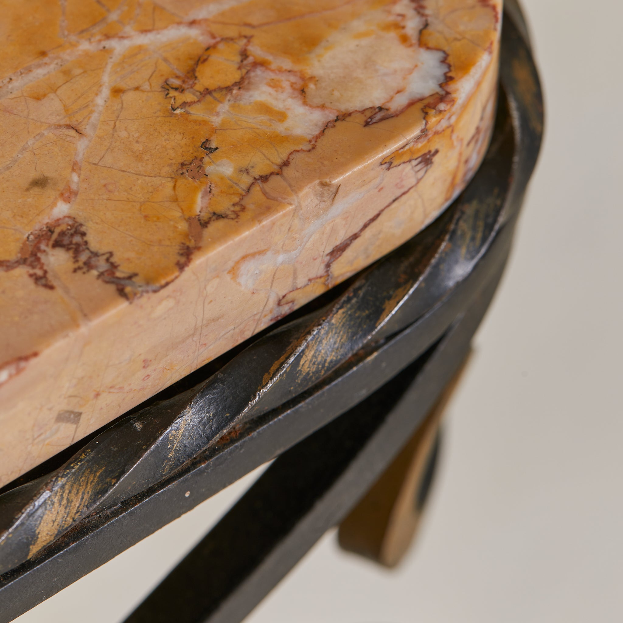 Above, a slab of richly veined marble in warm rose tones—threaded with ochre, ivory, and fine rust-hued veining—rests within the frame. The surface is gently honed, its soft sheen accentuating the depth of color. Rounded corners and a beveled edge echo the fluidity of the wrought iron below.