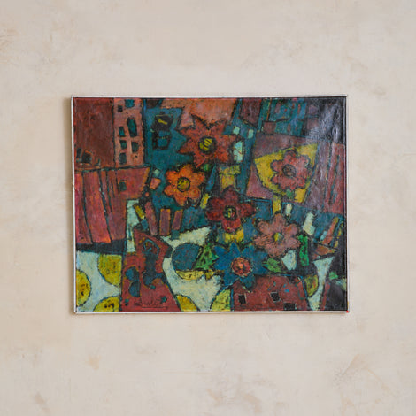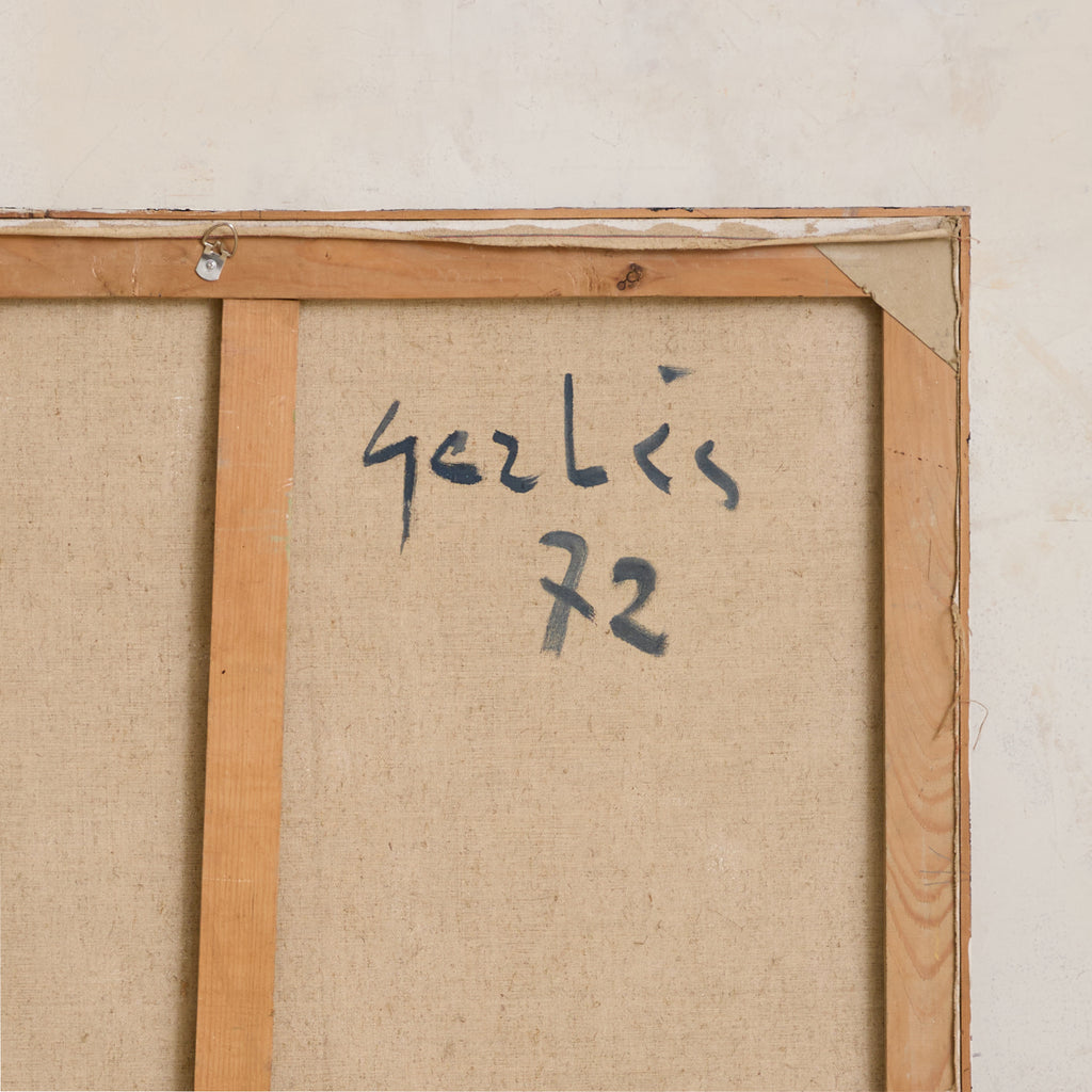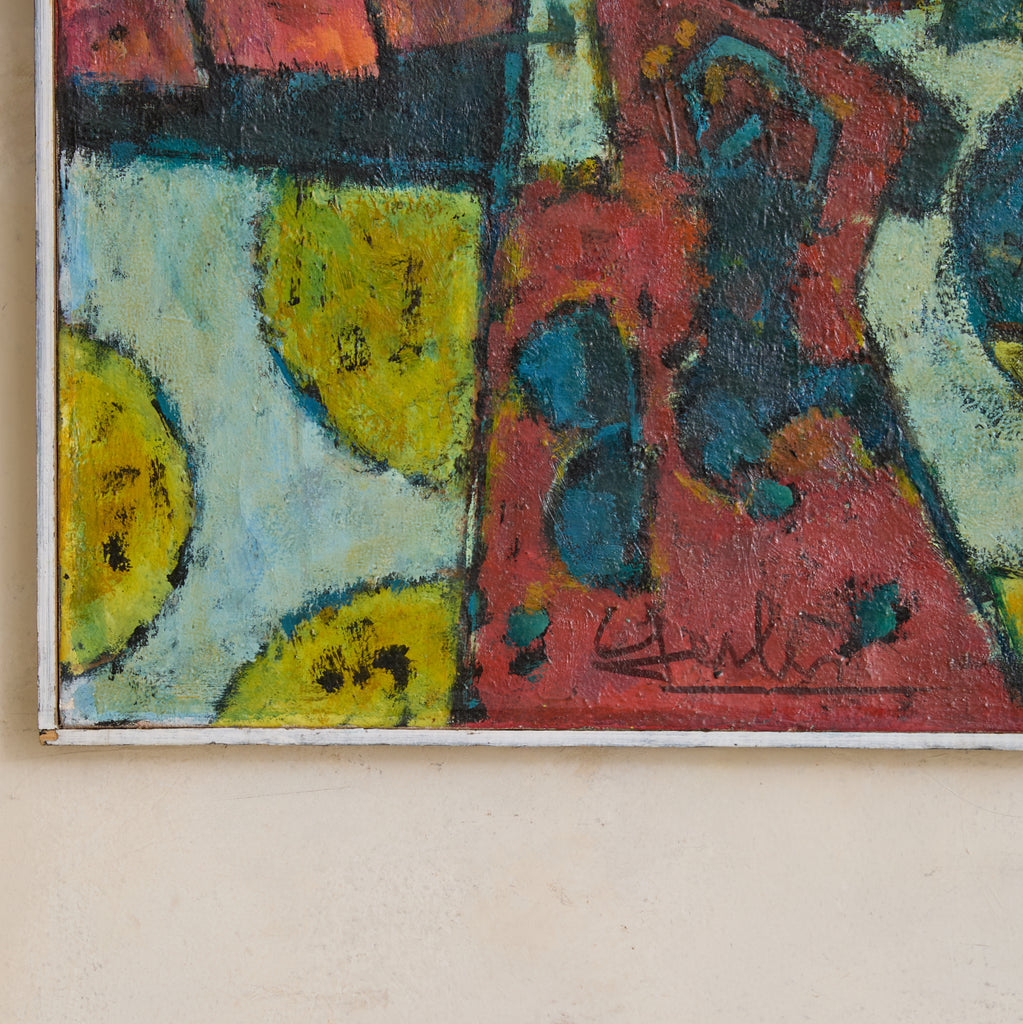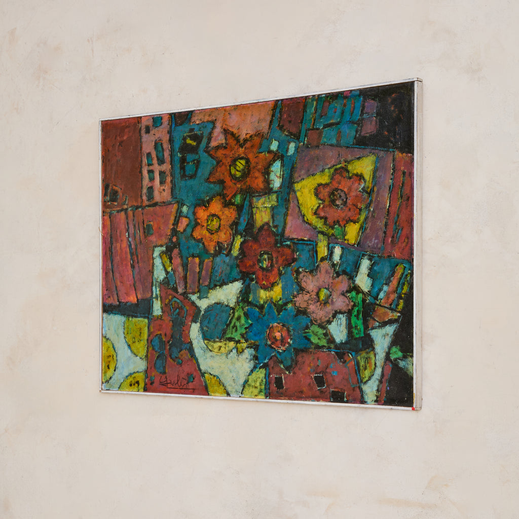 An original oil on canvas by French artist Georges Lévêque—who signed his work “Gerles” or “Gezlès”—painted in 1972. The composition layers post-cubist geometry with vivid, textured color blocks: saturated reds, ochres, blues, and greens rendered in a mosaic-like arrangement of florals. Signed lower left and countersigned and dated “72” on the reverse.