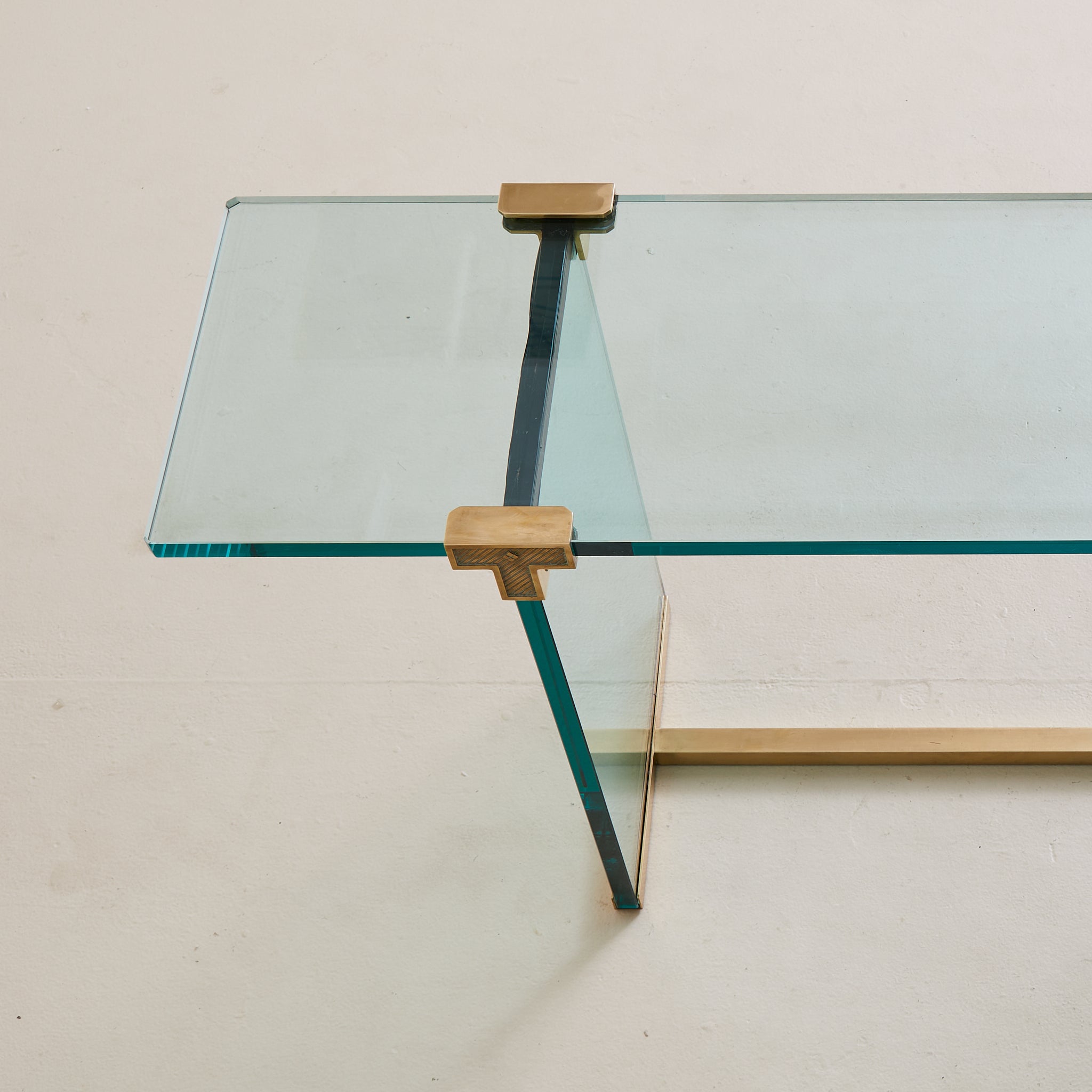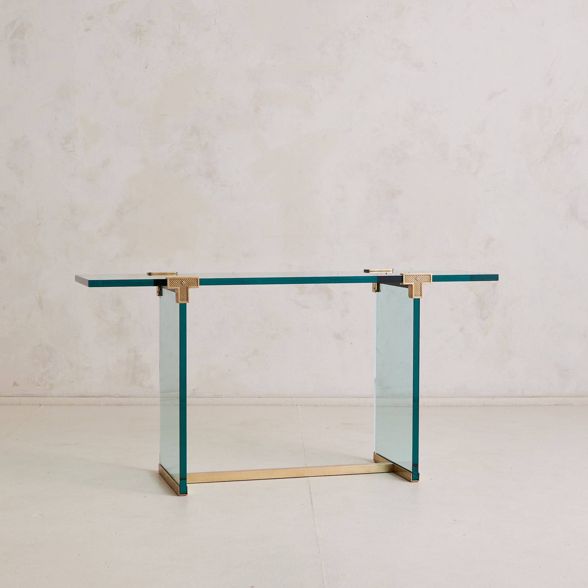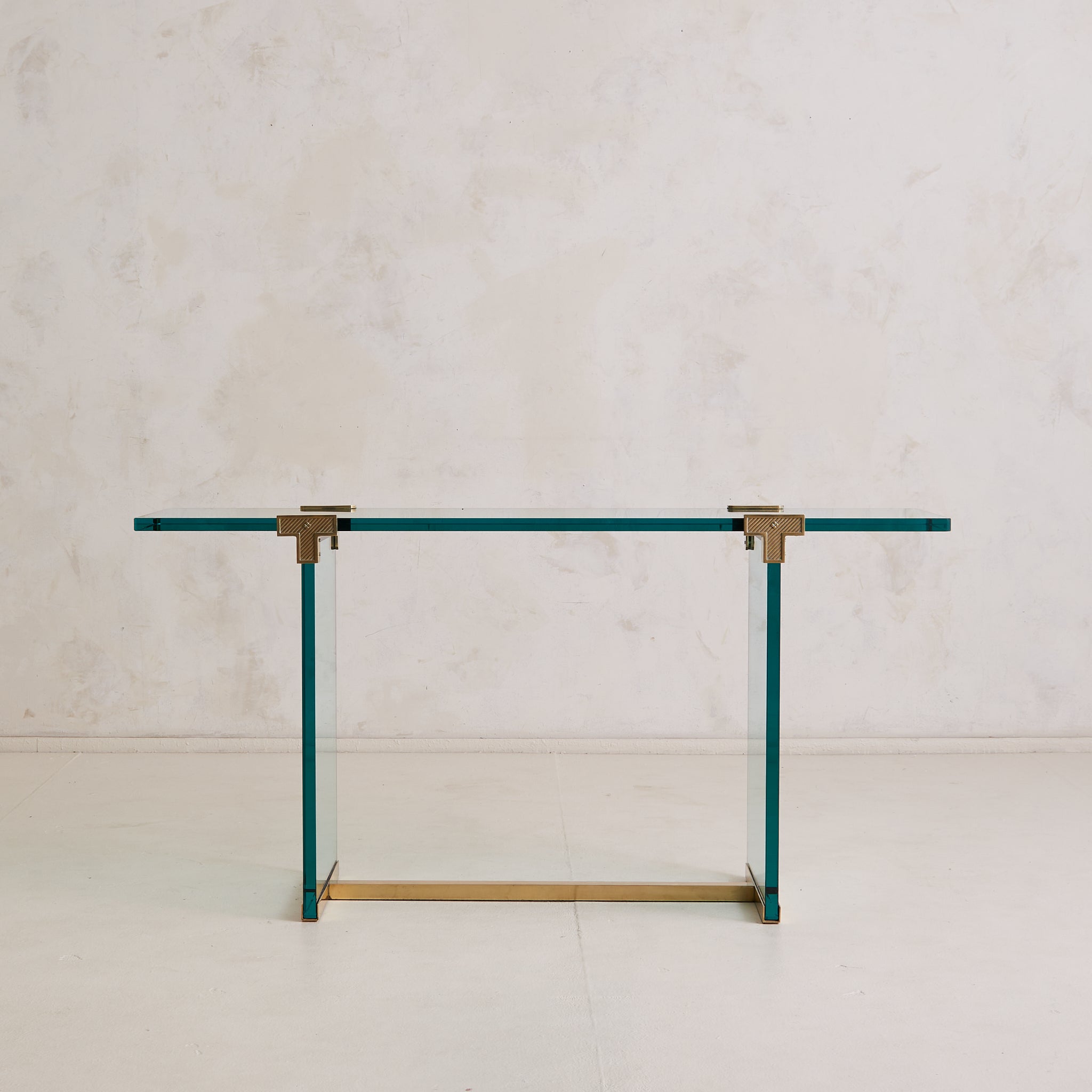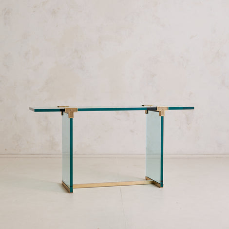 The 'T30' console by German designer Peter Ghyczy distills 1970s modernism to its purest form. Composed of rare triple-thick plate glass in a soft aquamarine tint, the table appears to hover—weightless and architectural—its top plane suspended between two sheer vertical slabs. At each joint, gilt brass brackets etched with diagonal grooves clasp the glass.