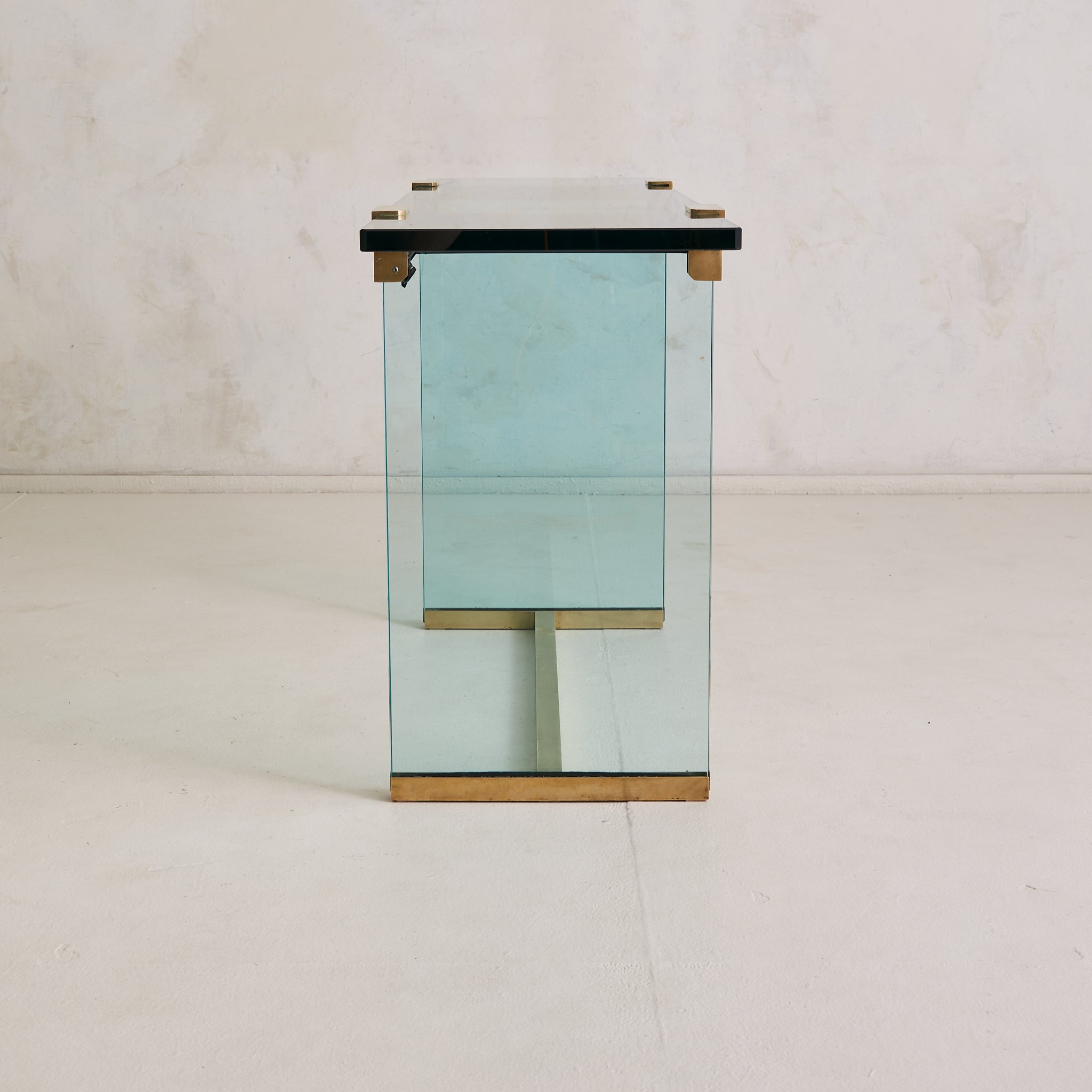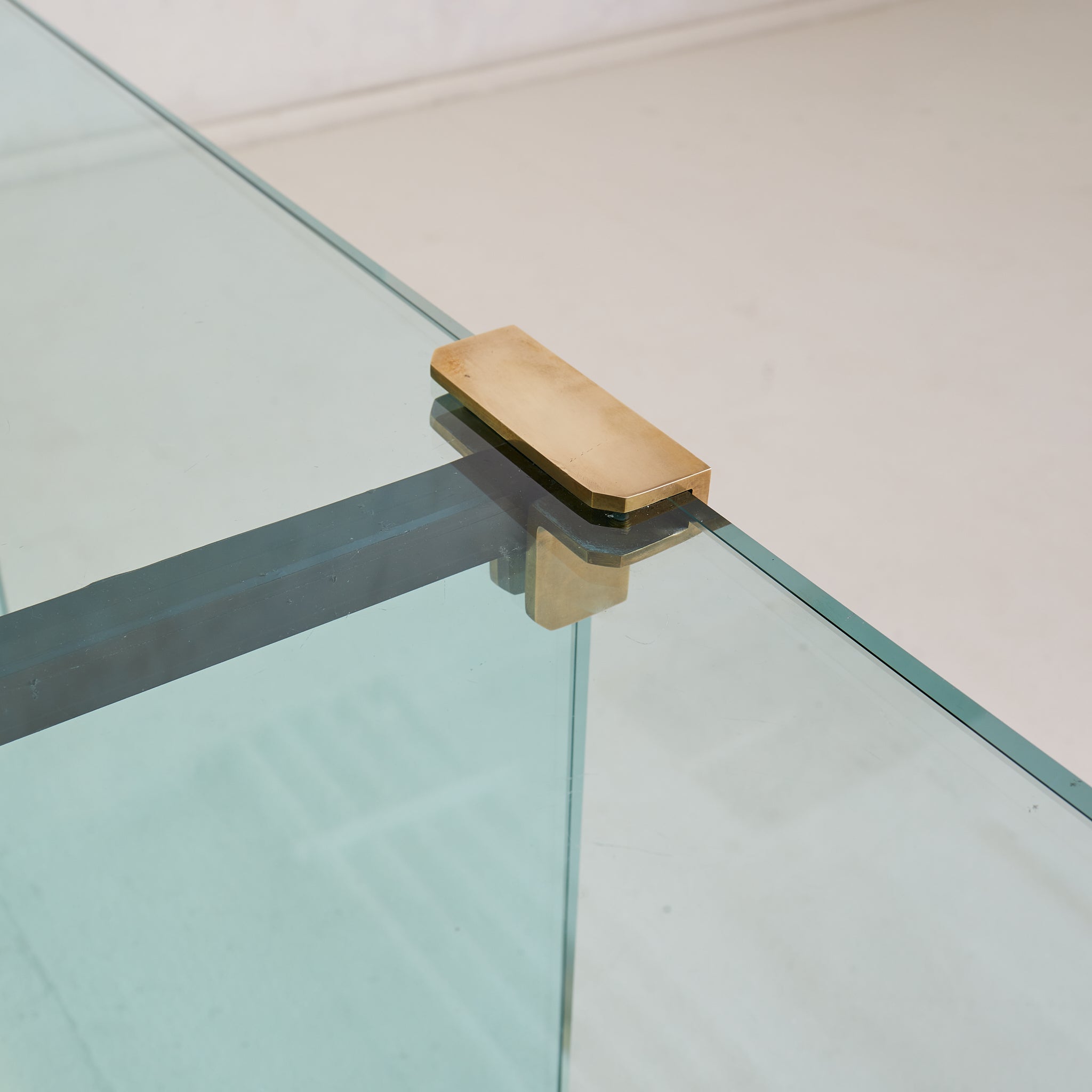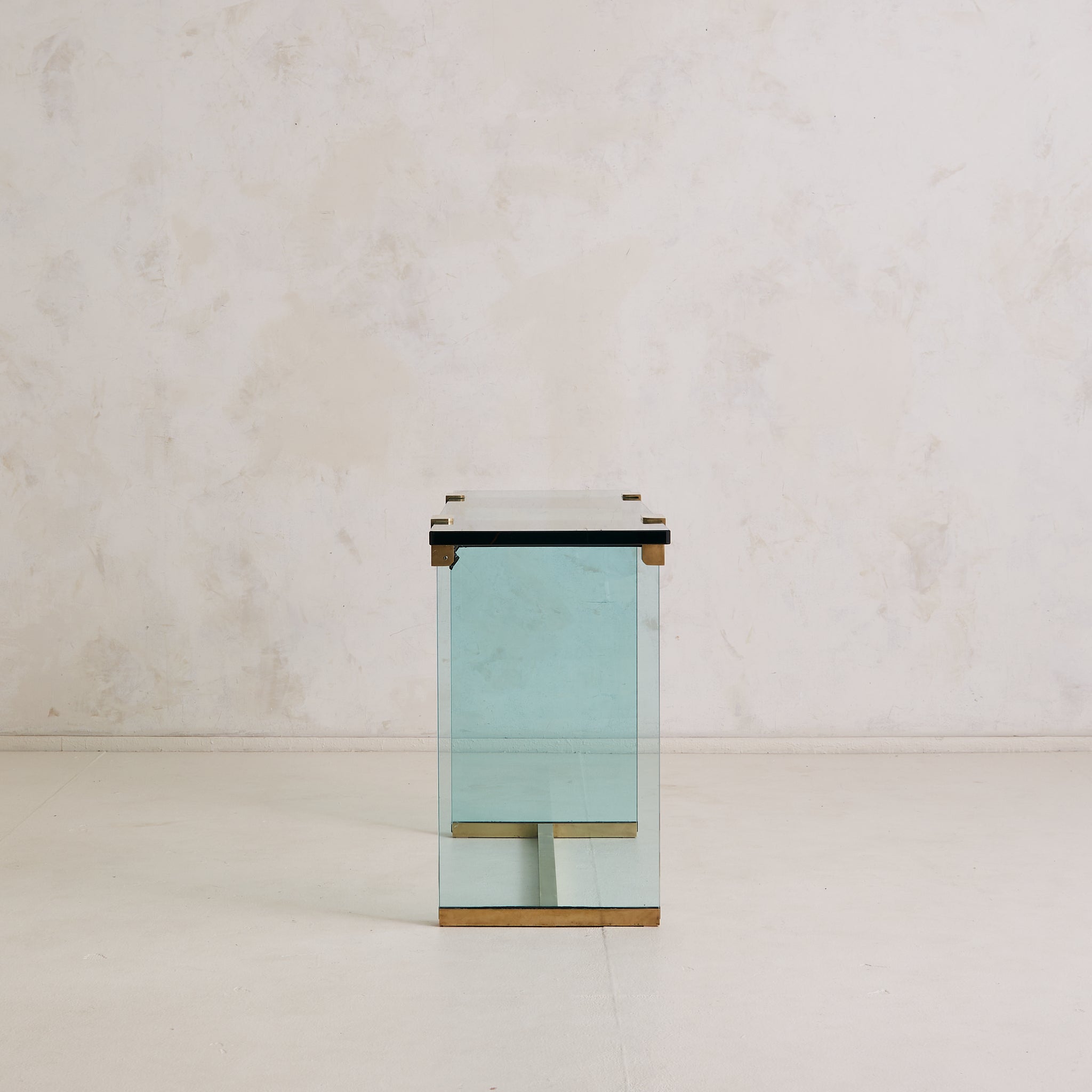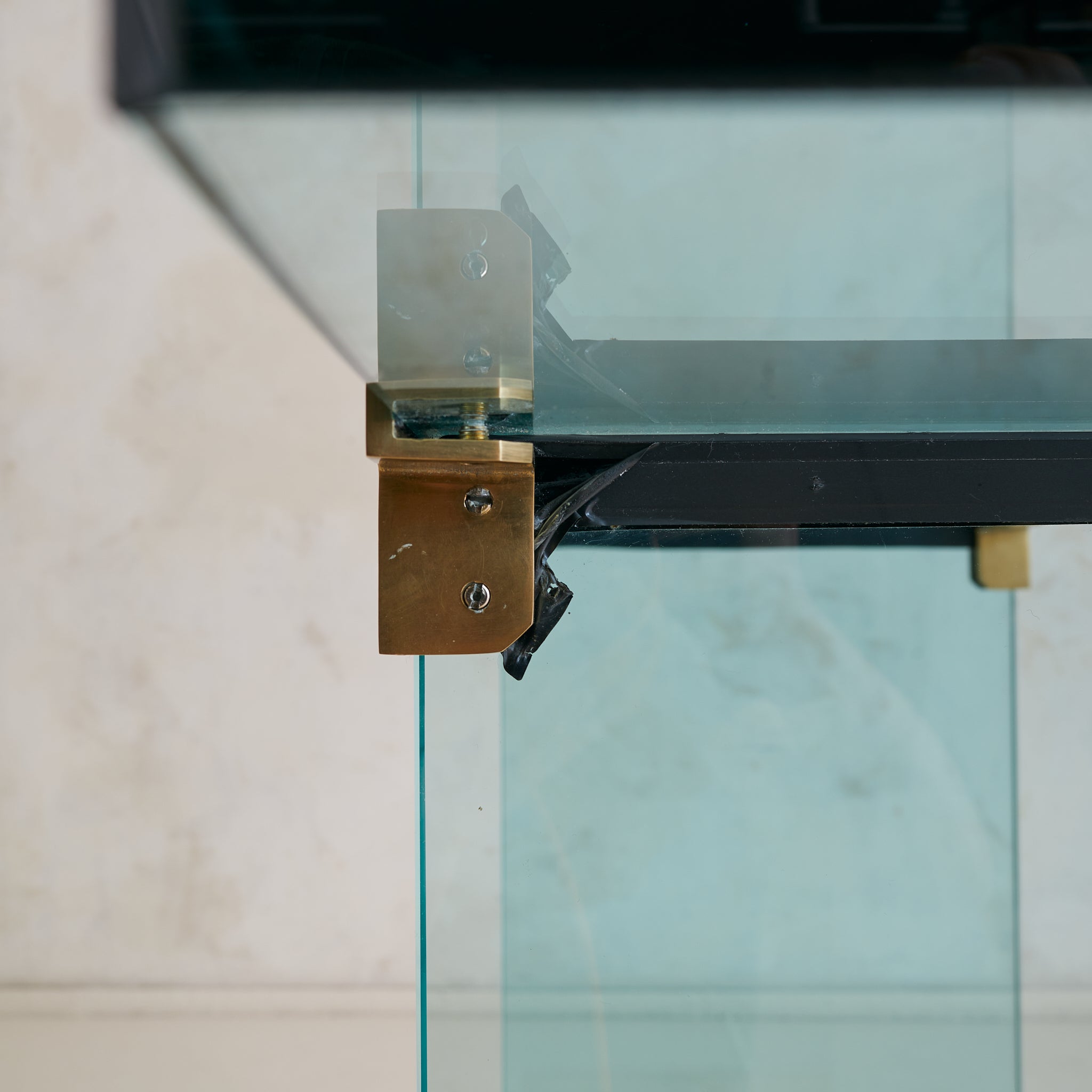 The 'T30' console by German designer Peter Ghyczy distills 1970s modernism to its purest form. Composed of rare triple-thick plate glass in a soft aquamarine tint, the table appears to hover—weightless and architectural—its top plane suspended between two sheer vertical slabs. At each joint, gilt brass brackets etched with diagonal grooves clasp the glass.
