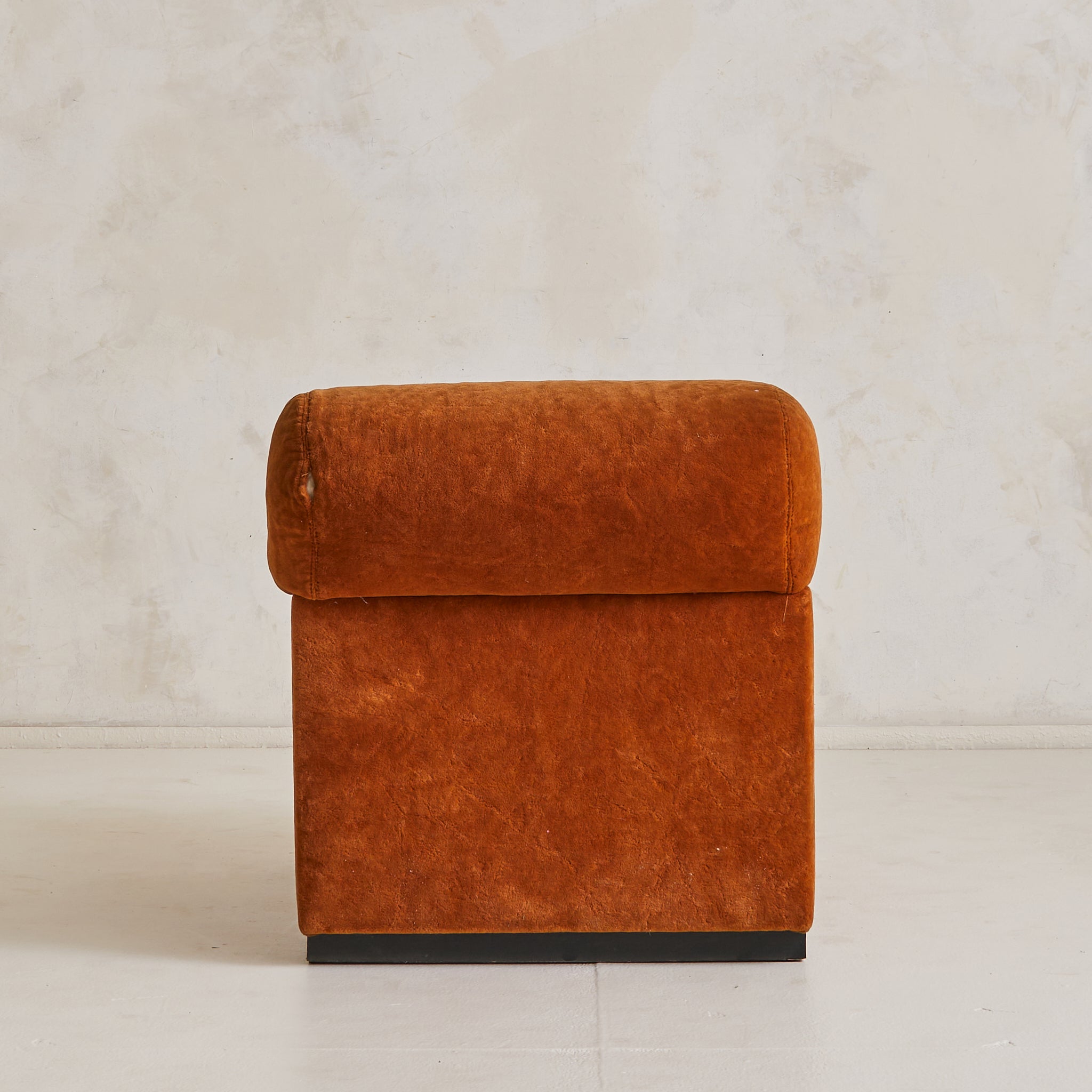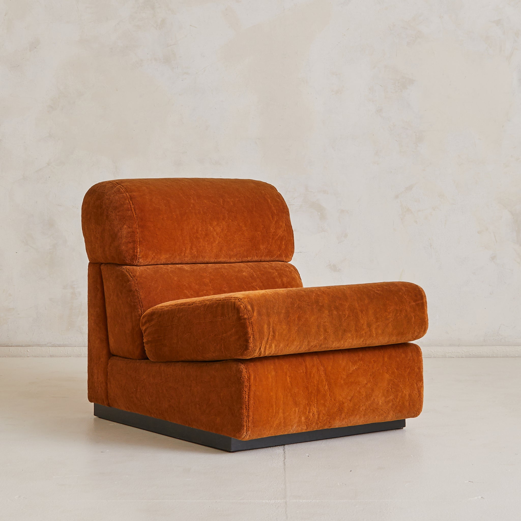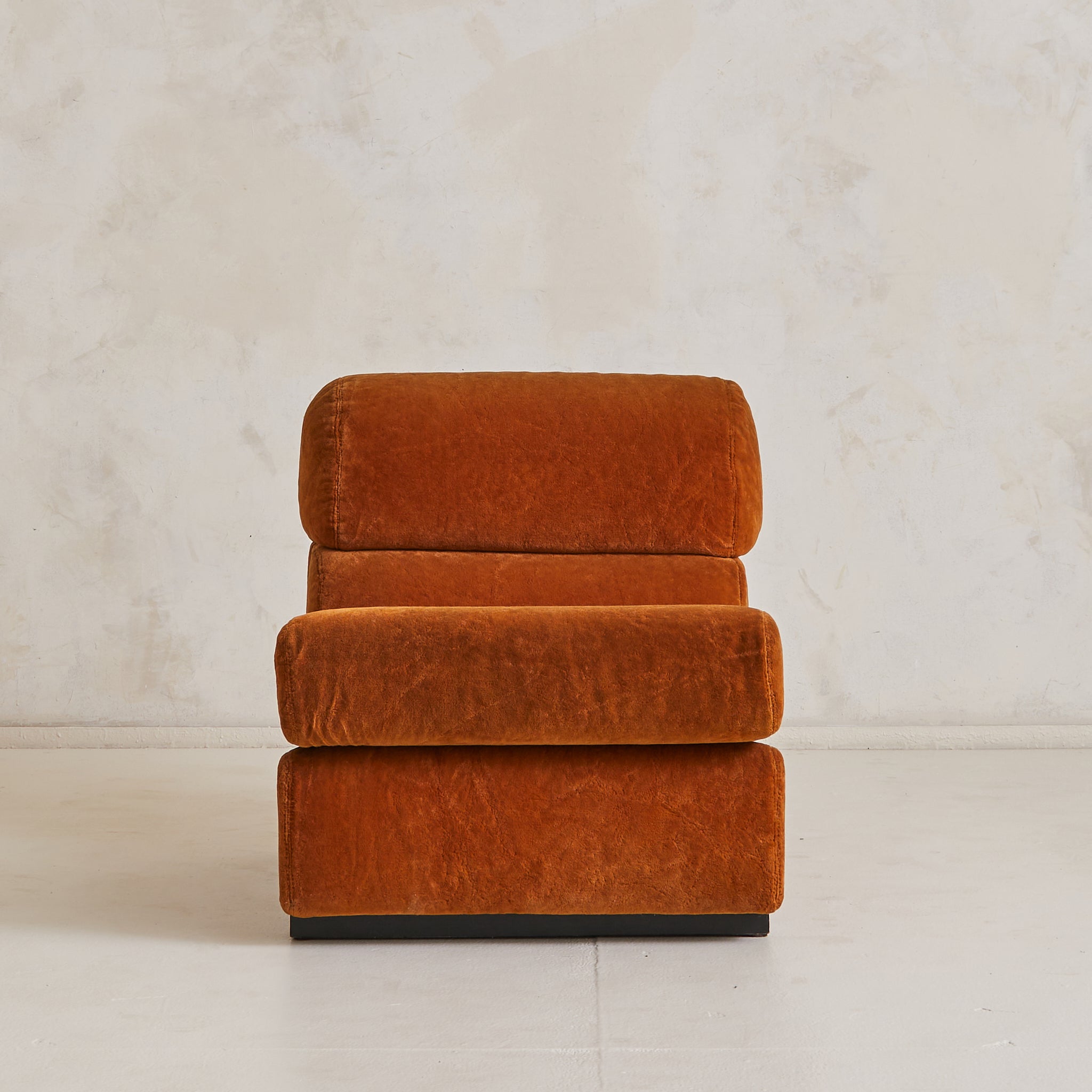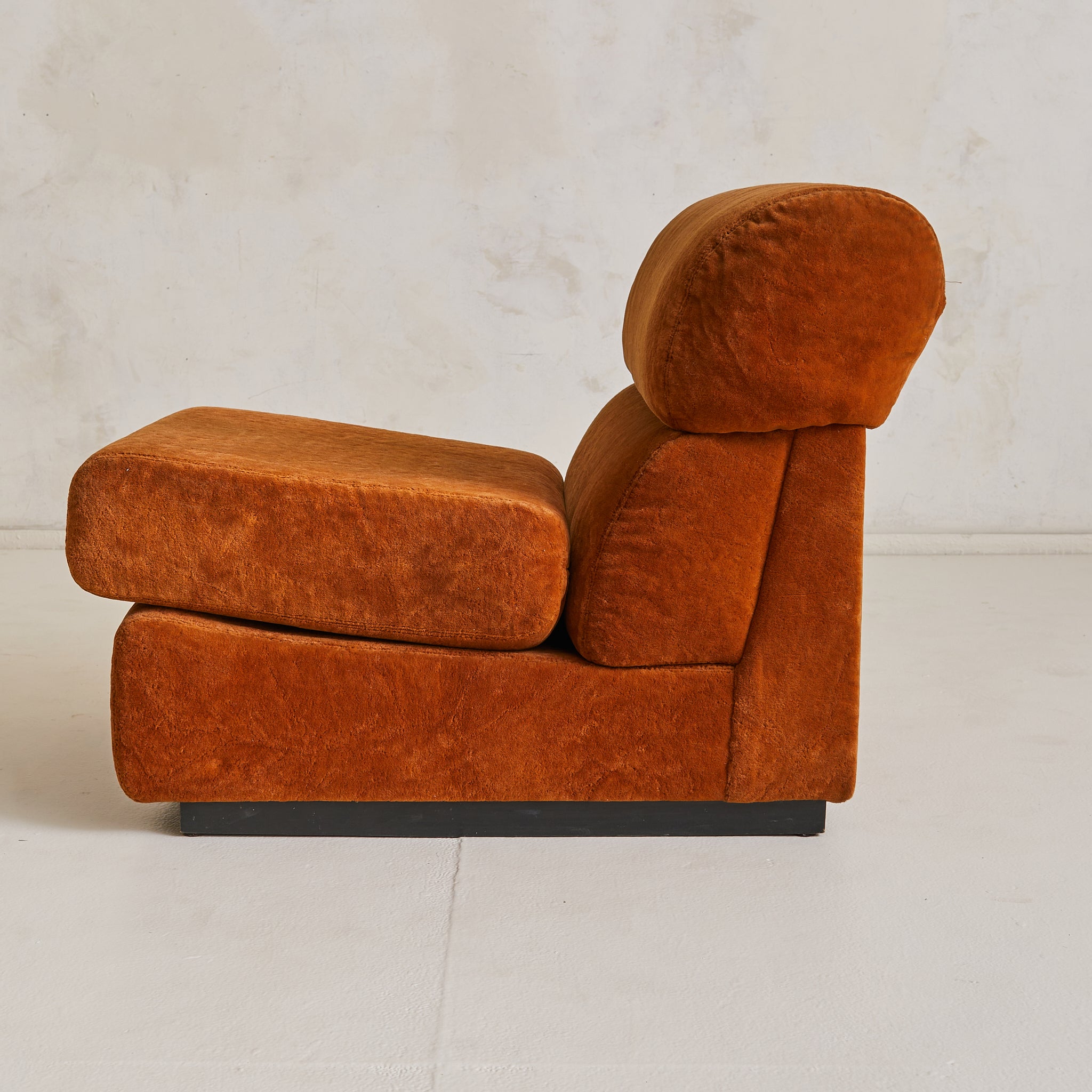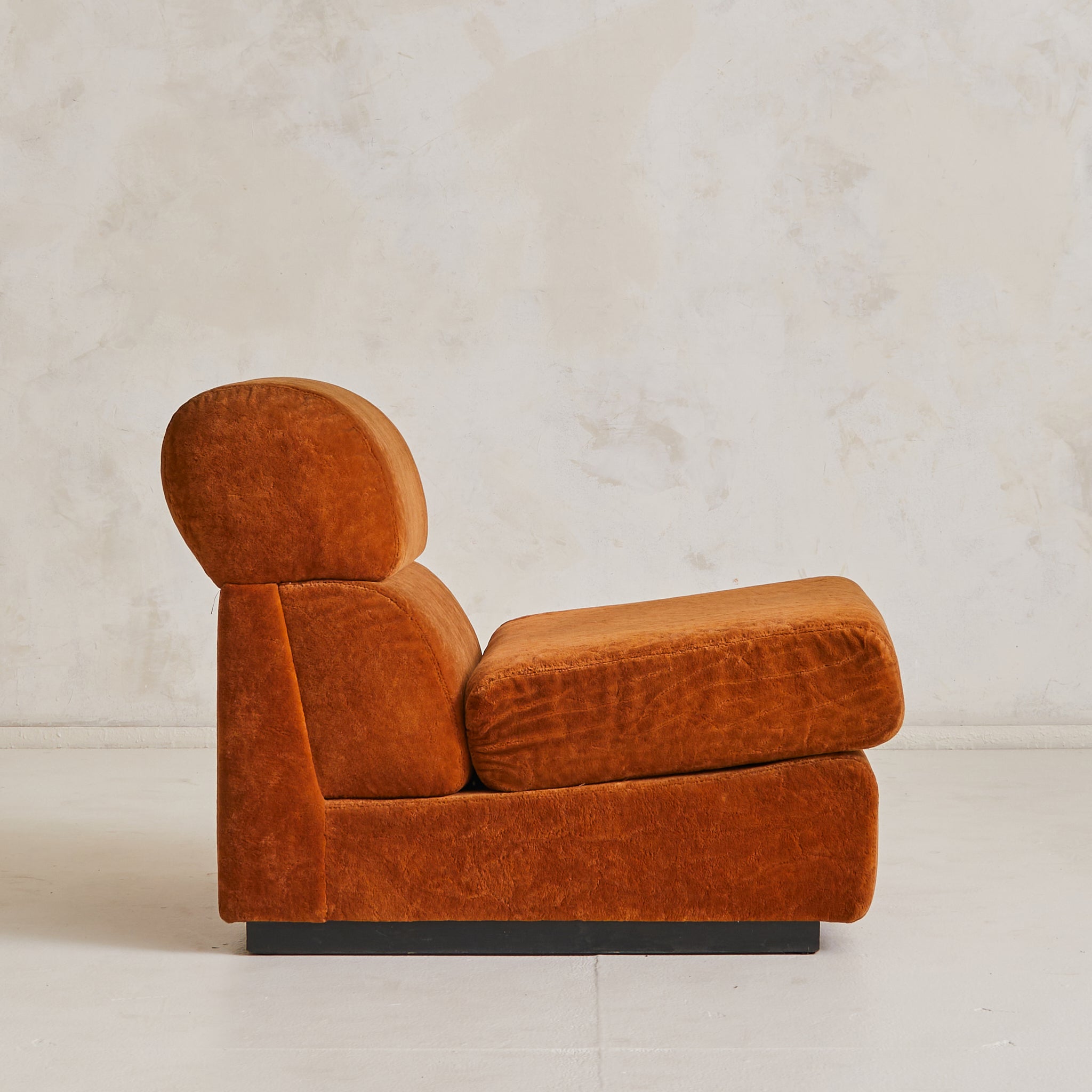 Upholstered in the original rust-hued textile, its armless profile and rounded back lend a sense of ease. A recessed black plinth base grounds the composition, giving it a weightless presence.