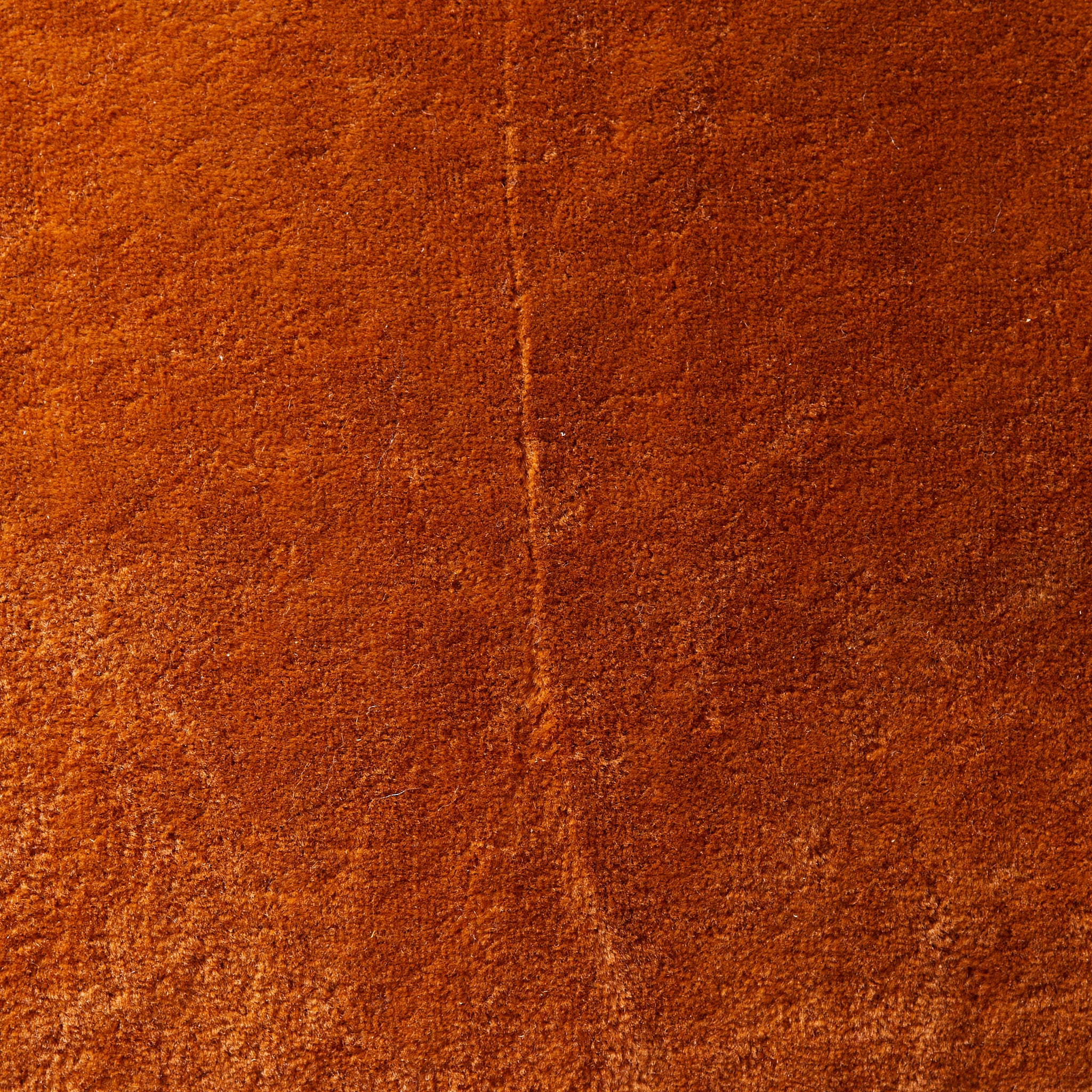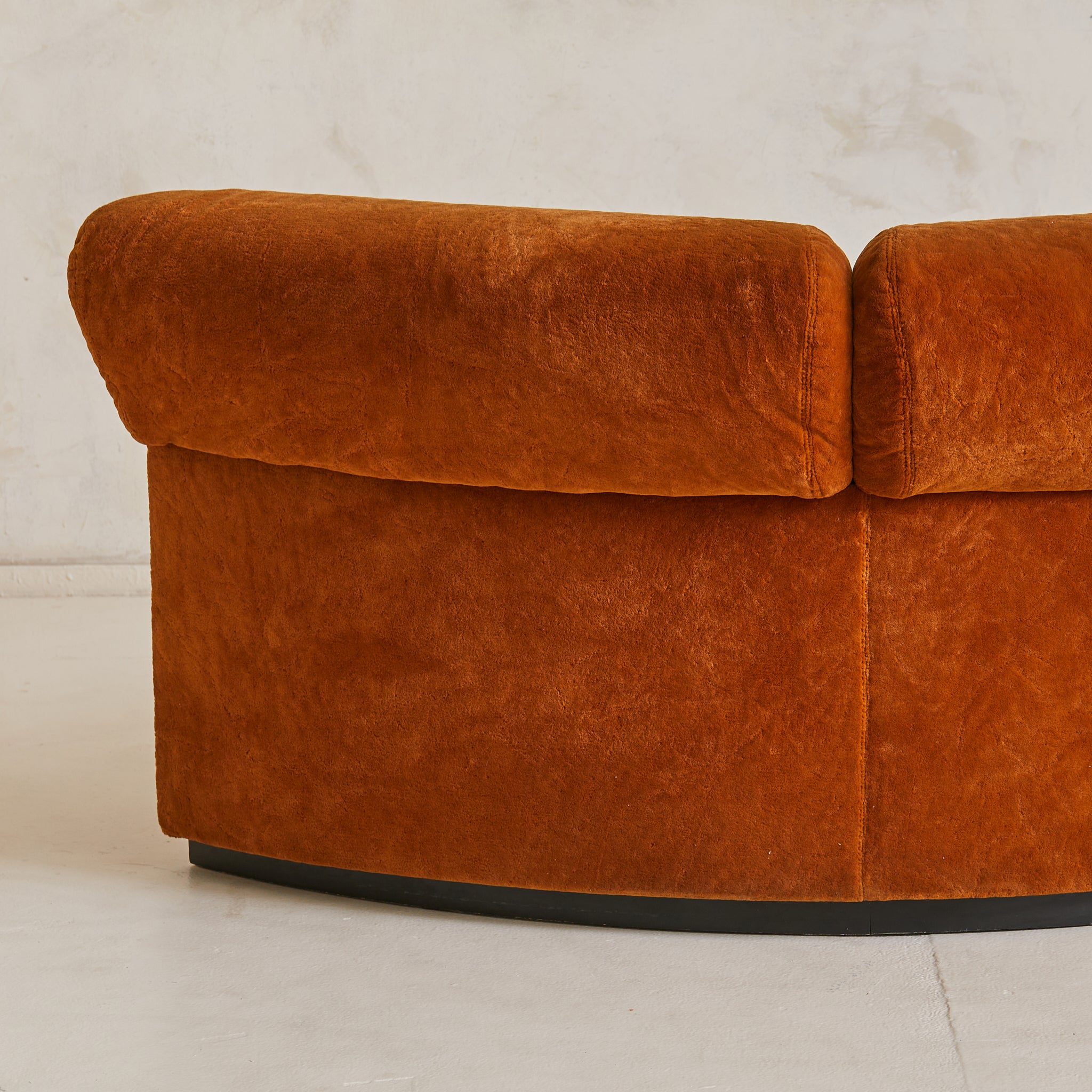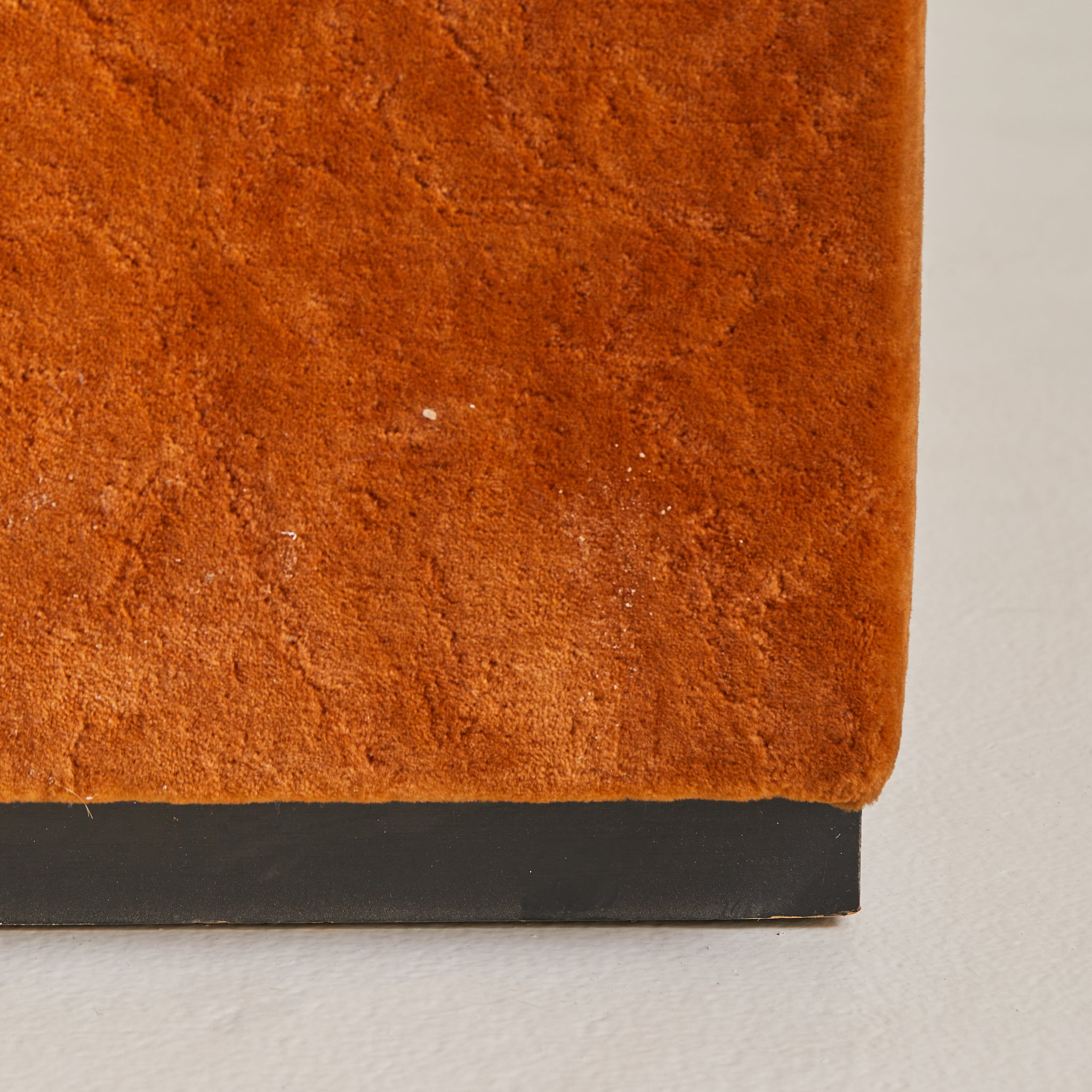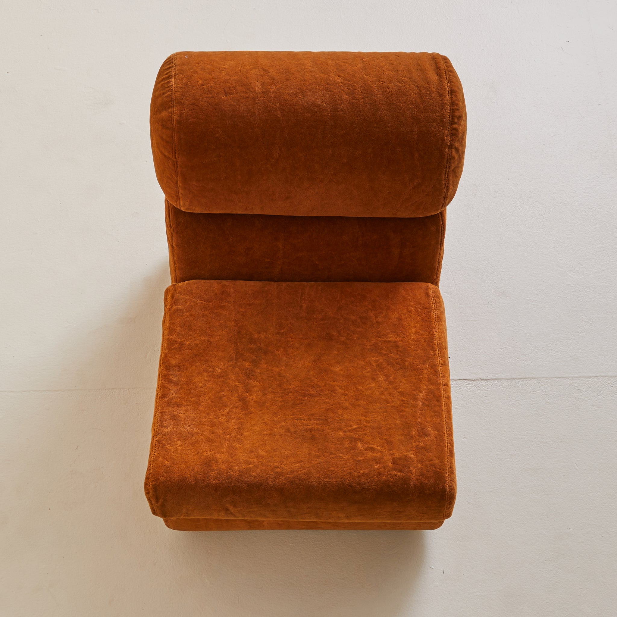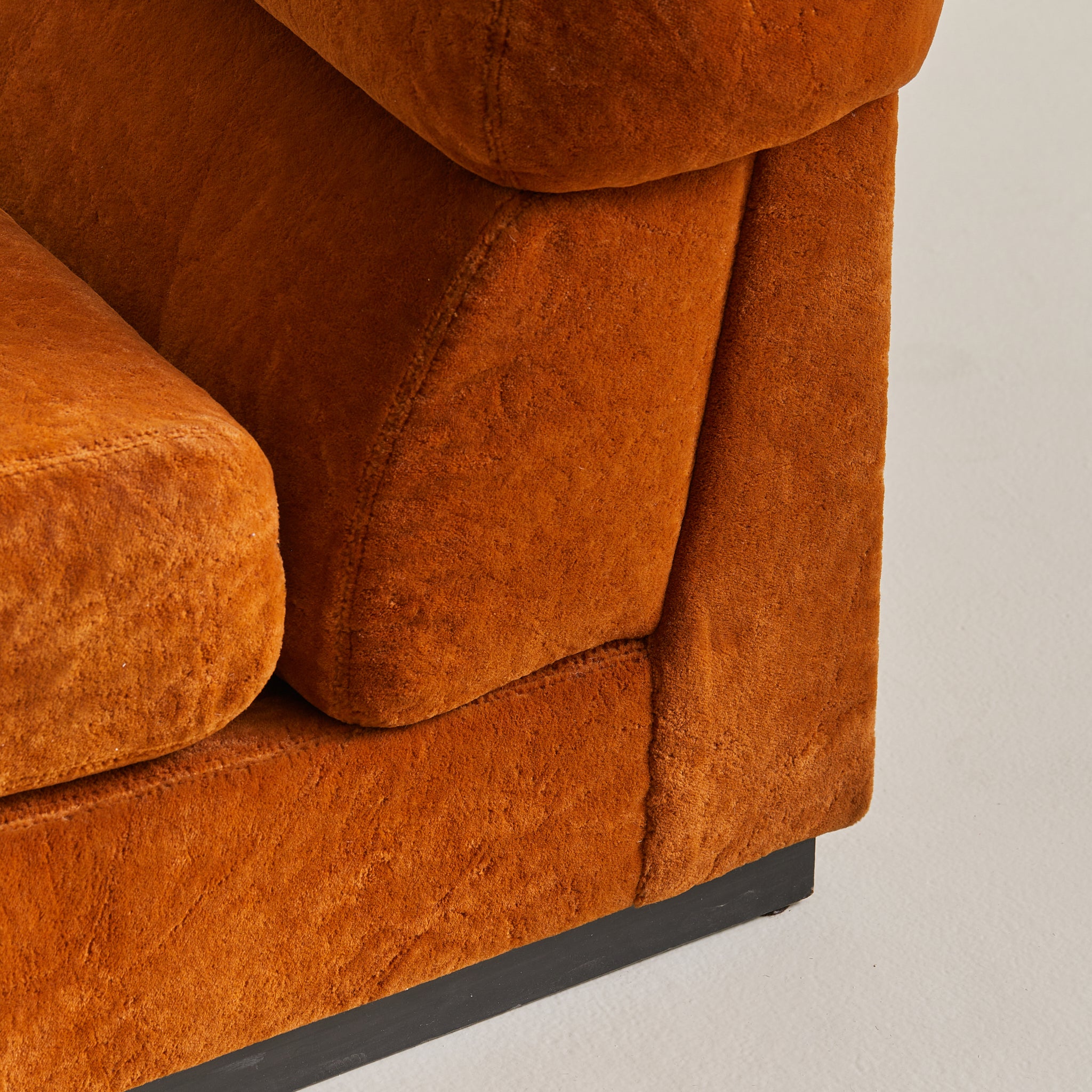 Upholstered in the original rust-hued textile, its armless profile and rounded back lend a sense of ease. A recessed black plinth base grounds the composition, giving it a weightless presence.