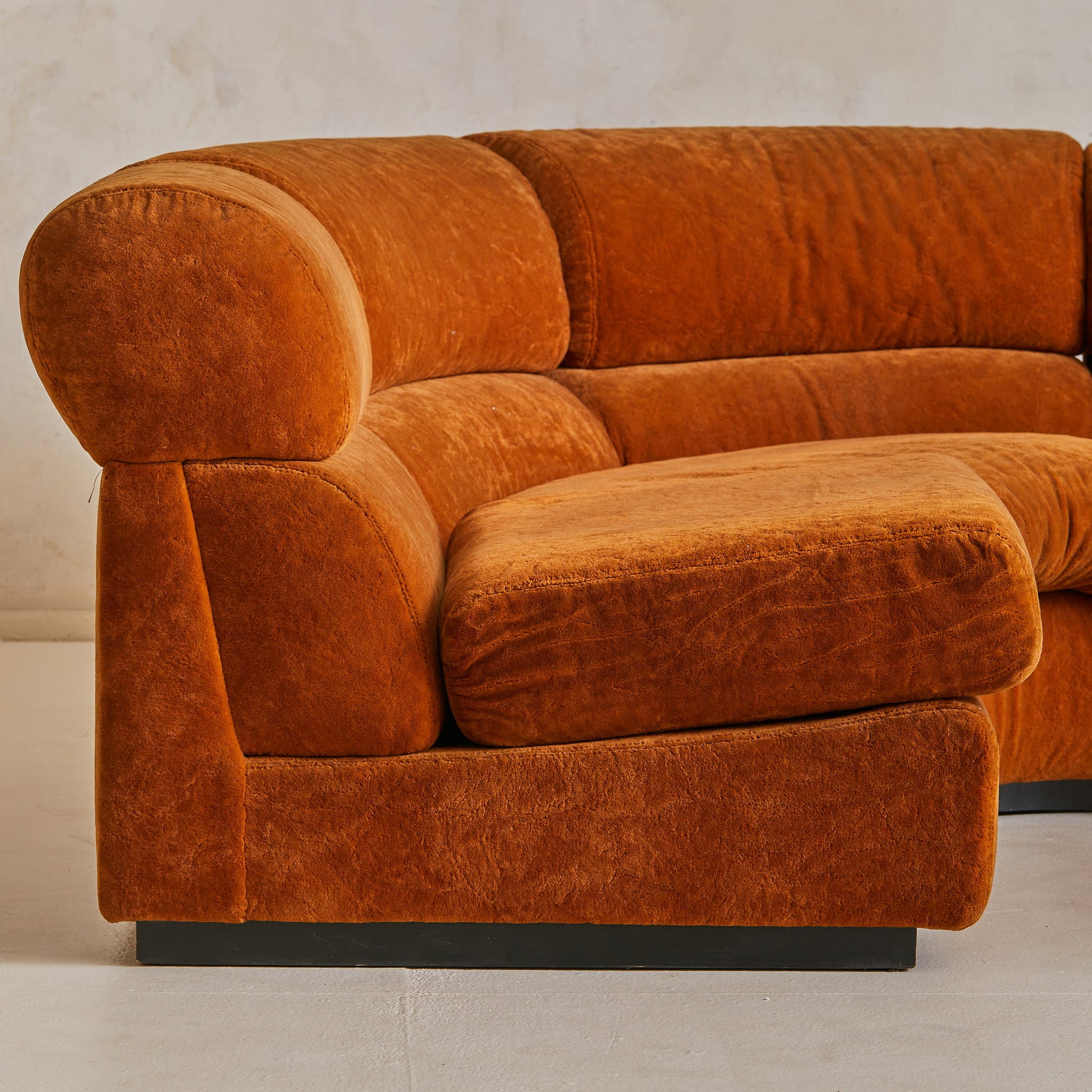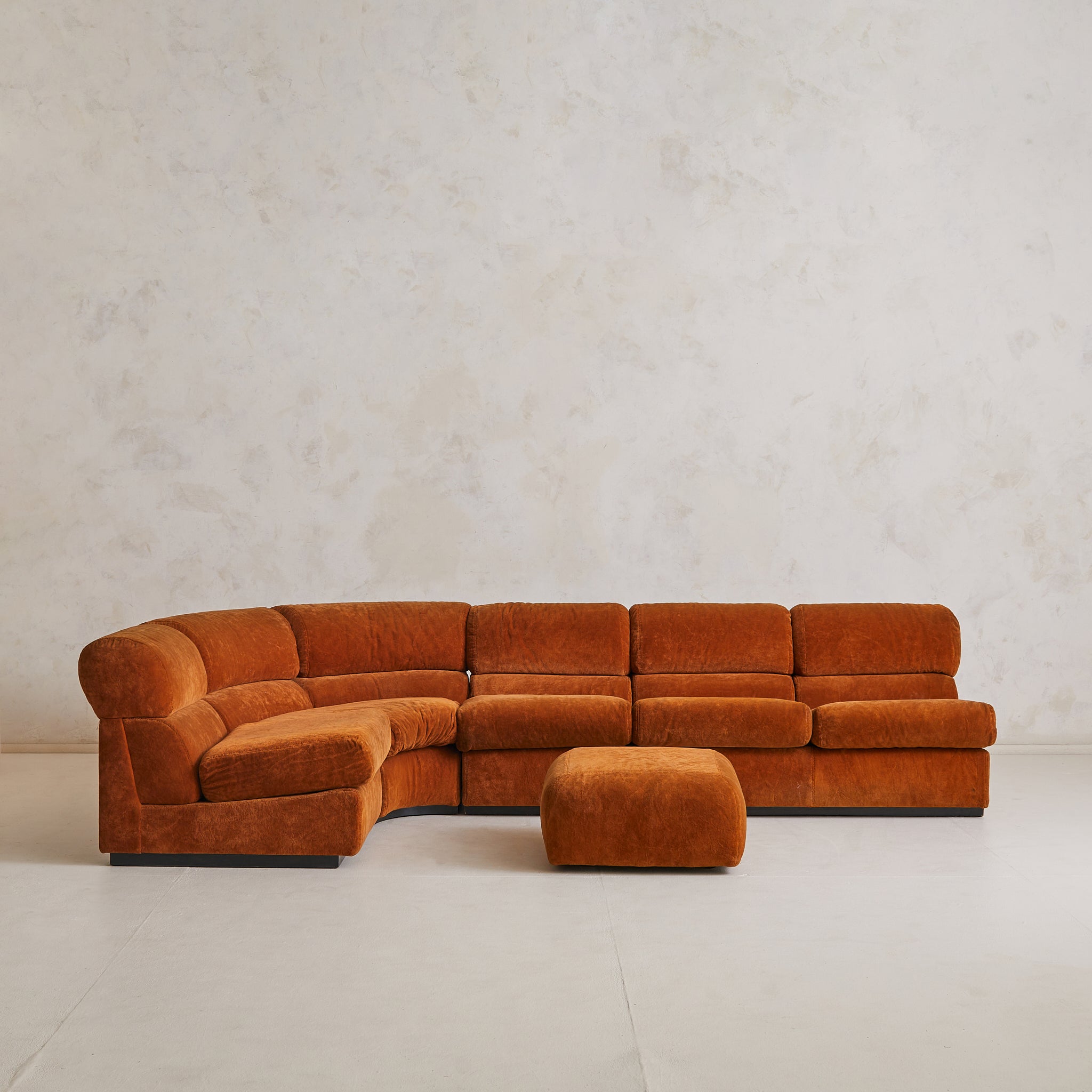 A sculptural Italian sectional from the 1970s, composed of two armless sofas, a curved corner seat, lounge chair, and ottoman. The plush, low-slung silhouette invites relaxation—each cushion generously scaled, each form stacked and softly contoured to embrace the body.