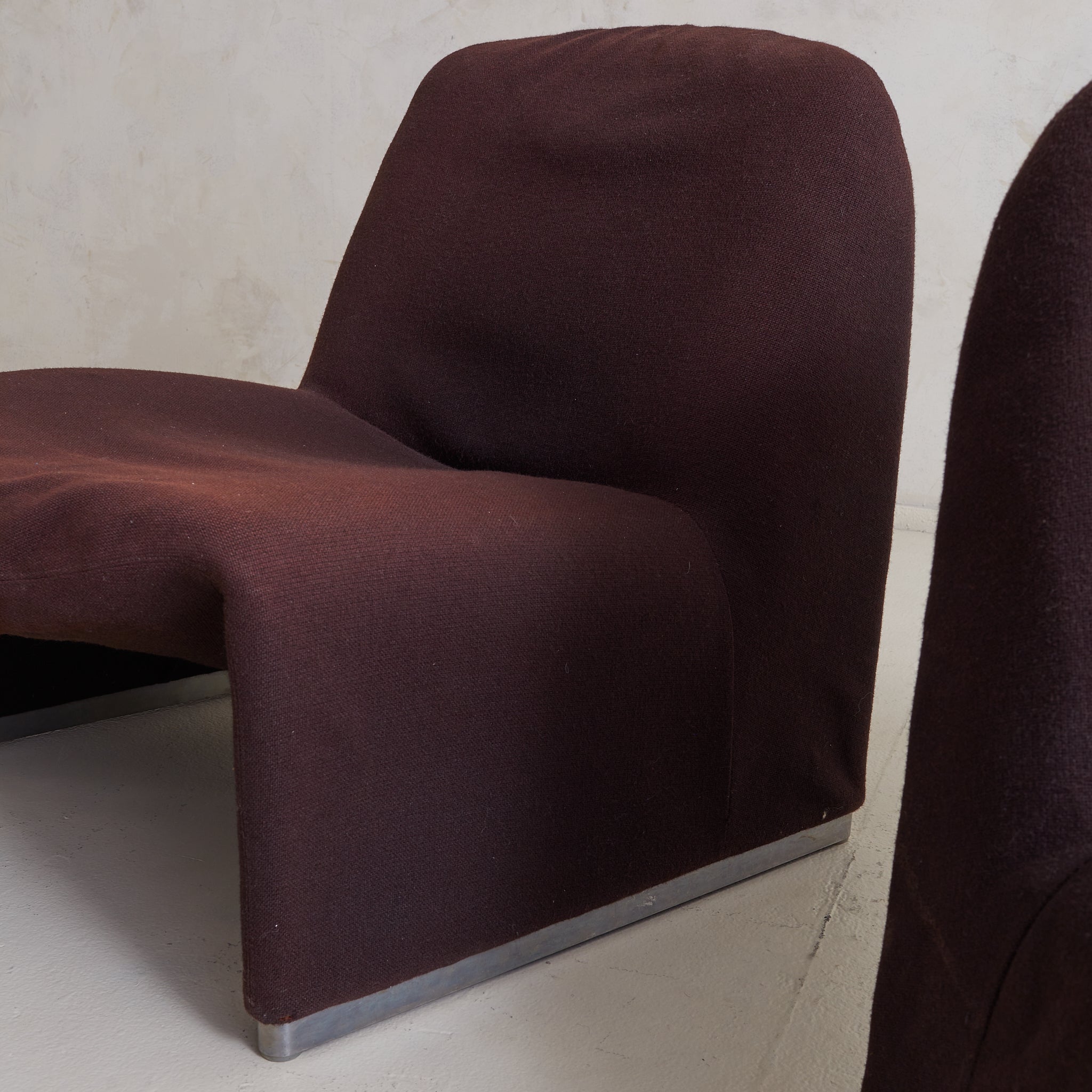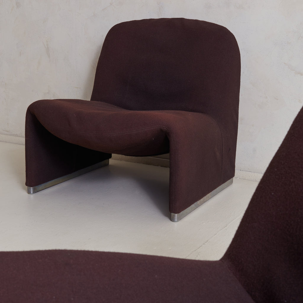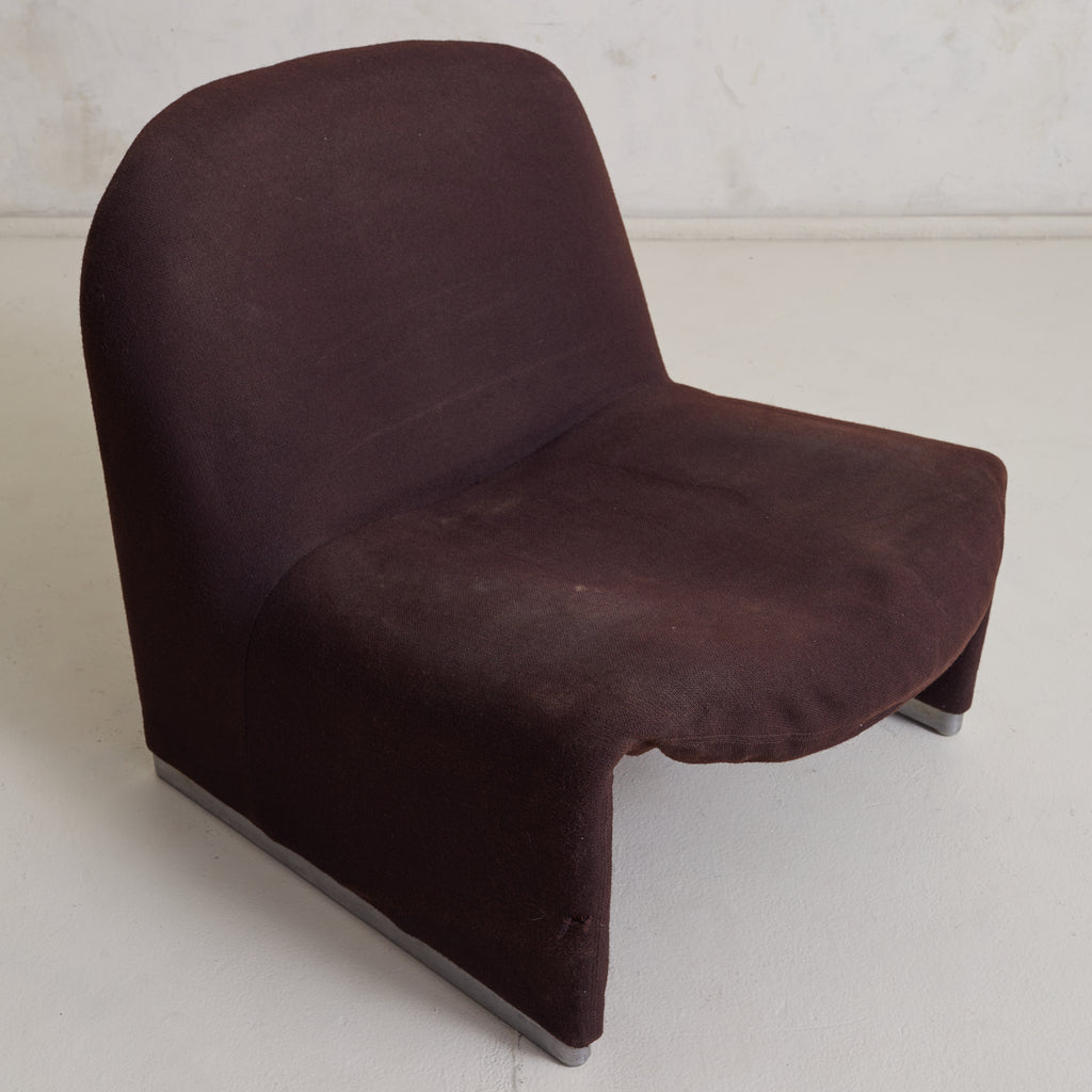 An Italian ‘Alky’ chair designed by Giancarlo Piretti for Castelli in 1969. The sculptural, modern design was exhibited with the Piretti Collection at NeoCon in 1988. This chair retains its original brown upholstery and features an aluminum footed base with plastic gliders. This piece looks amazing from every angle and floats beautifully in a seating area. It’s versatile, comfortable, and a fantastic size.