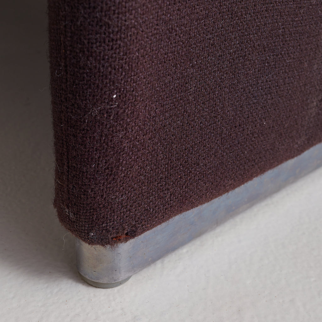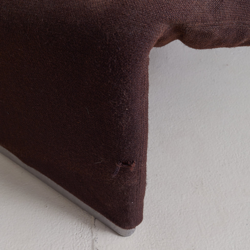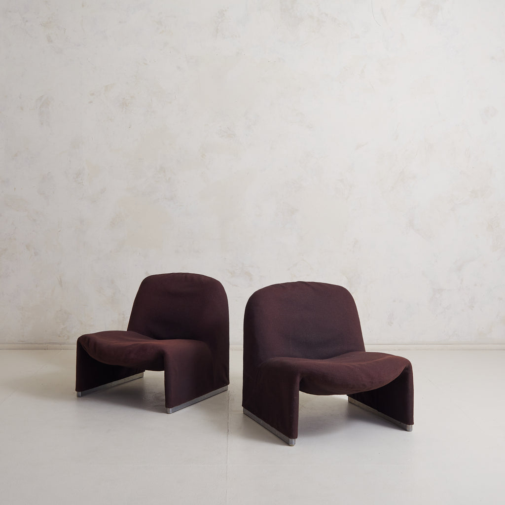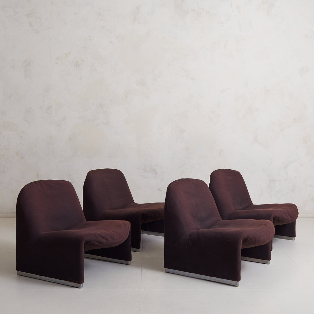 An Italian ‘Alky’ chair designed by Giancarlo Piretti for Castelli in 1969. The sculptural, modern design was exhibited with the Piretti Collection at NeoCon in 1988. This chair retains its original brown upholstery and features an aluminum footed base with plastic gliders. This piece looks amazing from every angle and floats beautifully in a seating area. It’s versatile, comfortable, and a fantastic size.