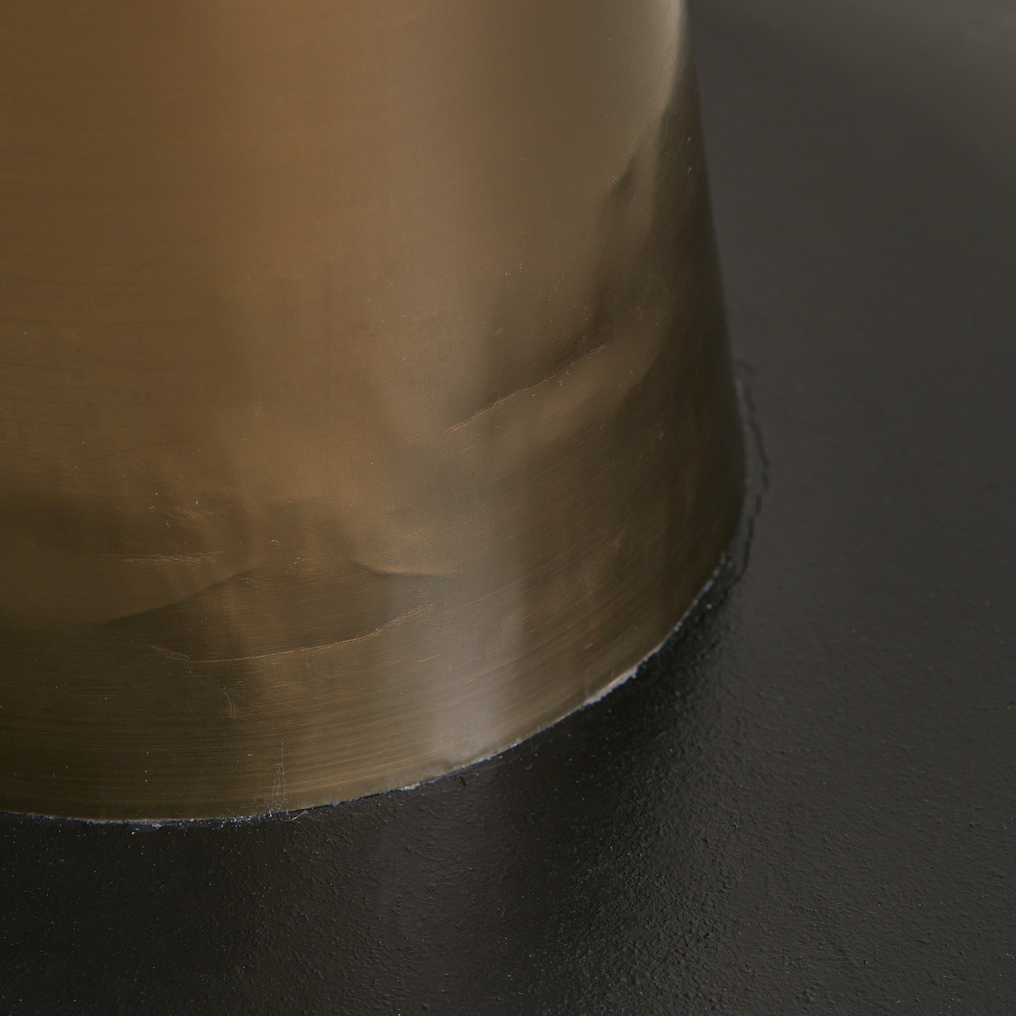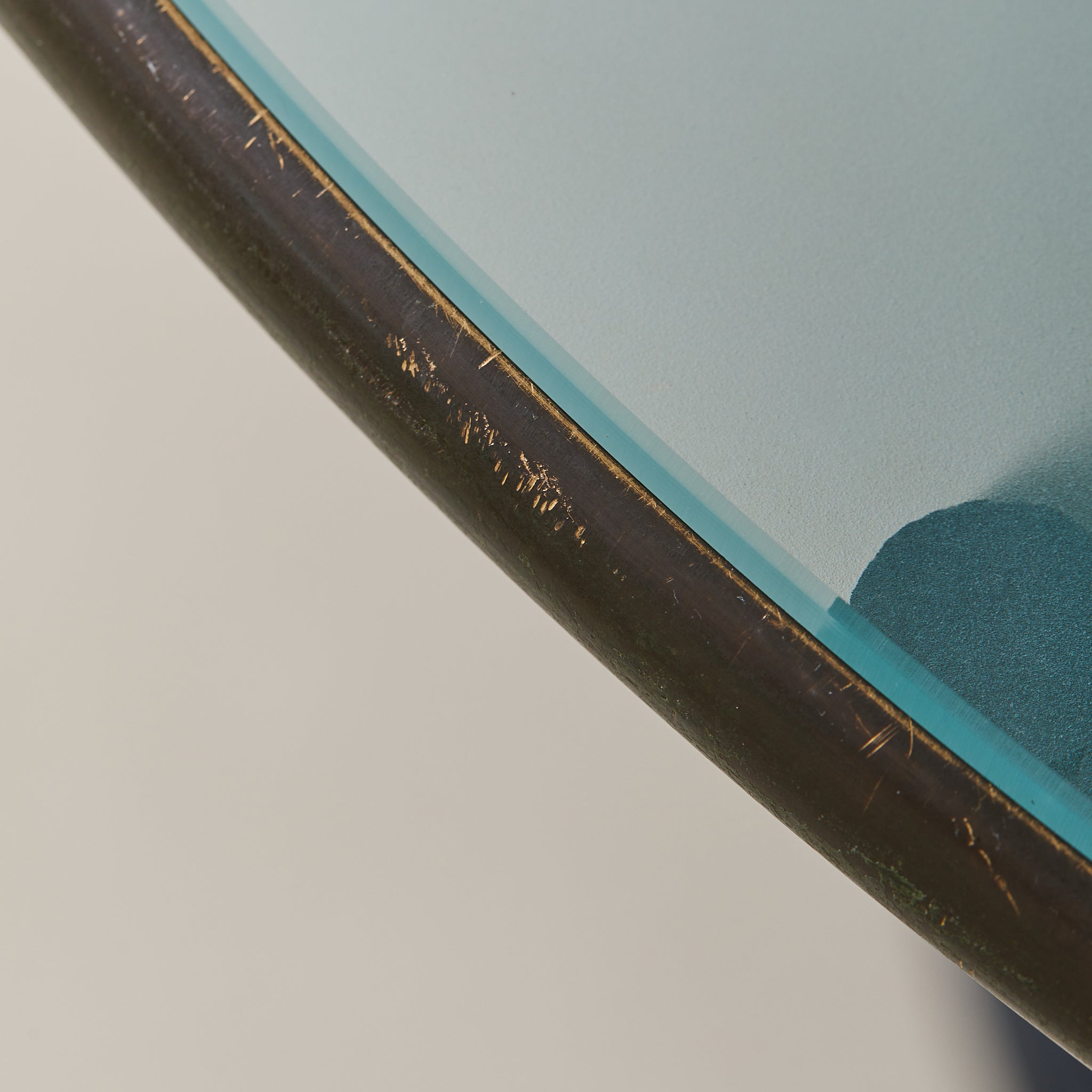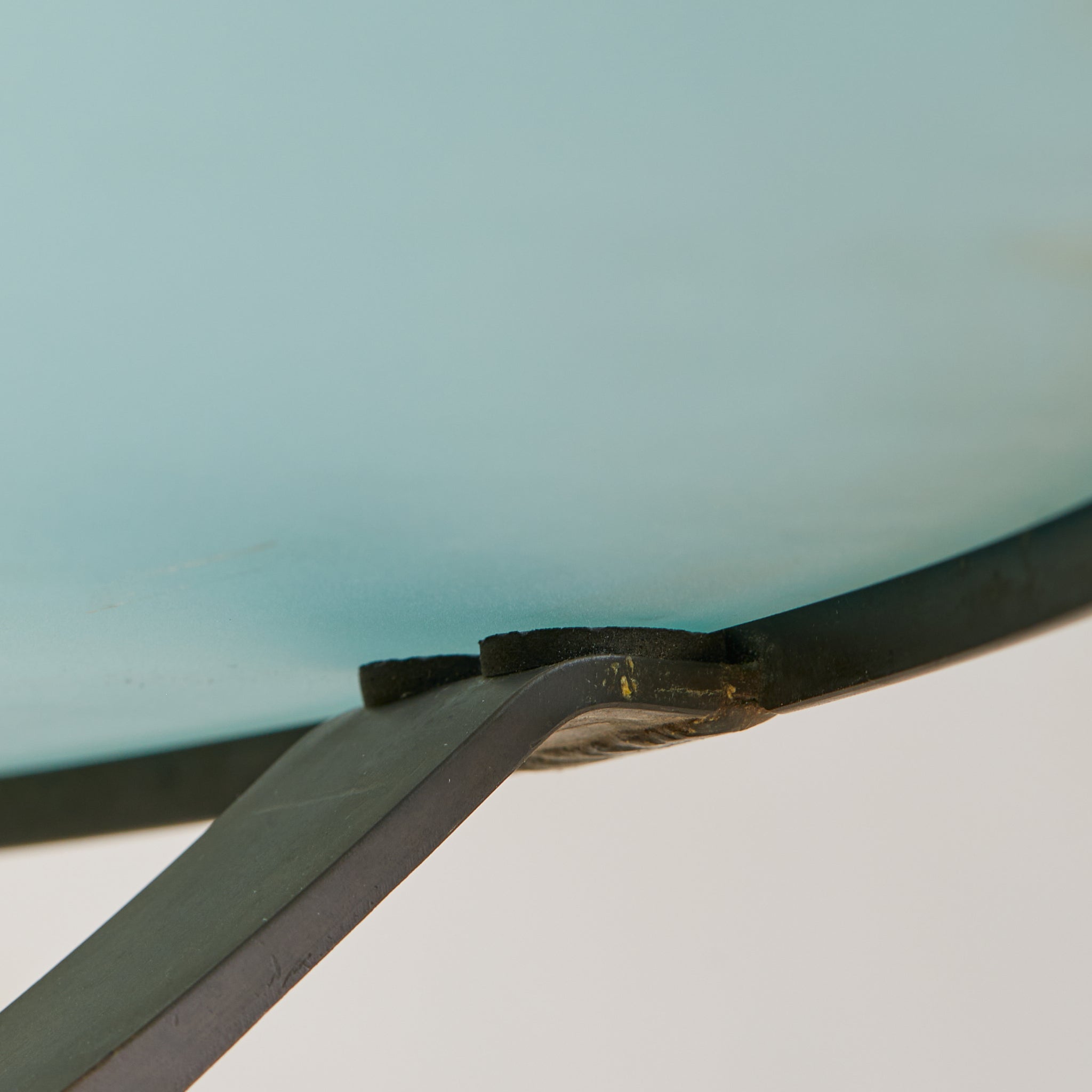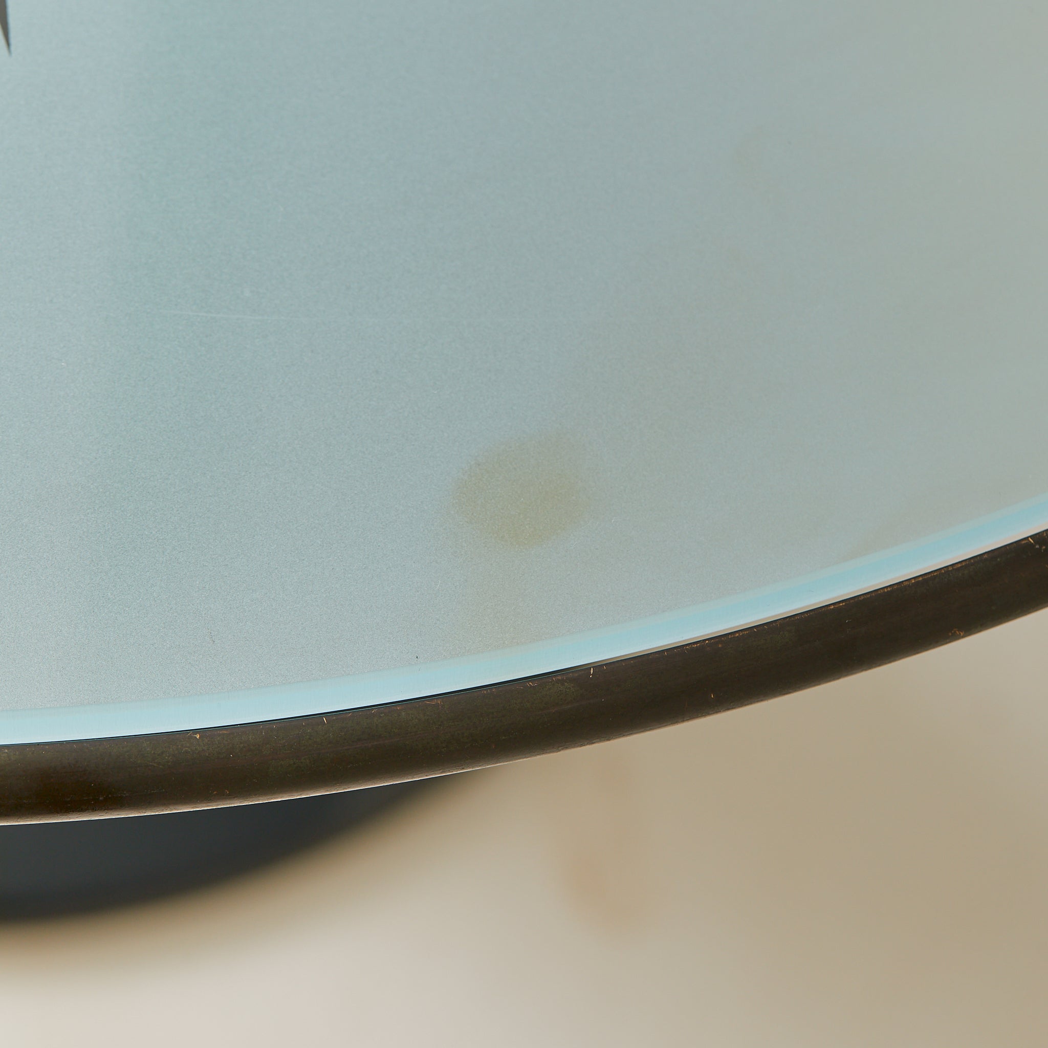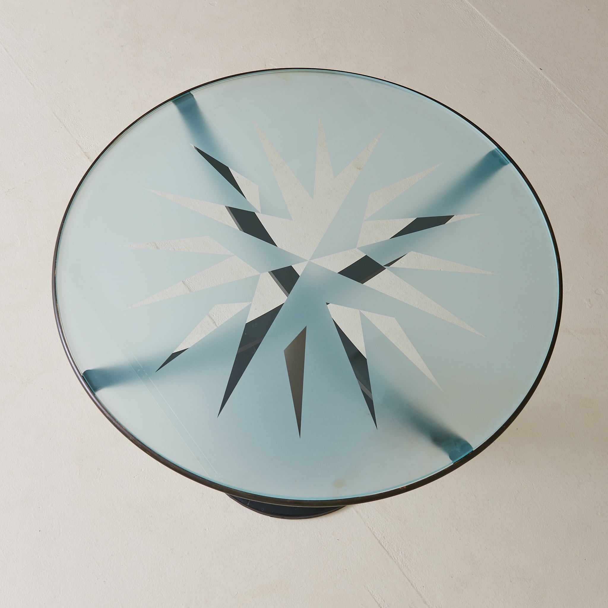 The top, nearly three feet in diameter, is made from frosted glass, etched with a compass-like starburst. Style it as a center table in a sculptural entryway moment or as an oversized side table—its form a focal point, like an object pulled from orbit.
