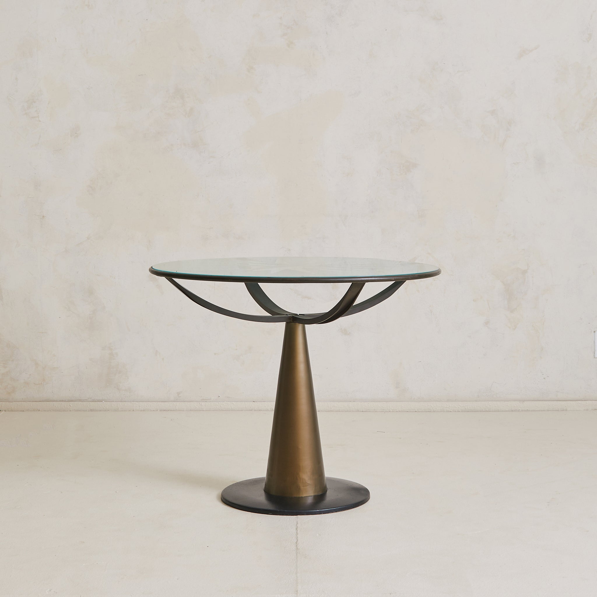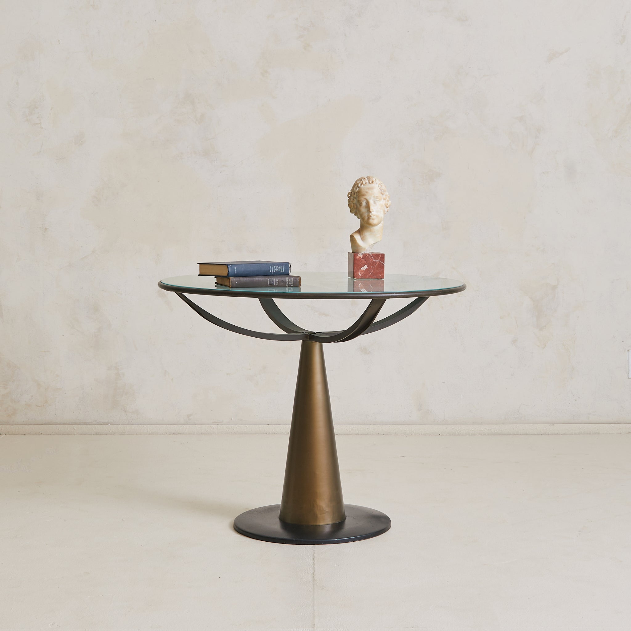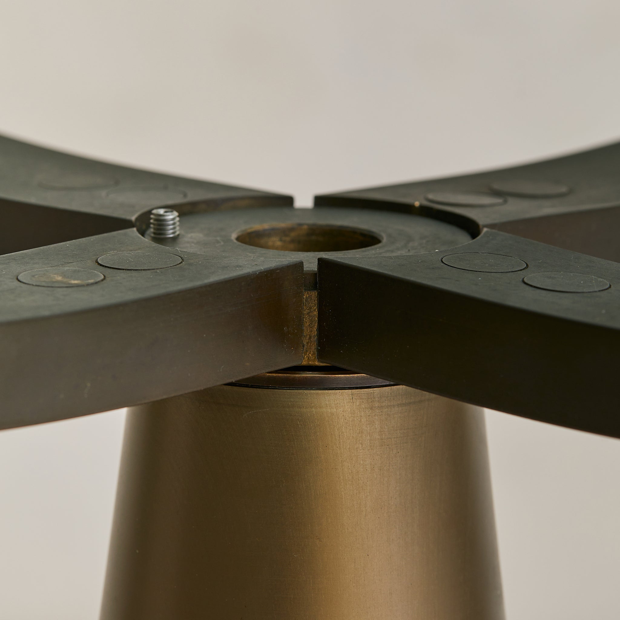 The ‘Astrolabio’ table was designed in 1988 by Spanish architect Oscar Tusquets and manufactured in Italy for Aleph-Driade. Named after the ancient astronomical instrument, the piece pairs science and sculpture—anchored by four bronze-finished aluminum arms that arc beneath a conical pedestal base.