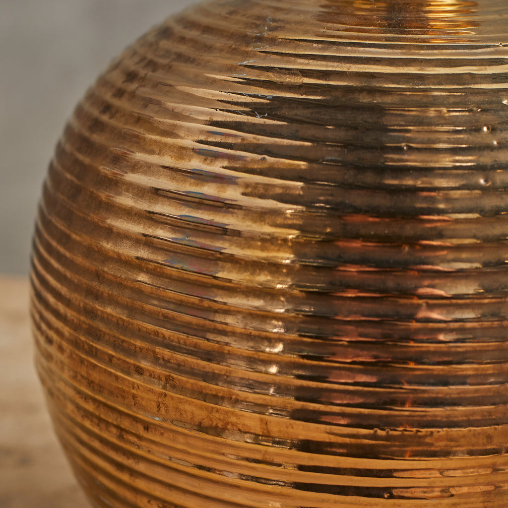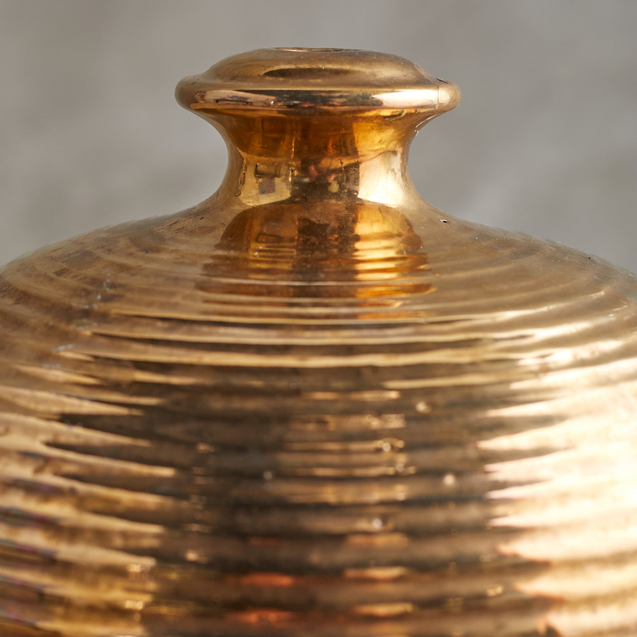 An Italian ceramic vase, attributed to Bitossi, dating back to the 1960s. This piece features a flared lip, short neck, and rounded body. Crafted from clay, the surface is accented with ribbed bands and finished in a metallic gold glaze, adding rich texture. Unmarked.